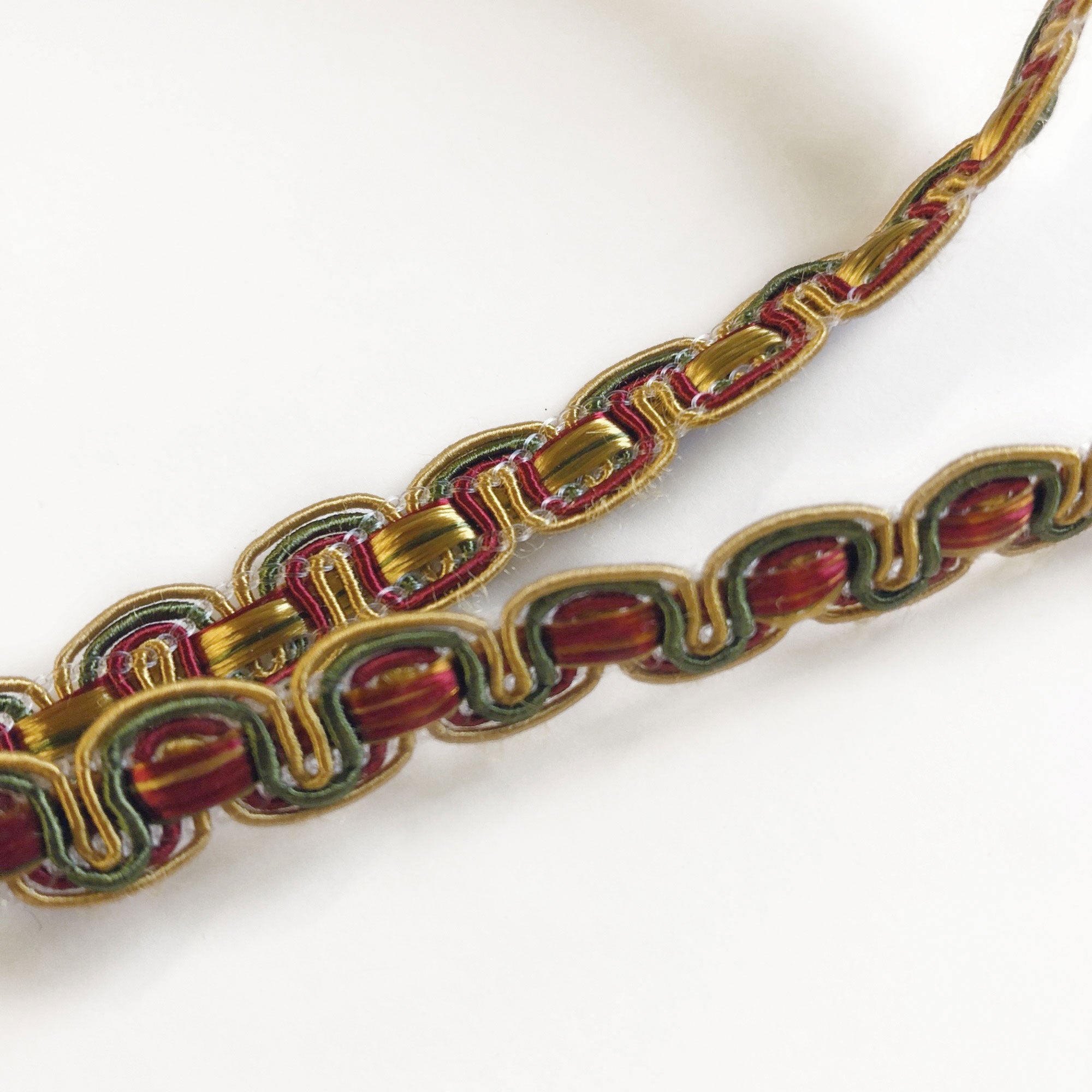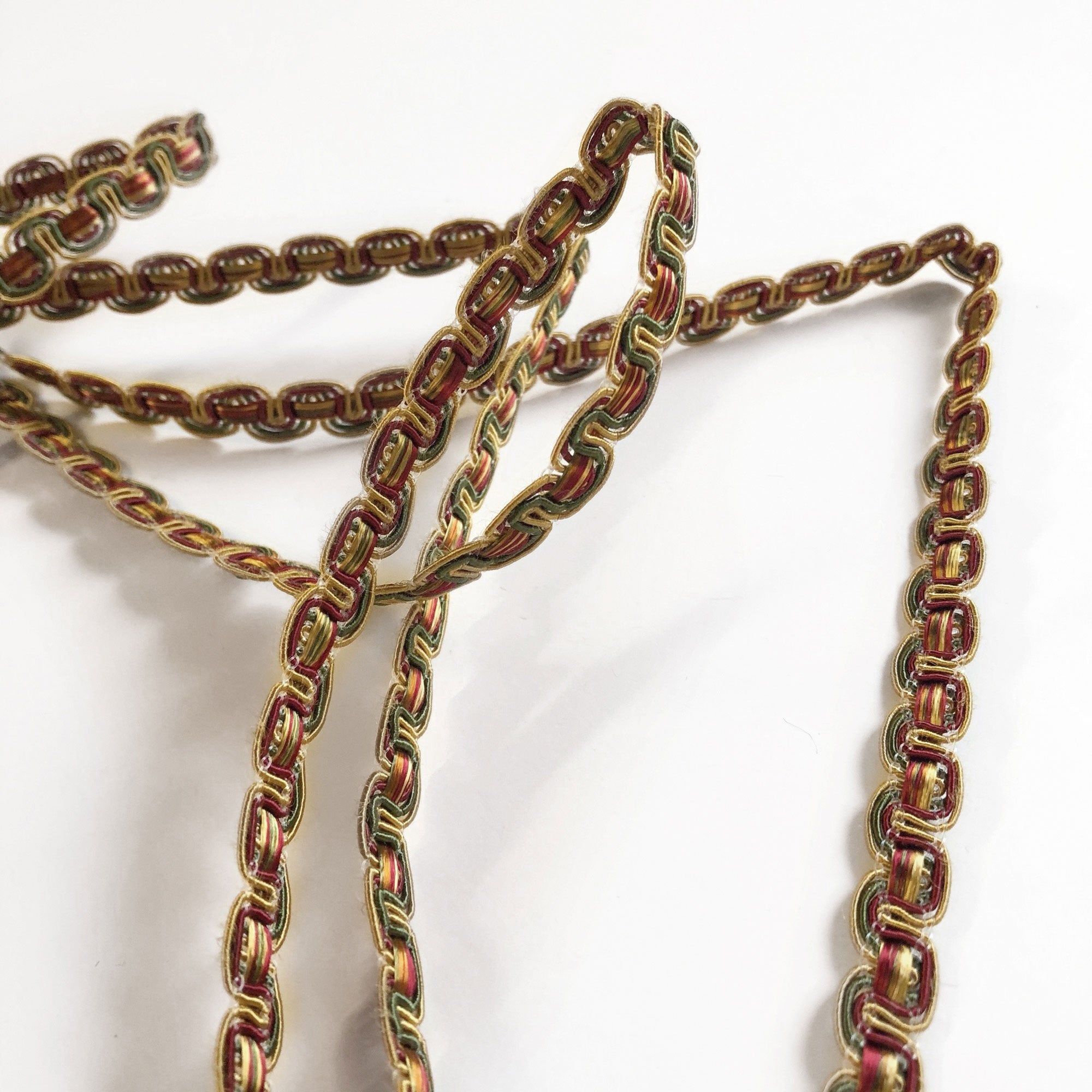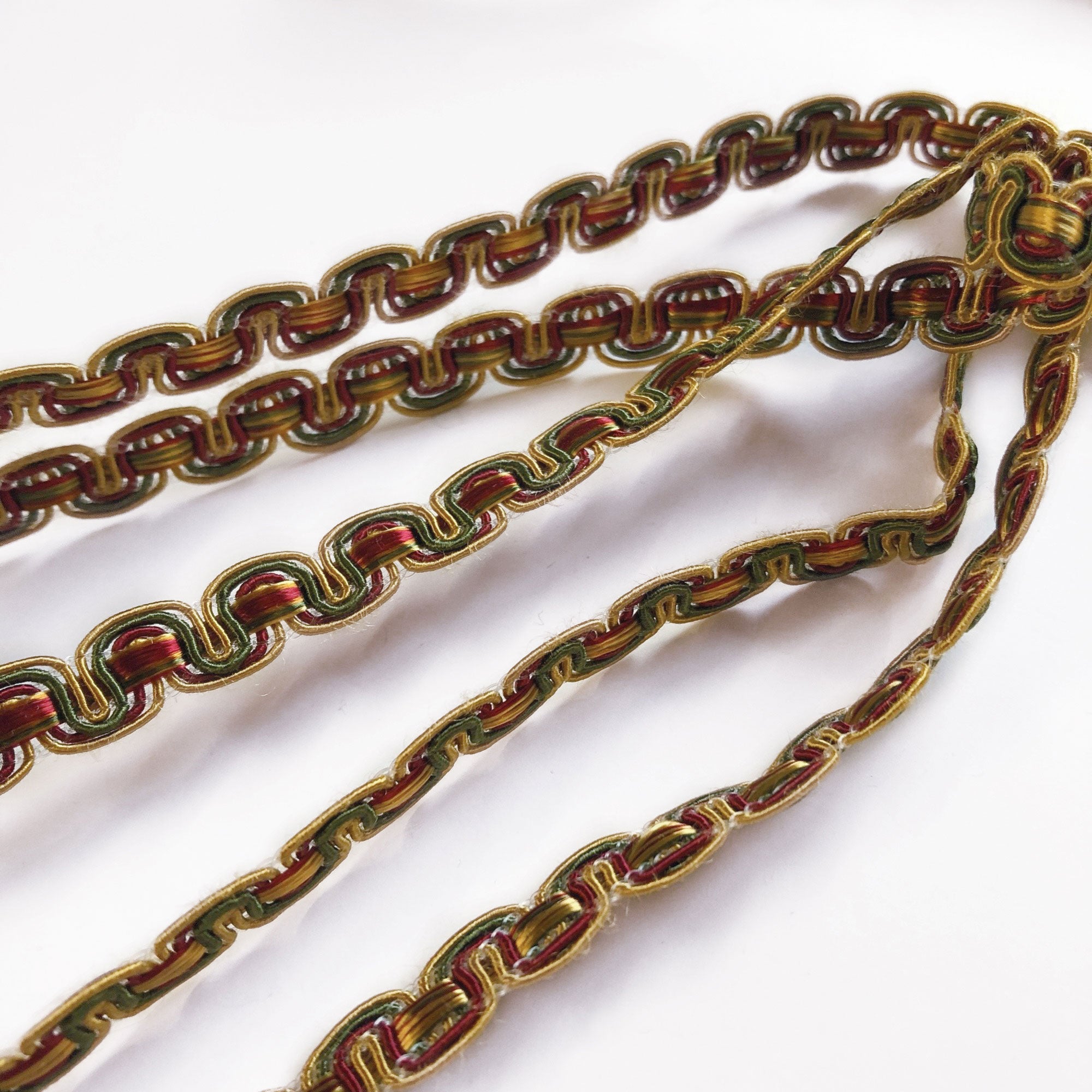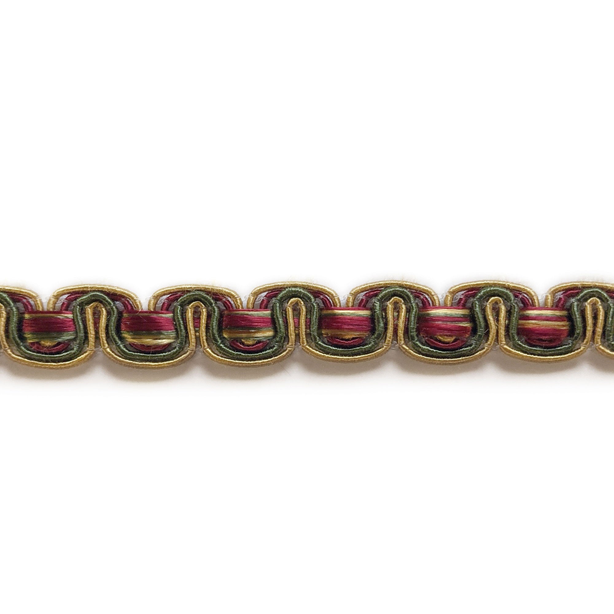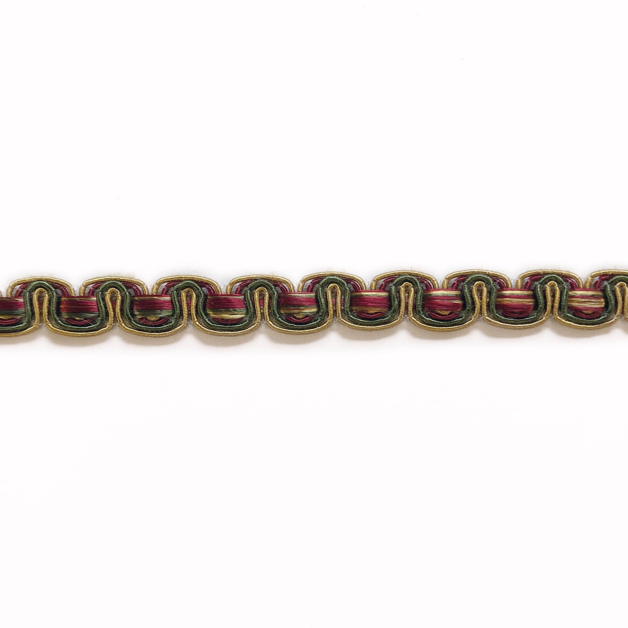 Decorative gimp trim with hot pink, gold, and green twisted threads.
