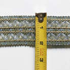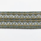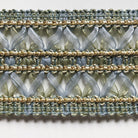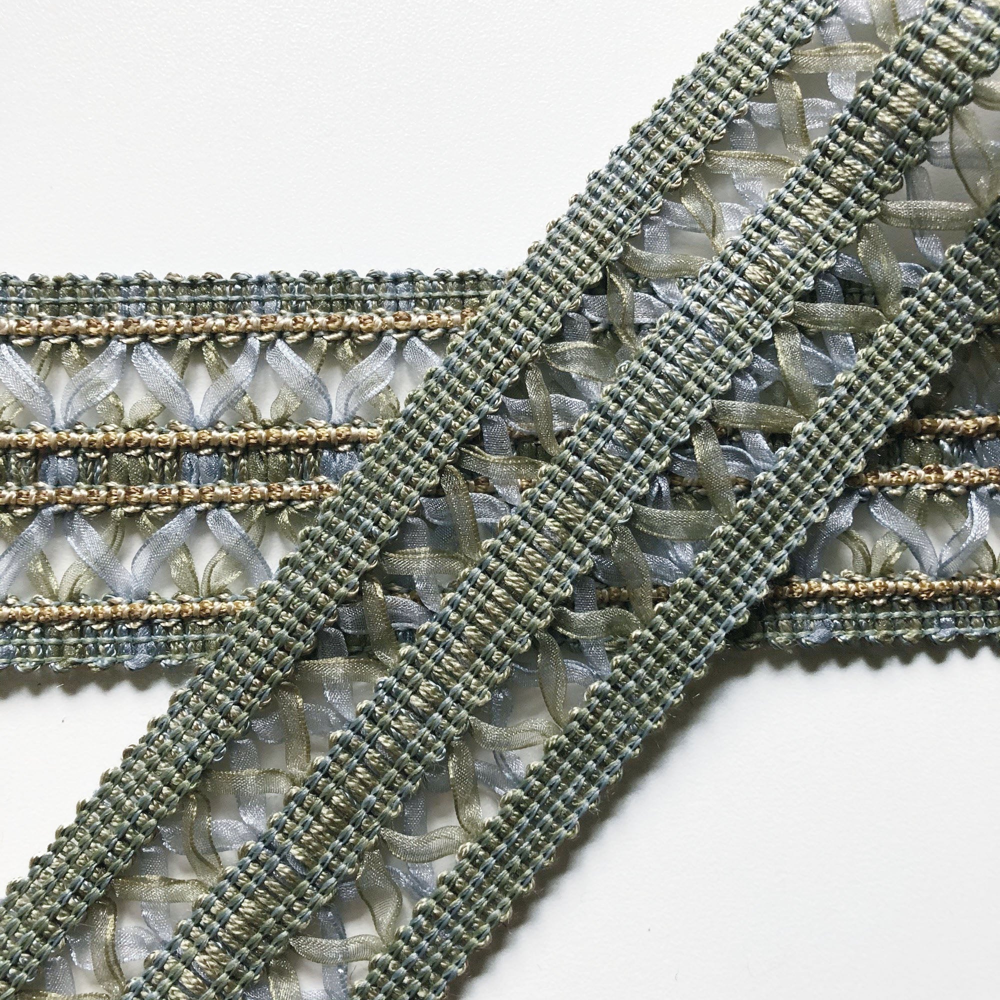 Decorative gimp trim in sky blue, sage green, and gold threads with sheer fabric inserts.
