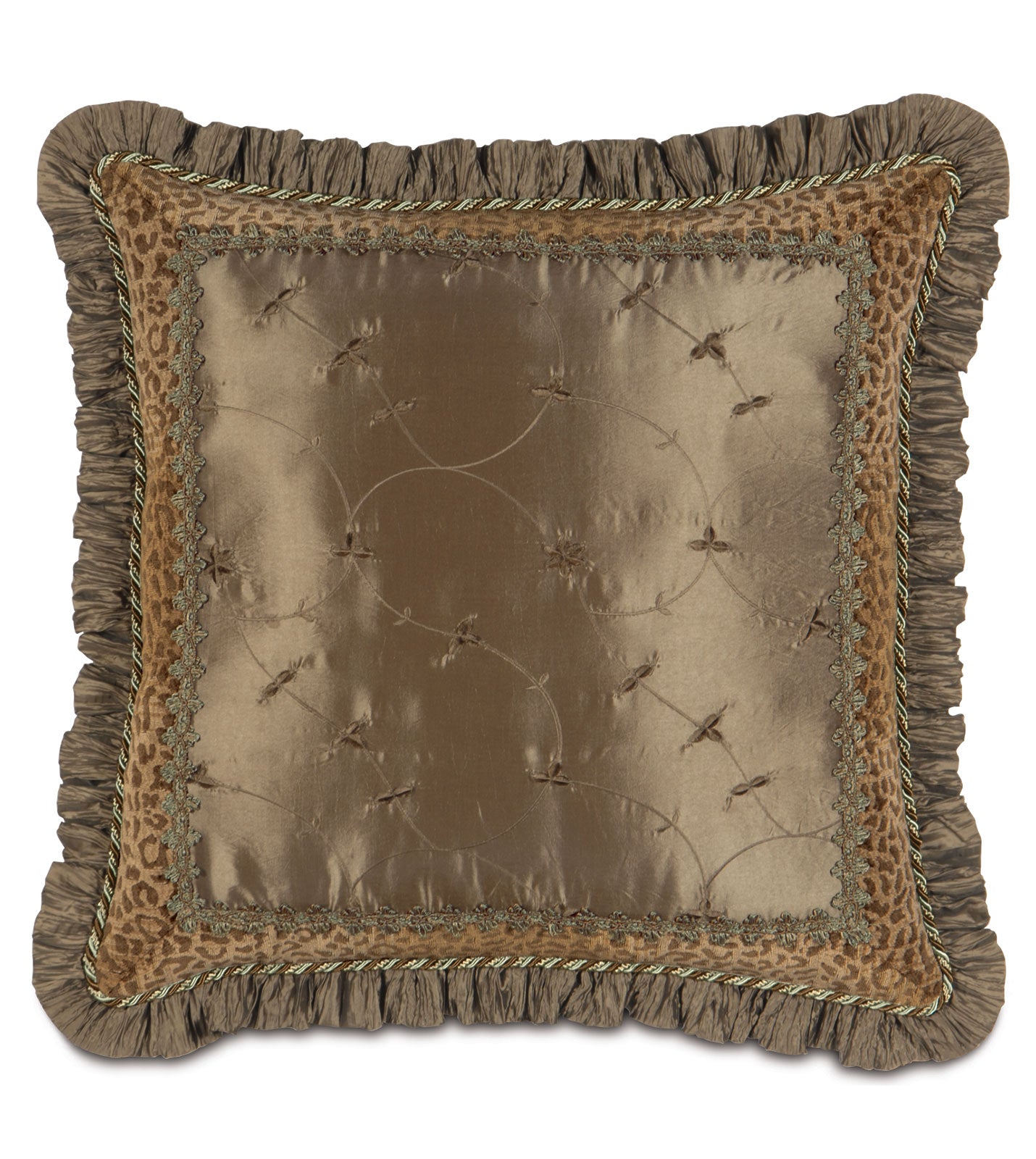 ⁌ Bring a sense of grandeur to your bedding with the Palais Antique Euro Sham. This 27x27 decorative sham is crafted from richly textured bronze fabric, radiating warmth and elegance. The coordinating sepia backing complements the opulent tone, while gimp applique on the face and a corded ruffle edge lend refined detail and timeless character. Designed with a discreet zipper closure for easy care, this sham embodies luxury and craftsmanship. Proudly made in the USA.