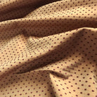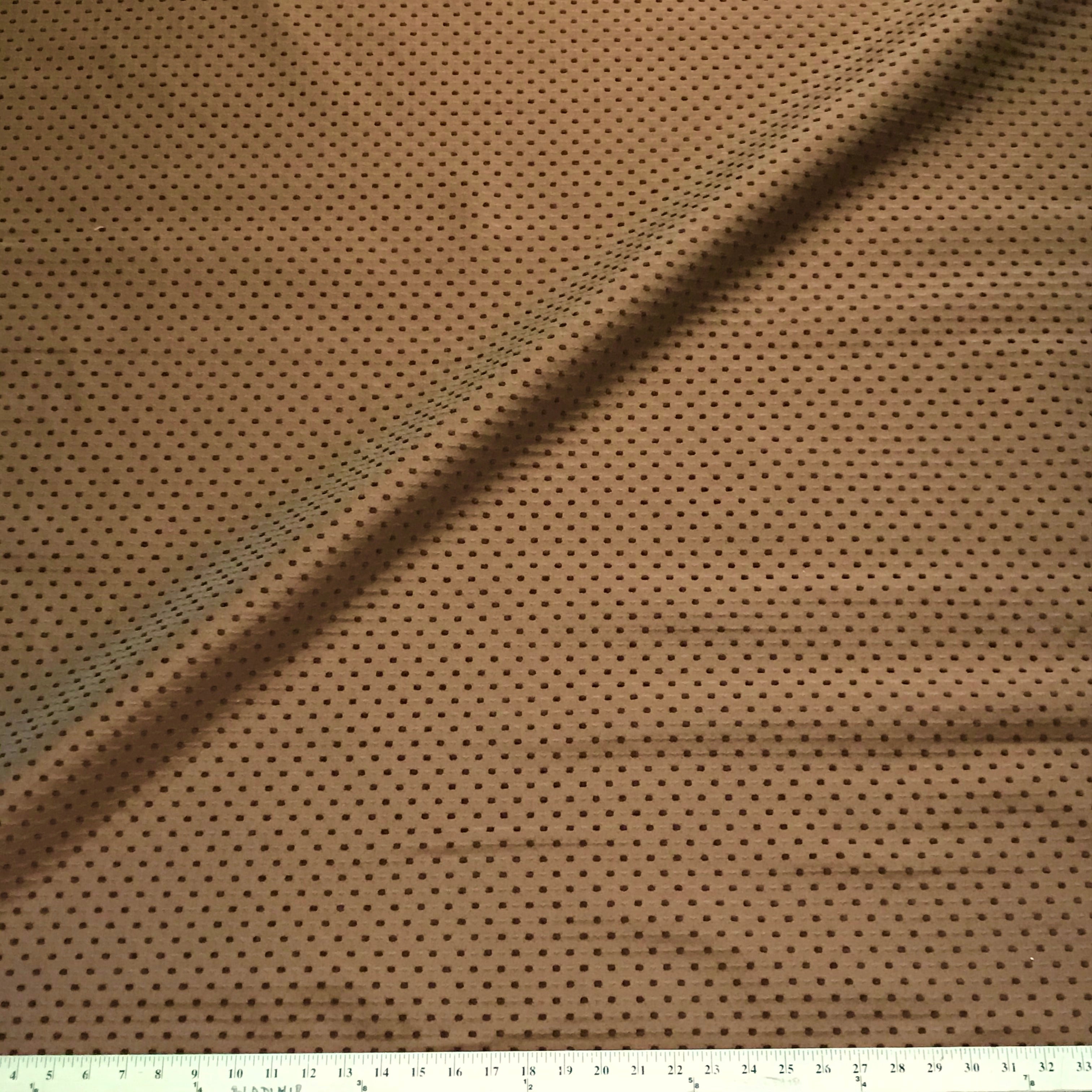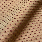 Luxurious golden hued upholstery fabric featuring embroidered dobby dots in red.