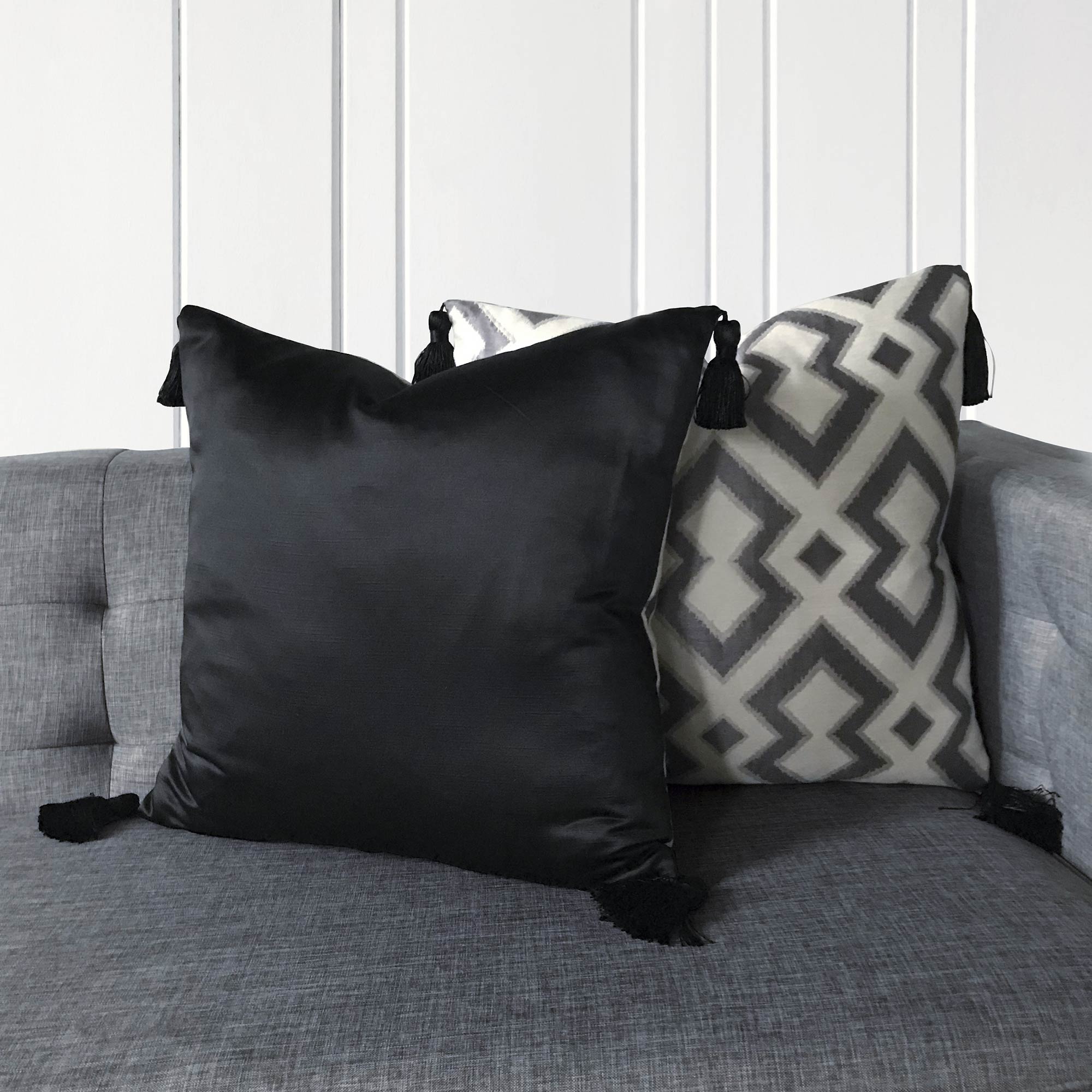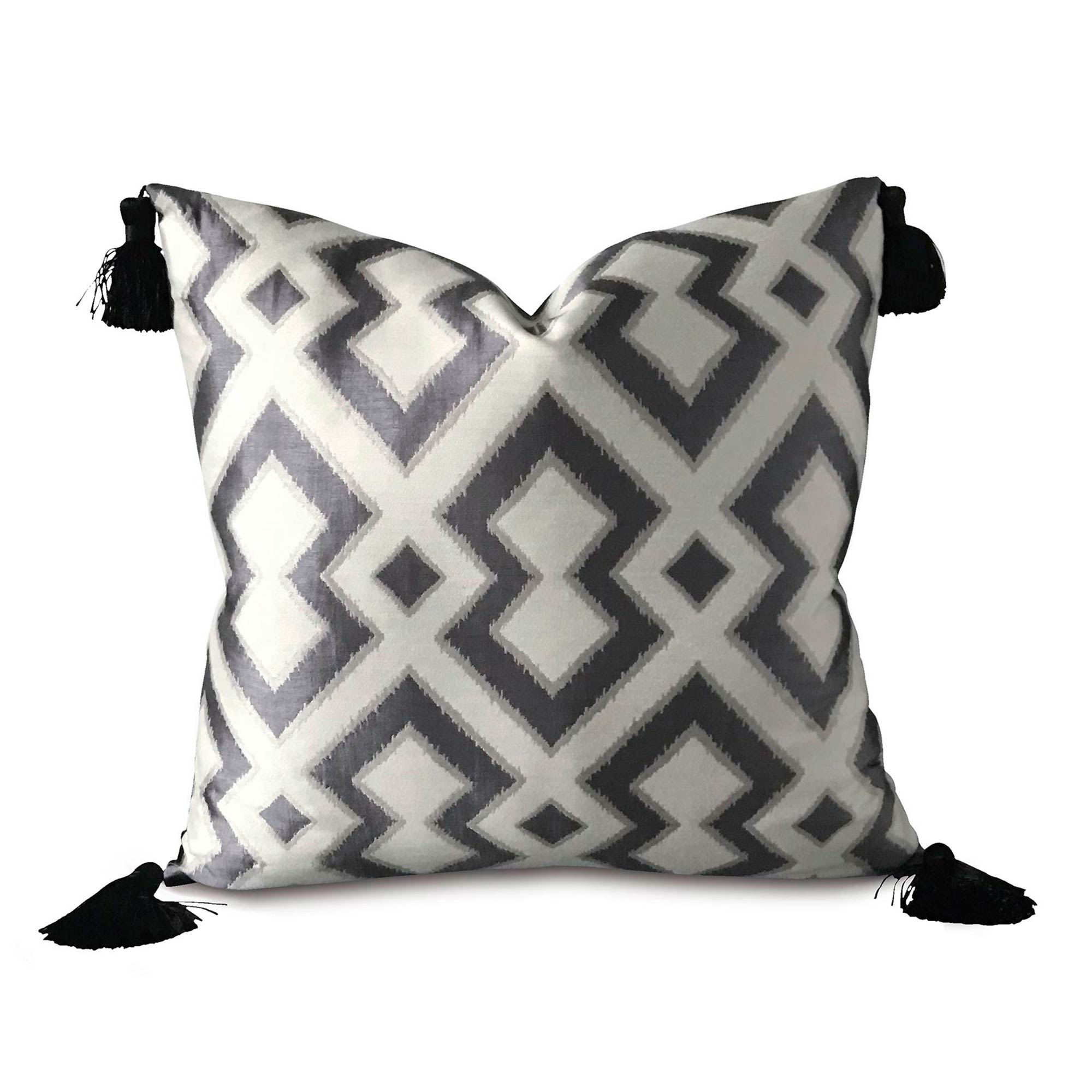⁌ Add sophisticated pattern and texture to your space with the Smoke Trellis Tassel Throw Pillow Cover. This 22x22 decorative pillow cover features a light and dark gray geometric trellis design on the front, complemented by a solid black satin fabric on the reverse. Finished with a standard edge and black tassels at each corner, it brings both structure and a touch of playful elegance. A hidden zipper ensures easy care. Proudly made in the USA.