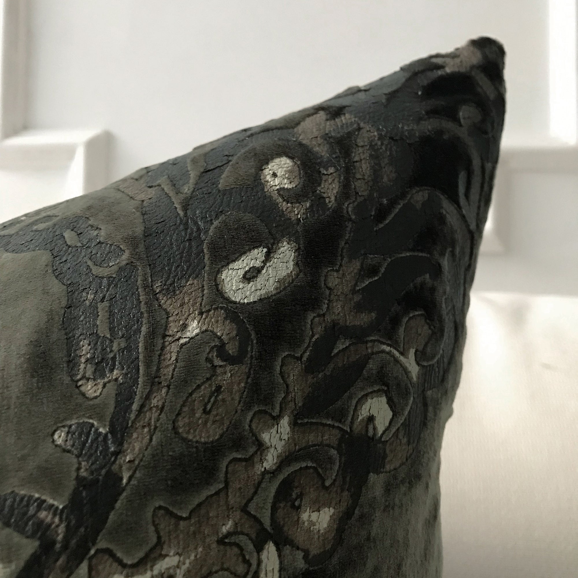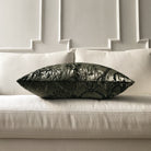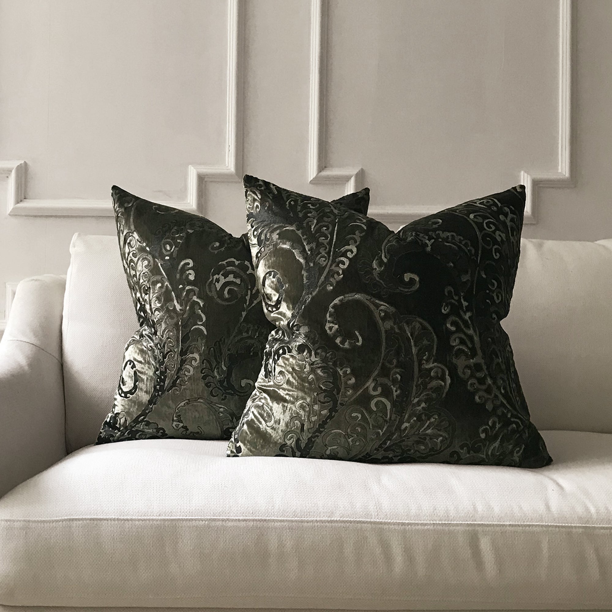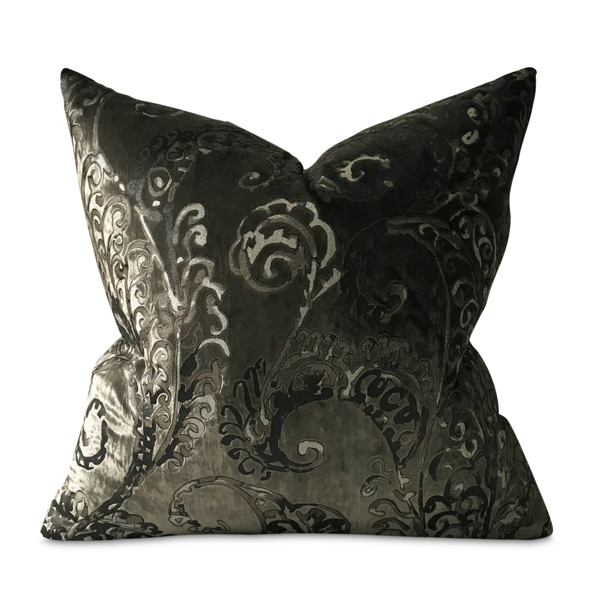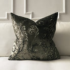 - Plush velvet fabric with a refined botanical pattern in deep charcoal tones