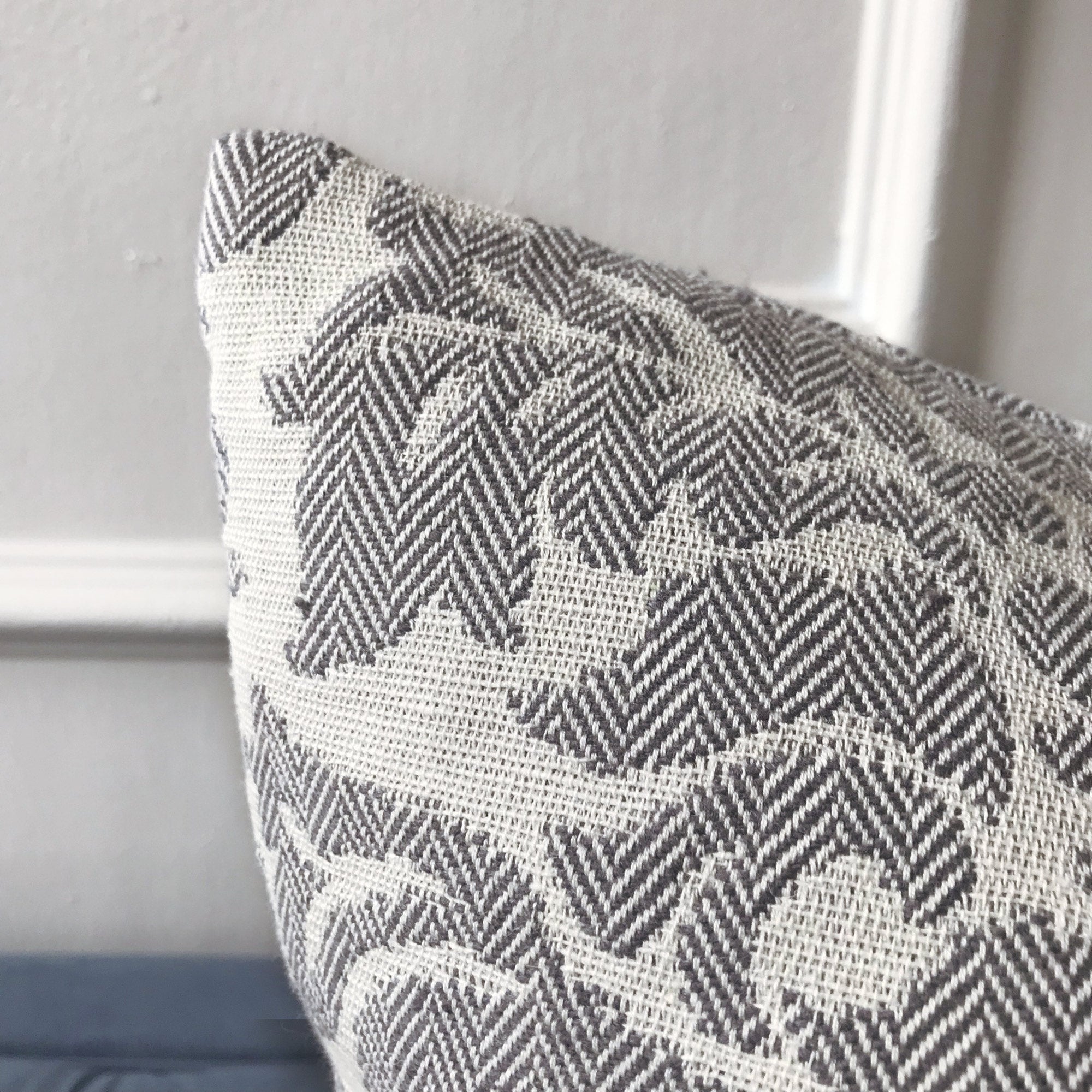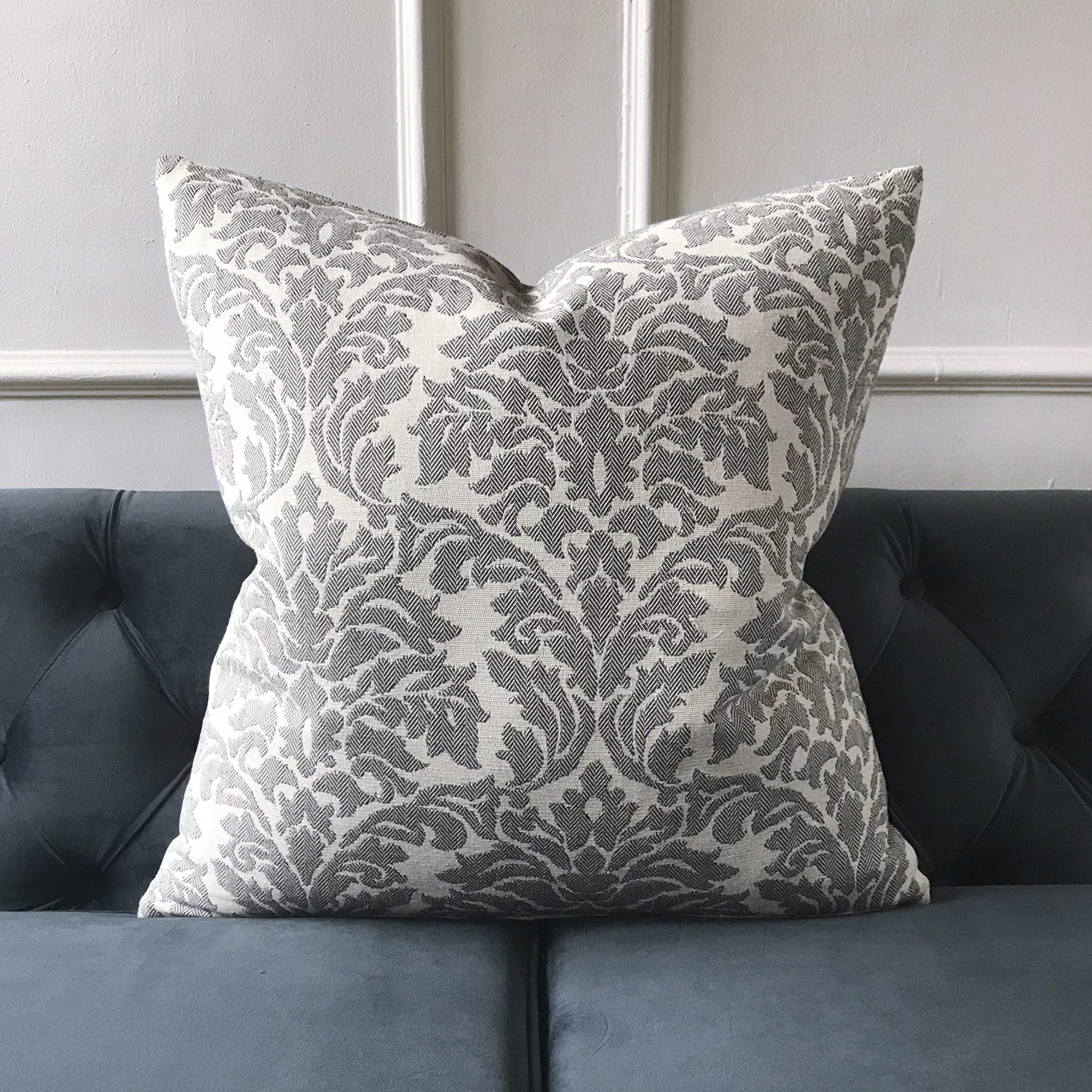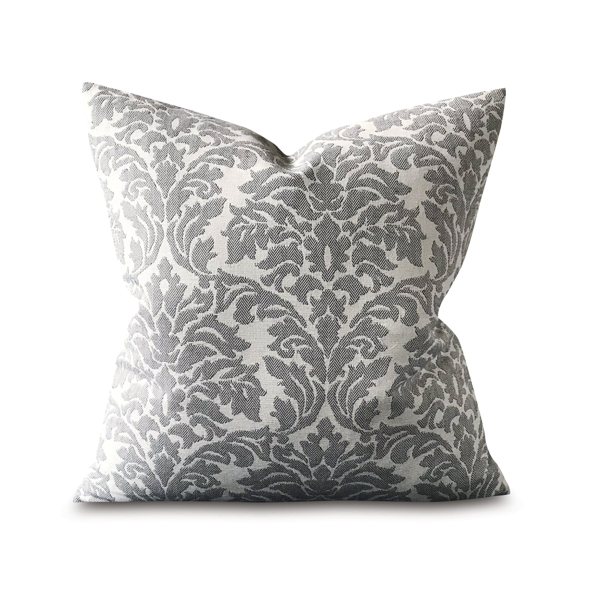 - Jacquard decorative pillow cover with an intricate silver damask pattern