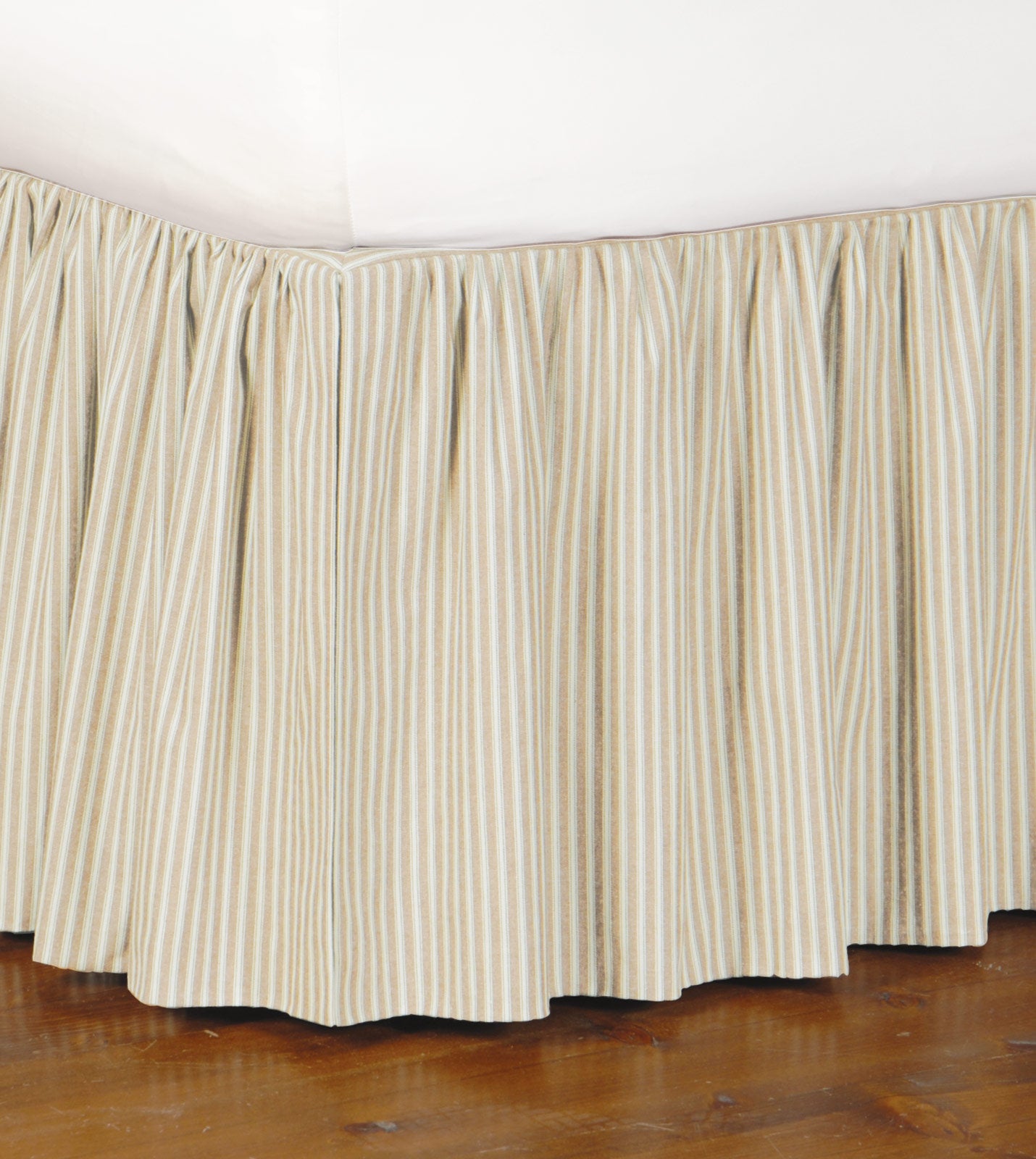 - Ruffled bed skirt in vanilla-toned ticking stripes