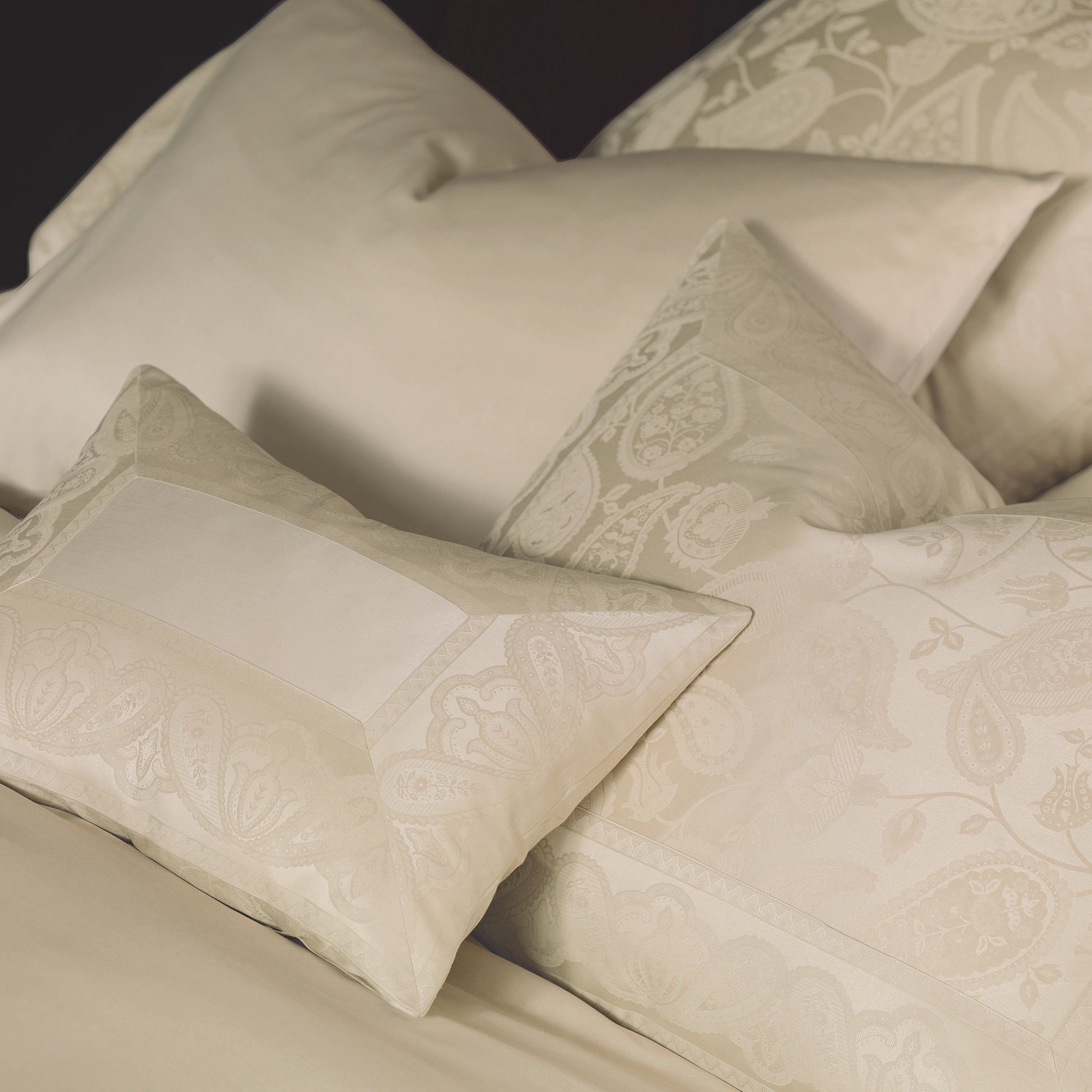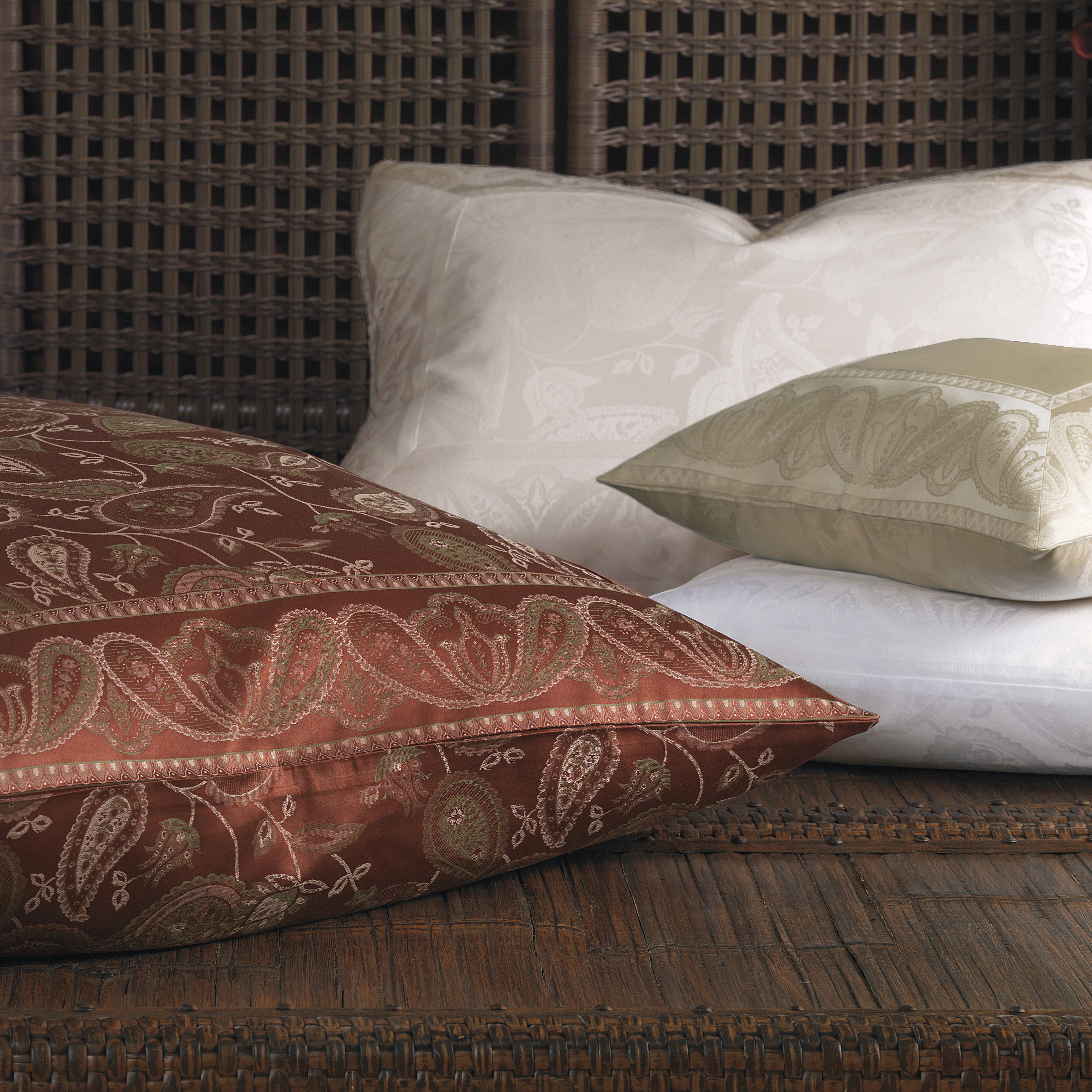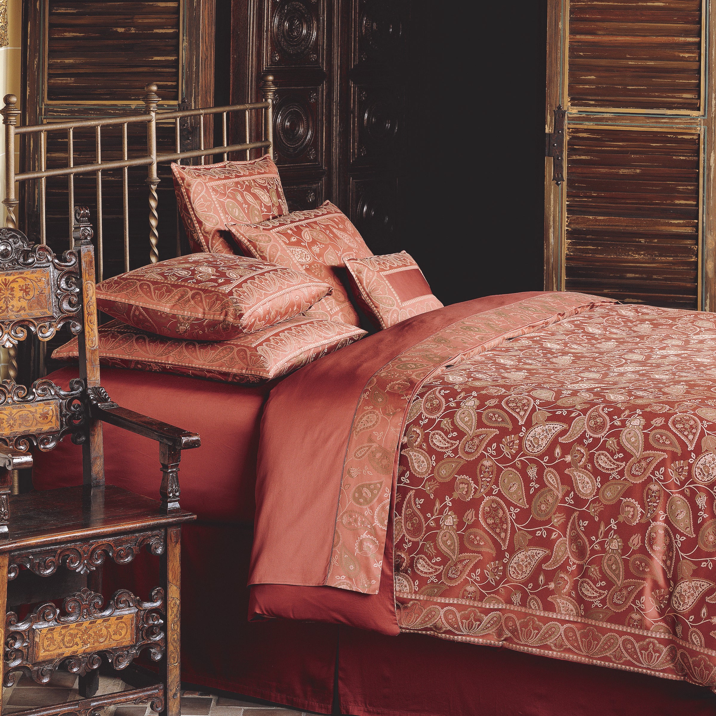 Enter the forgotten world of Constantinople’s boisterous bazaars, winding streets, and vitalizing aromas. Intricate paisleys swirl and abstract teardrops blossom in ethnic-inspired Henna. Visually rich, the jacquard woven textile pairs elegantly with intricate detailing and hemstitched sateen sheeting. This homage to old world design aesthetic brings an enchanting flavor to traditional décor.