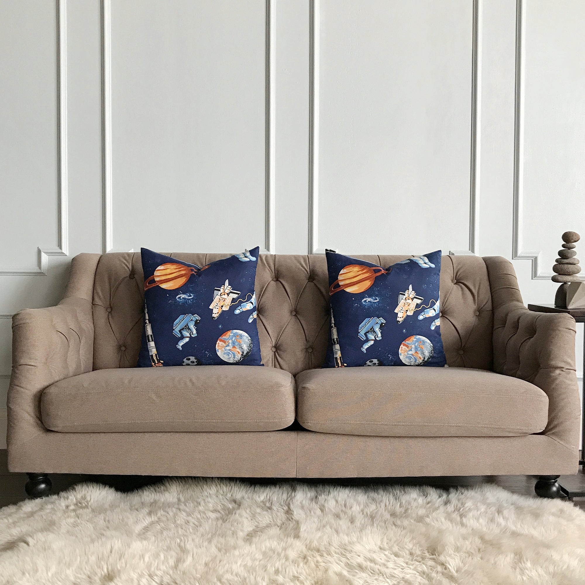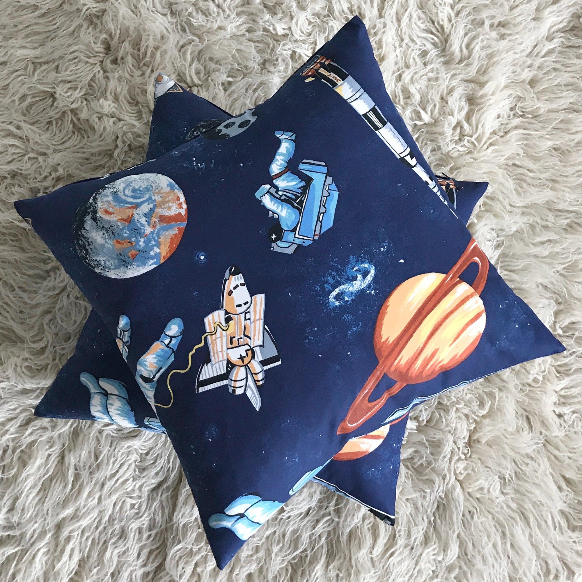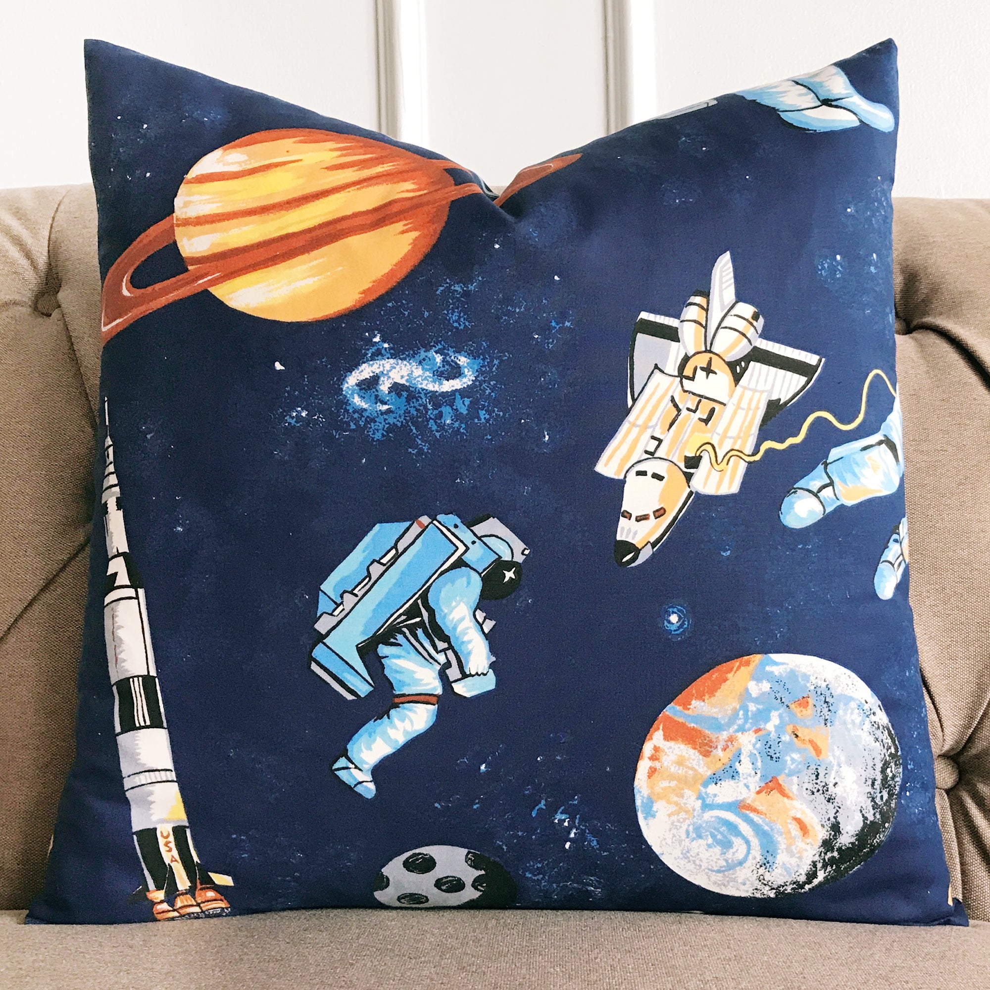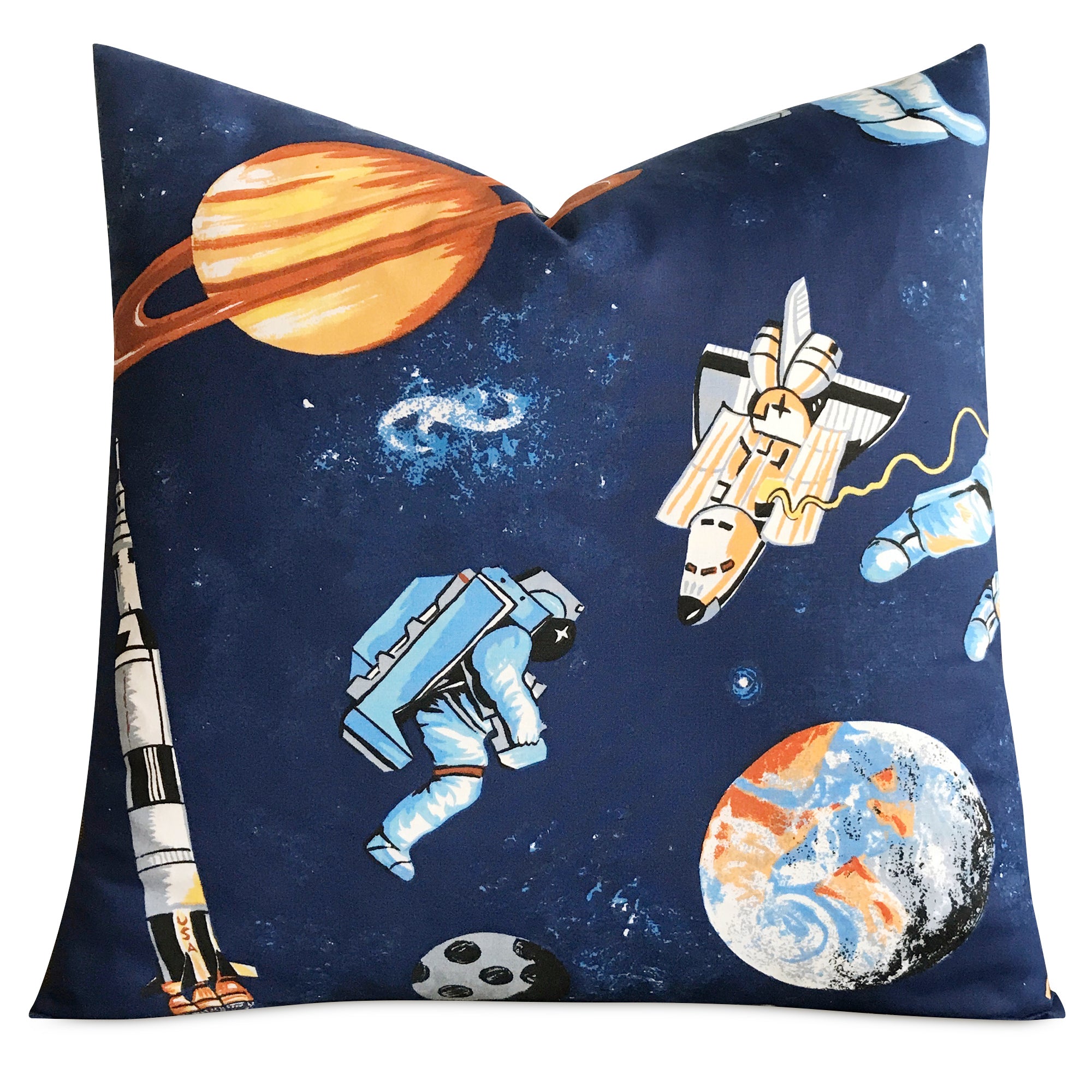Ignite your child’s imagination with this fun and adventurous Kids Blue Space Astronaut Print Decorative Pillow Cover. Featuring an exciting outer space design with astronauts and planets, this pillow cover is perfect for adding a playful touch to any bedroom or playroom. The vibrant blue backdrop and whimsical space elements create a sense of wonder, sparking curiosity about the galaxy. Handmade in the USA with care, this pillow cover combines creativity with quality craftsmanship, ensuring it lasts through countless adventures. The knife-edge finish offers a neat, polished look, while the zipper closure allows for easy removal and cleaning.