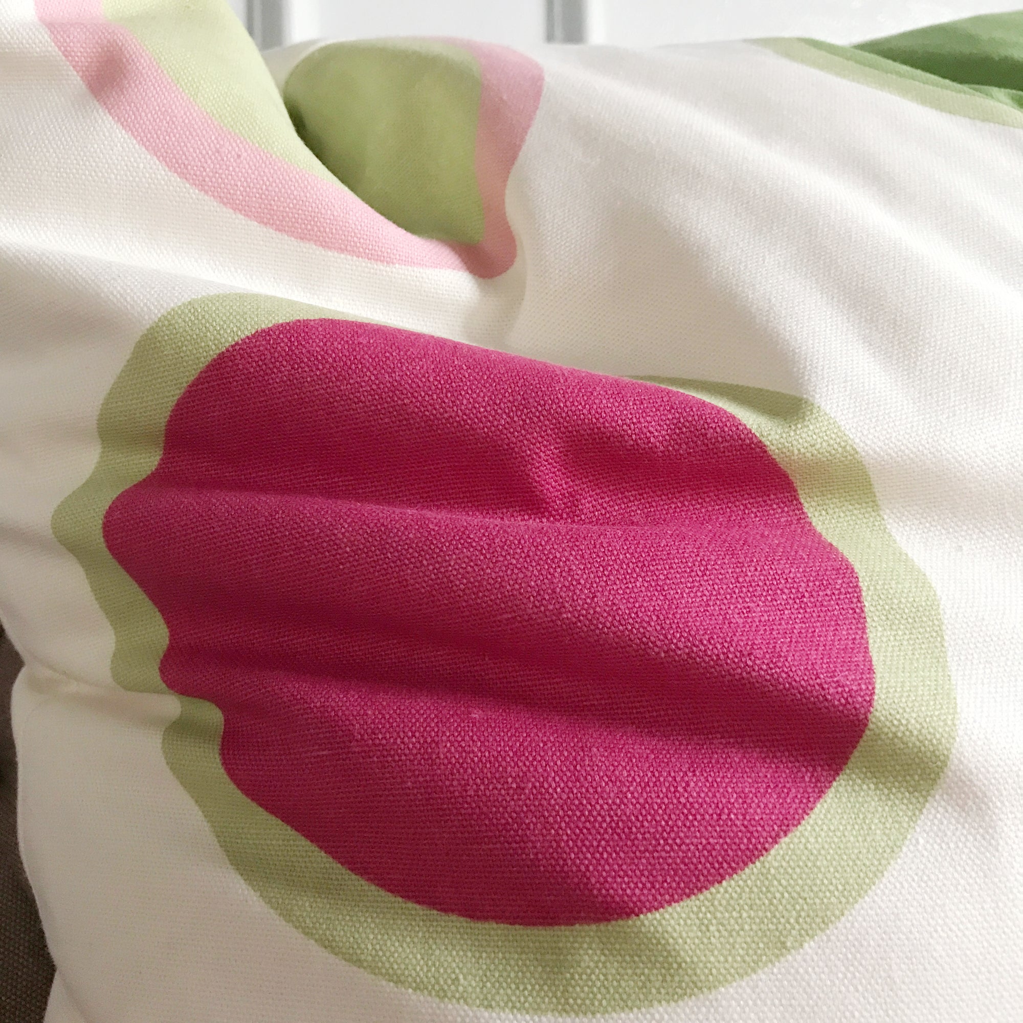 - Eclectic fabric with a bold pink and lime green polka dot design on white