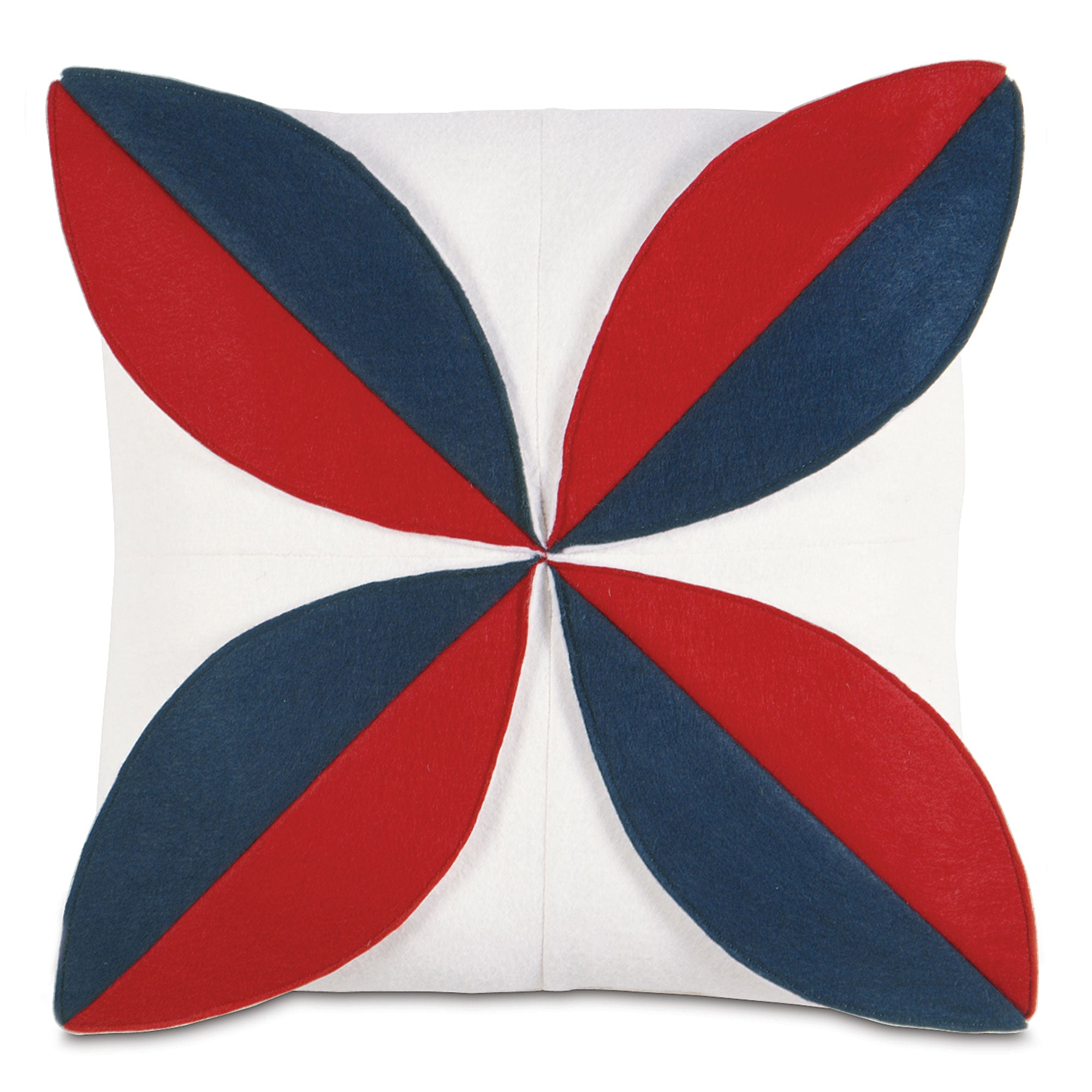 - Throw pillow with geometric red and black felt applique gives the look of a bloomed flower