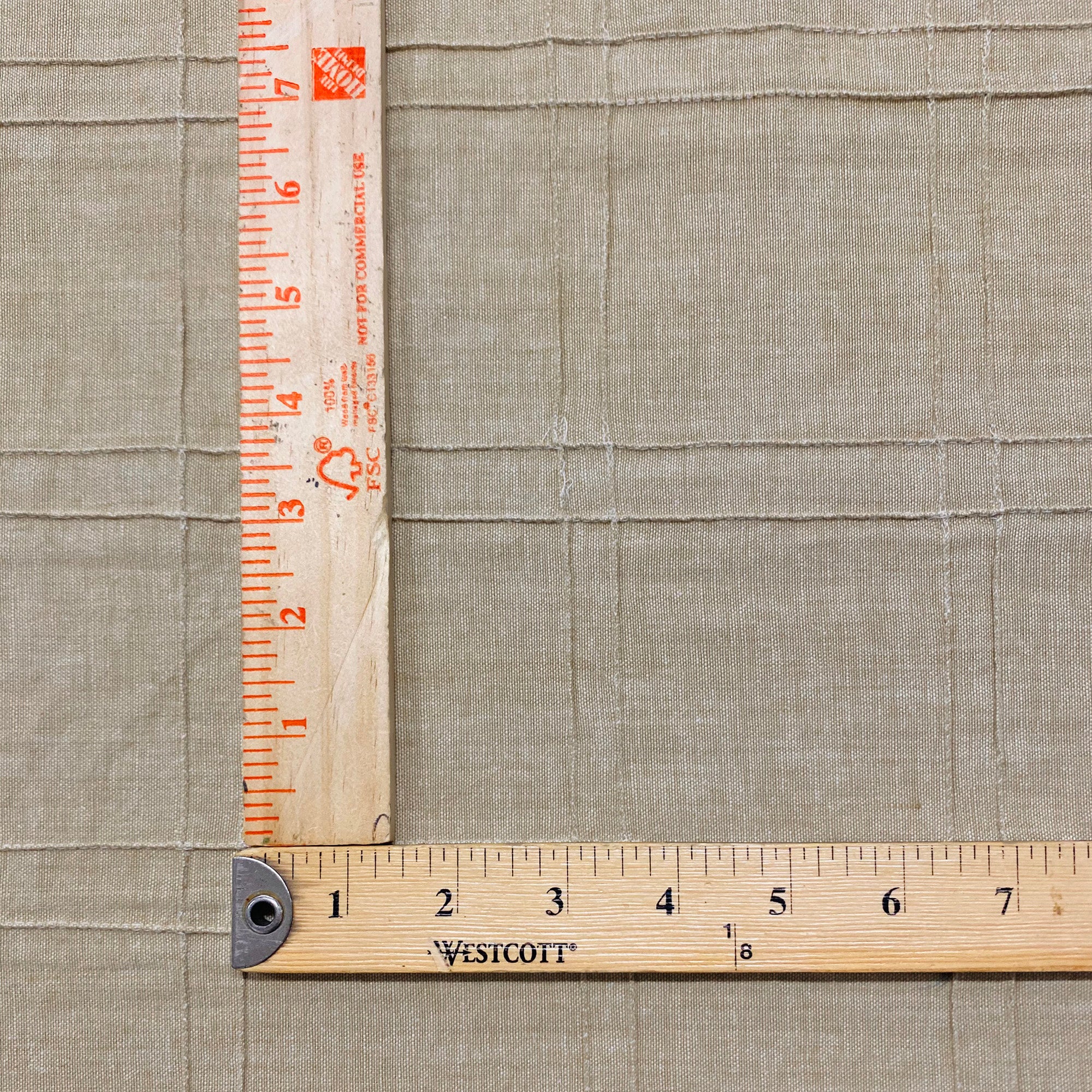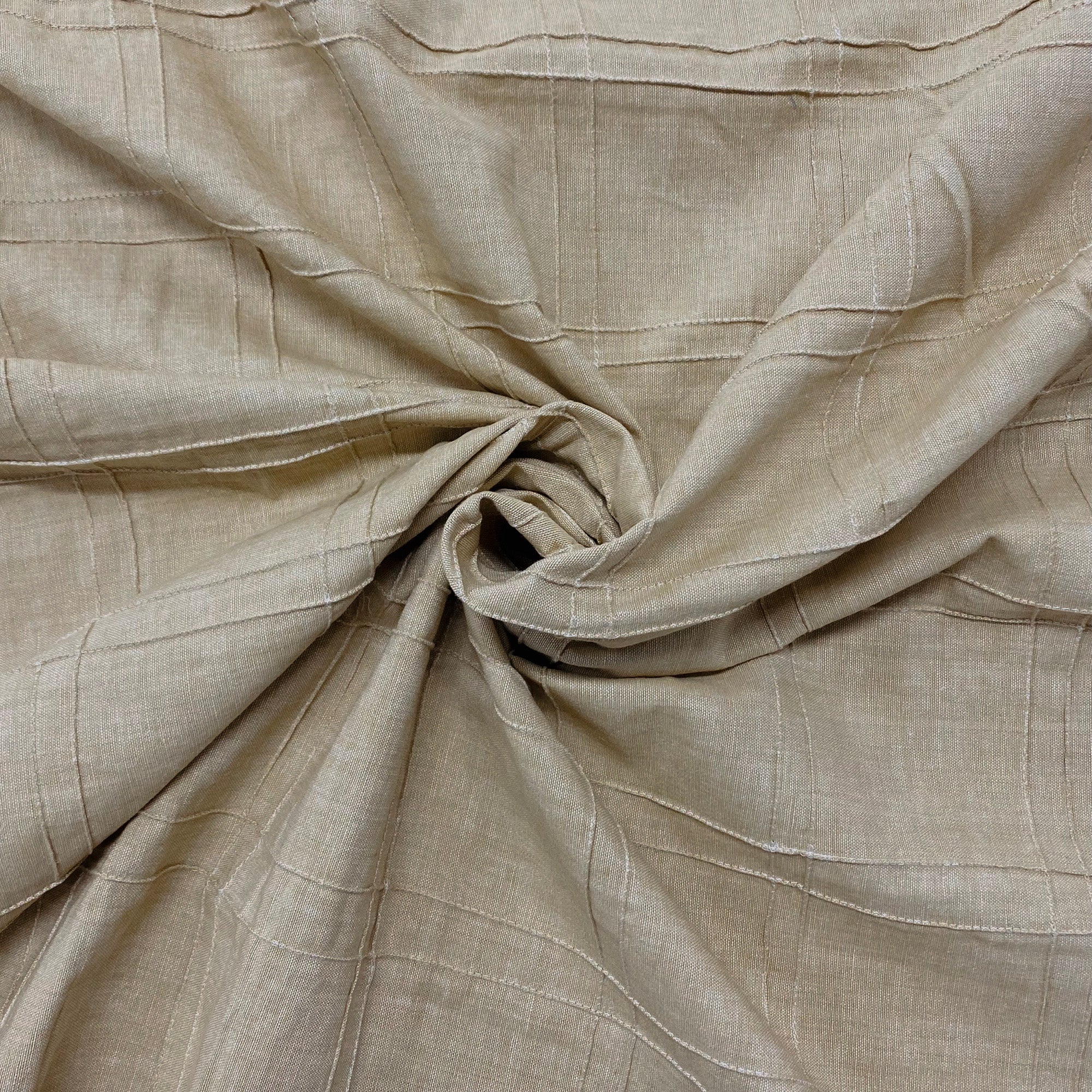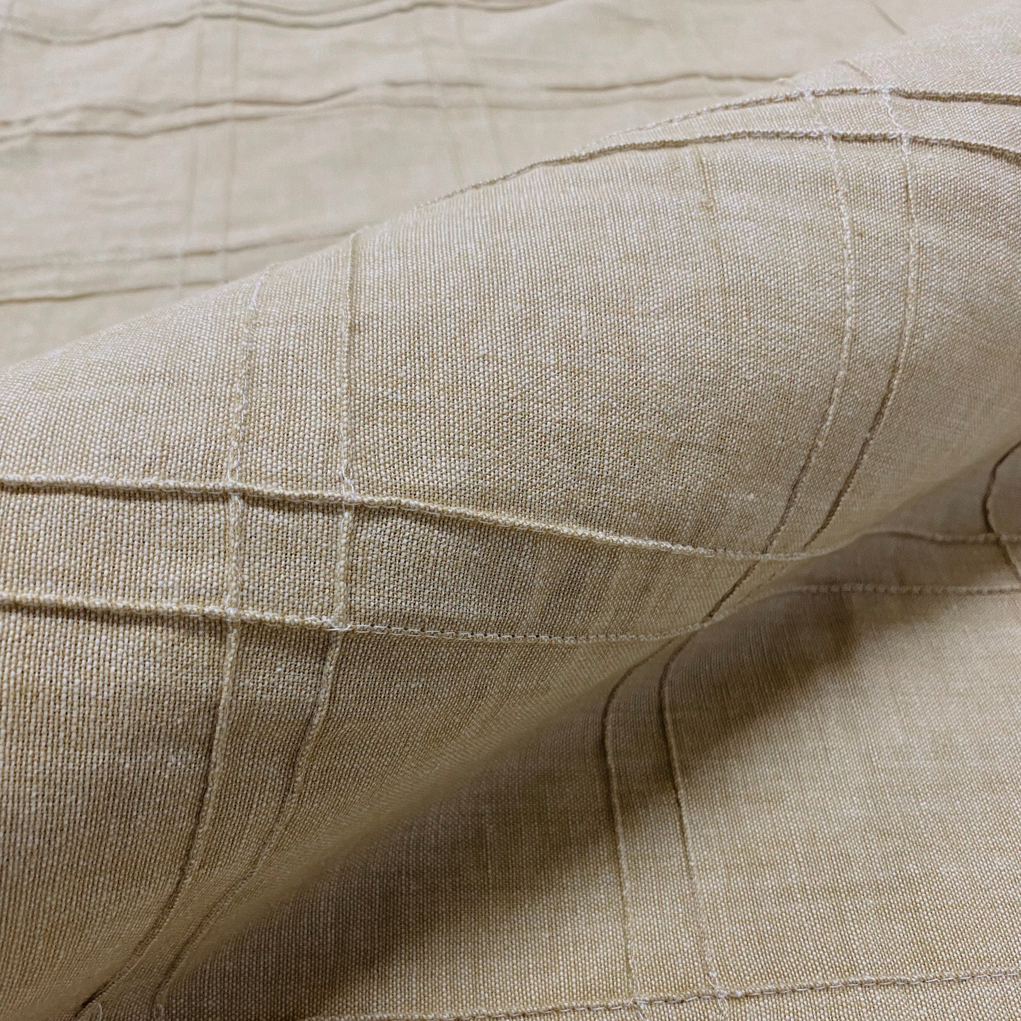 Lightweight cotton upholstery fabric in sand with pintucked grid pattern.