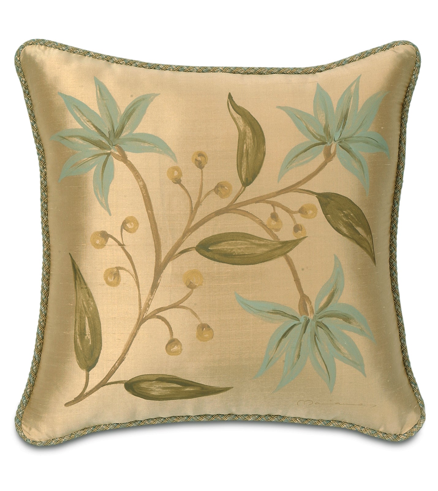 - Silk pillow cover with a hand-painted lotus flower in gold and blue