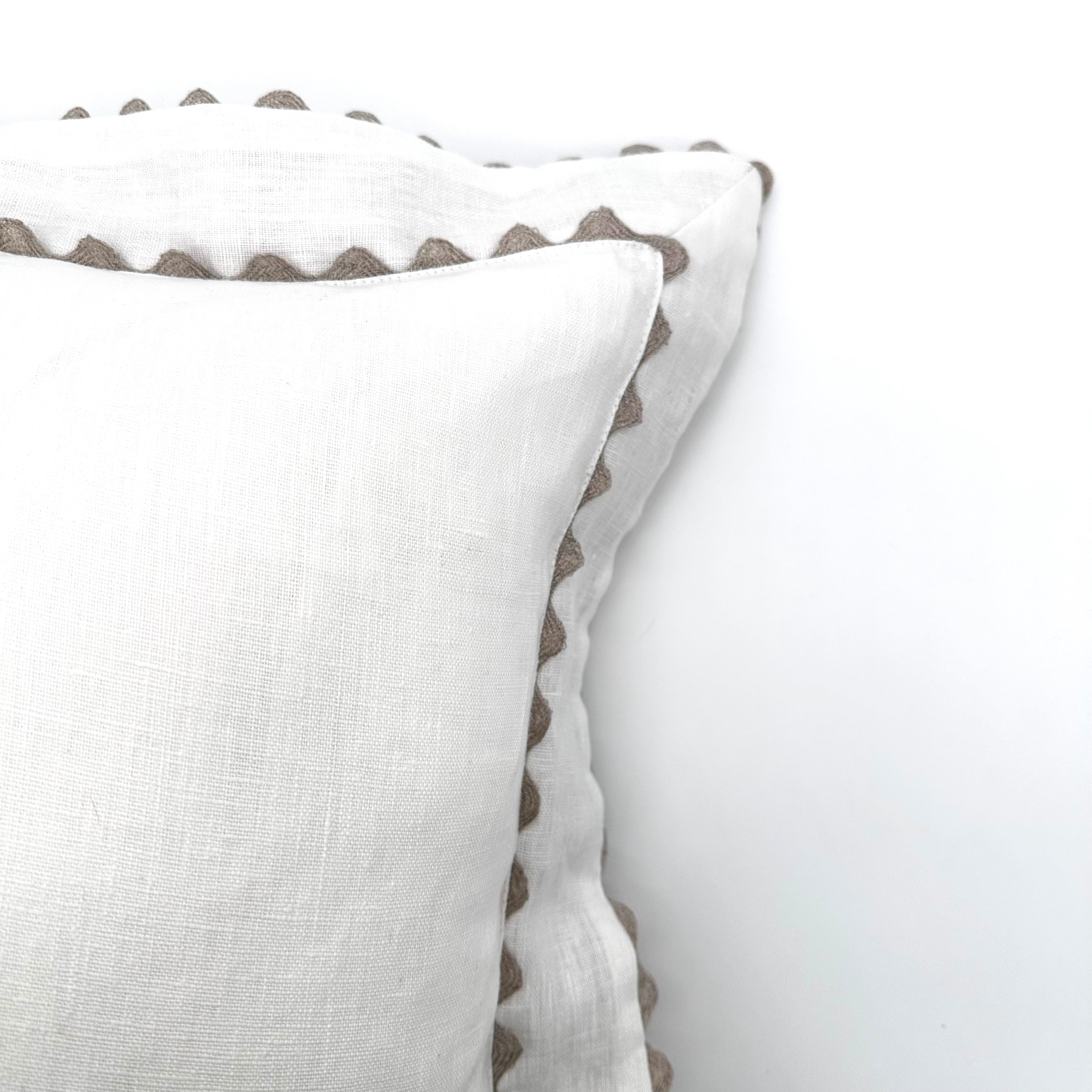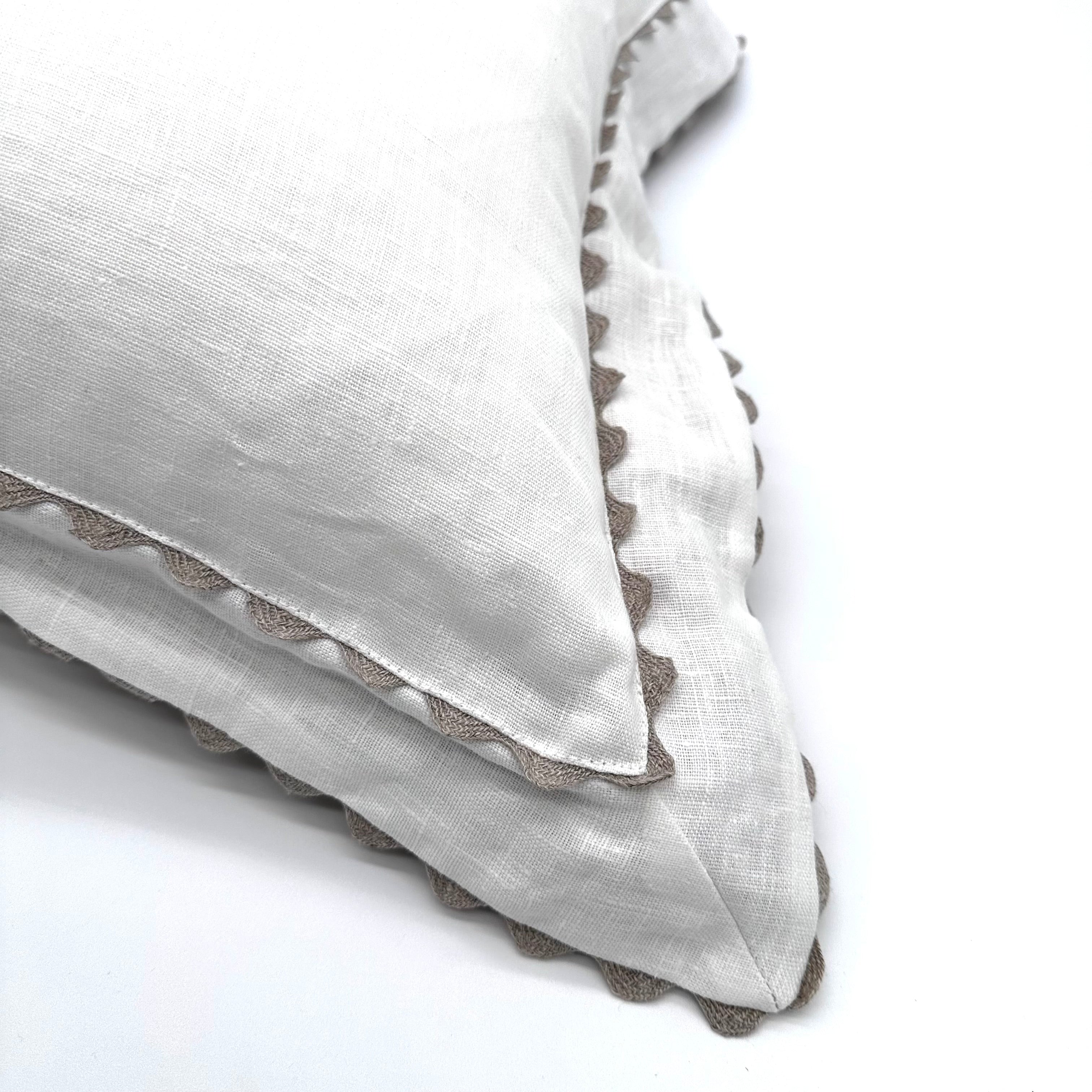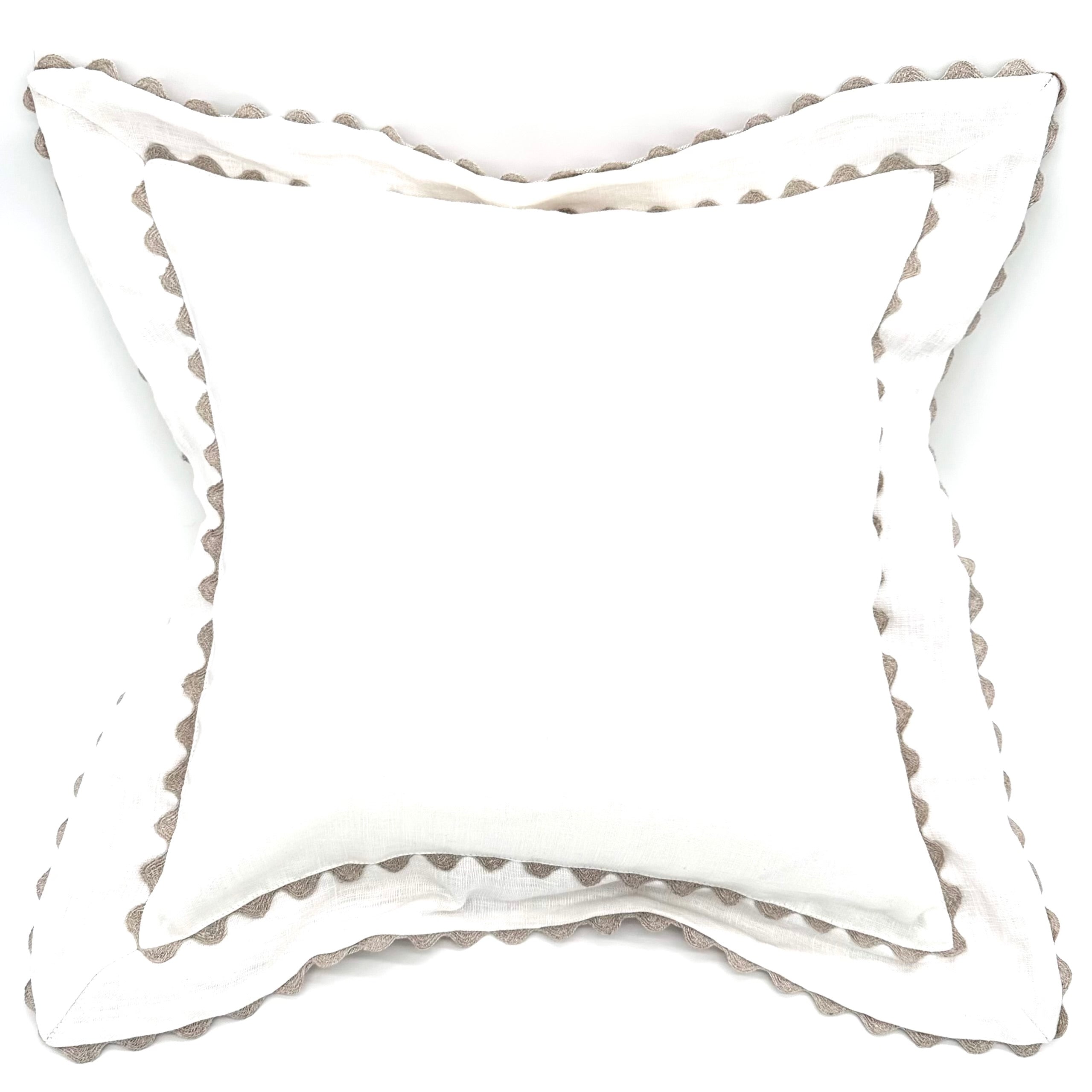 ⁌ Elevate your décor with timeless texture and subtle elegance using this 18x18 off-white throw pillow cover, crafted from 100% pure linen. Designed with vintage-inspired details including fringe on the face, a mitered flange edge, and tan gimp trim, this handcrafted cover brings softness, structure, and a refined touch to traditional, farmhouse, or shabby chic interiors.