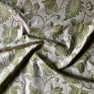Double cloth fabric with tropical vine design in green against an eggshell white background.