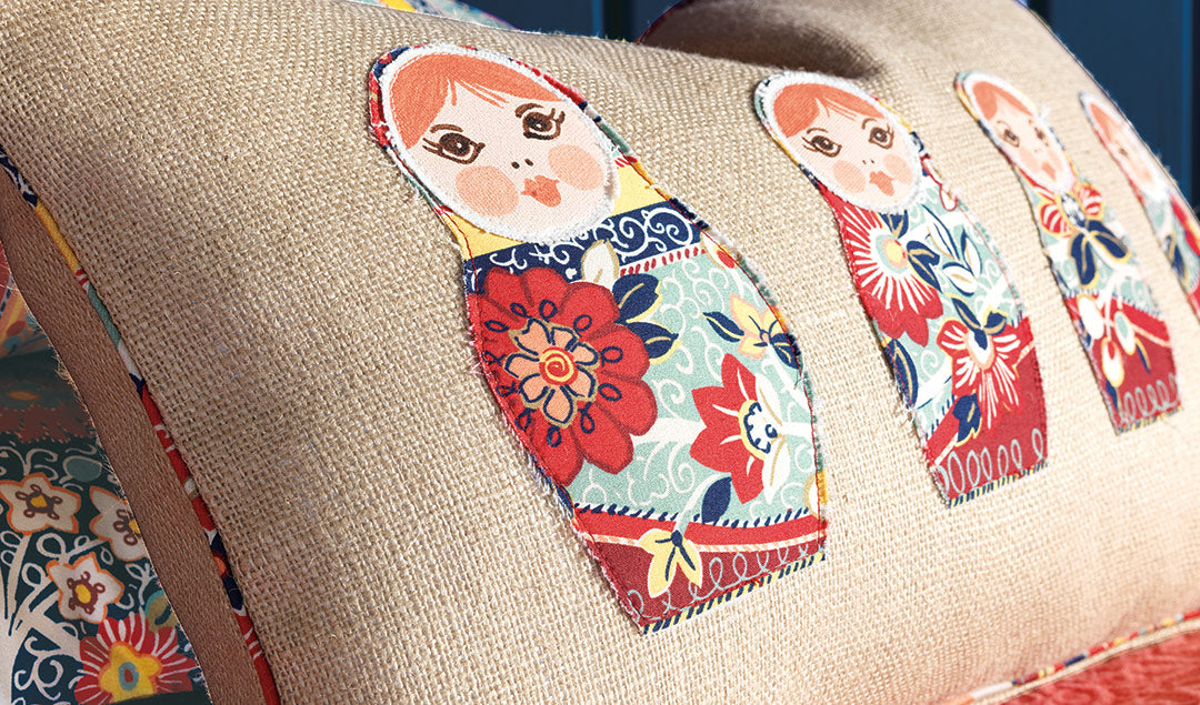 • Decorative Pillow with hand-painted matryoshka applique on burlap