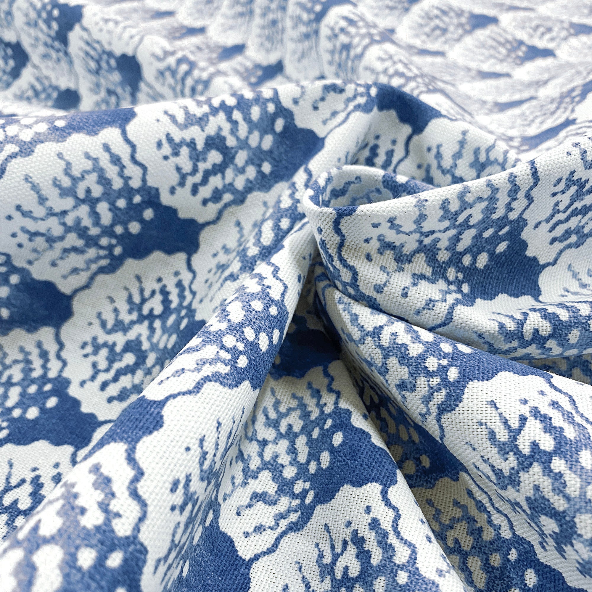 100% cotton upholstery fabric with a printed coral motif in indigo/Aegean blue.