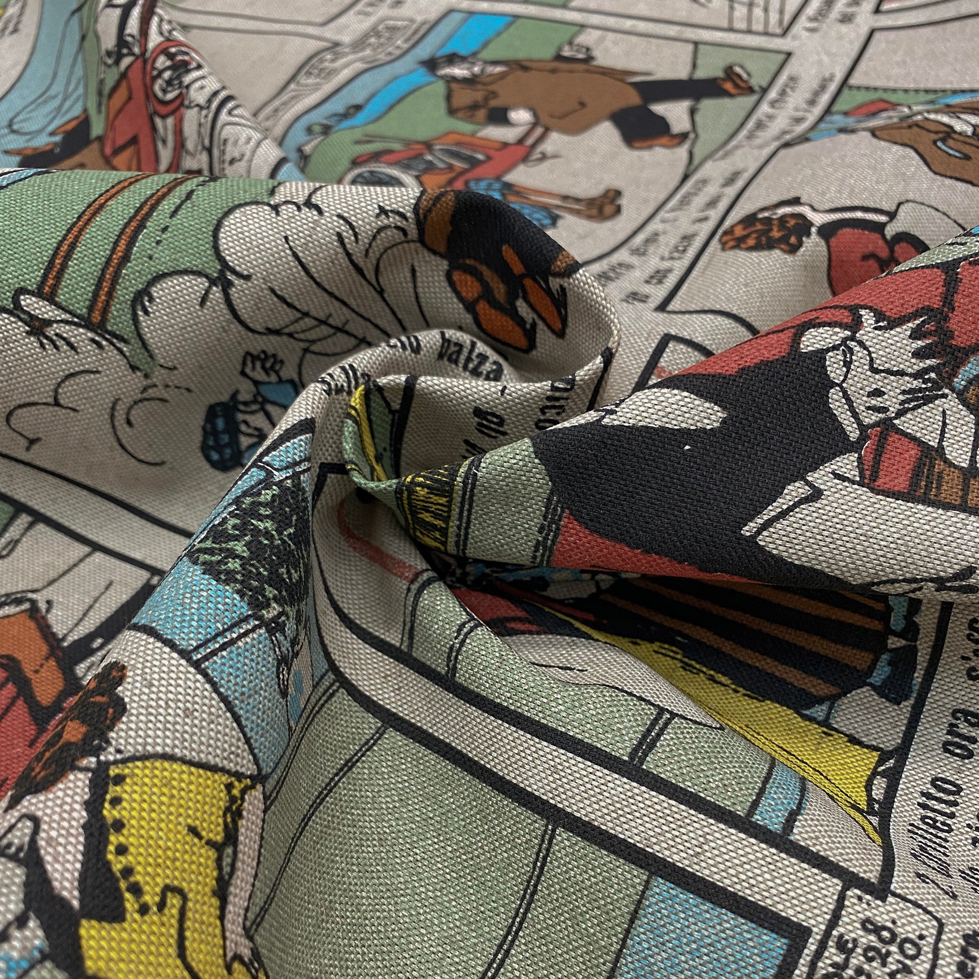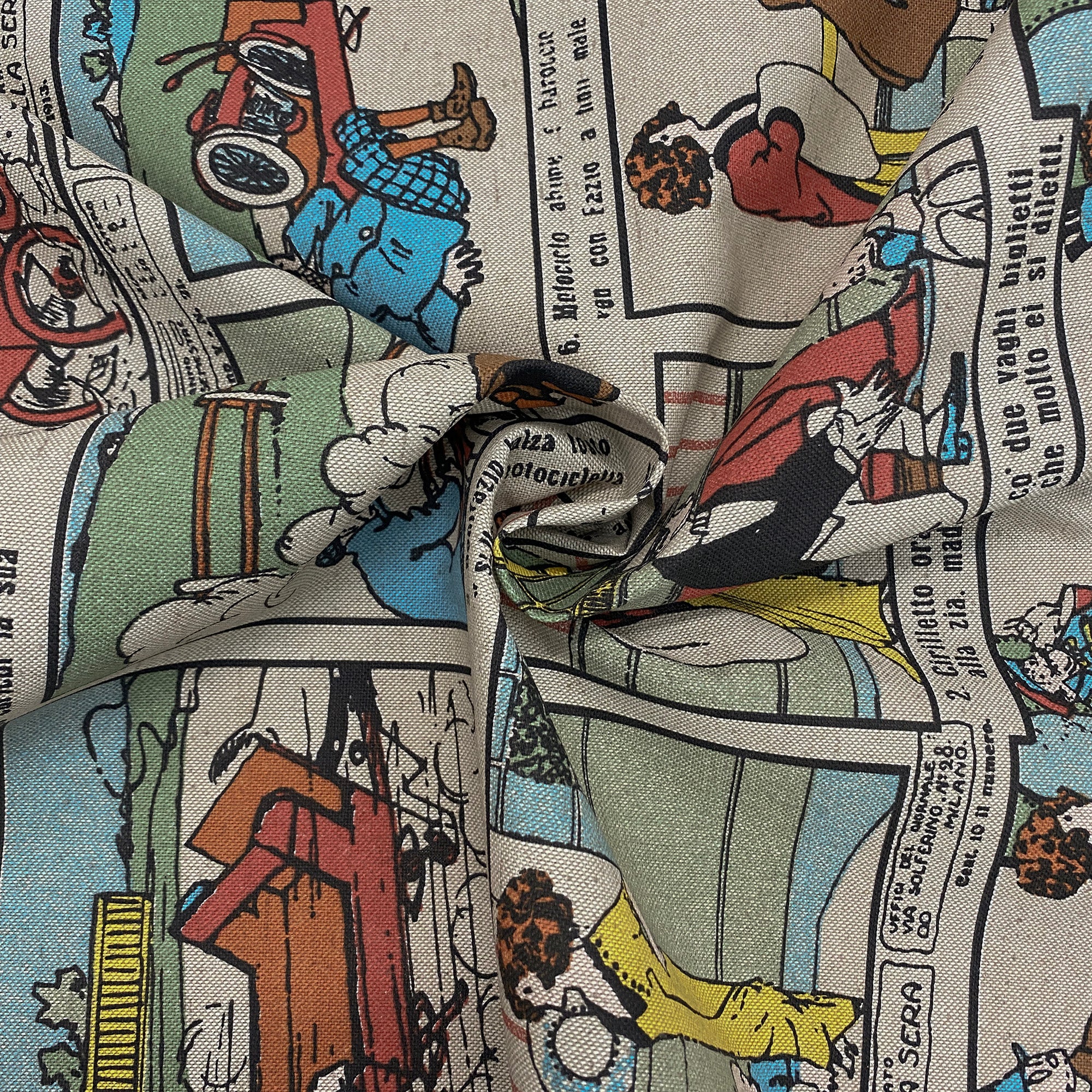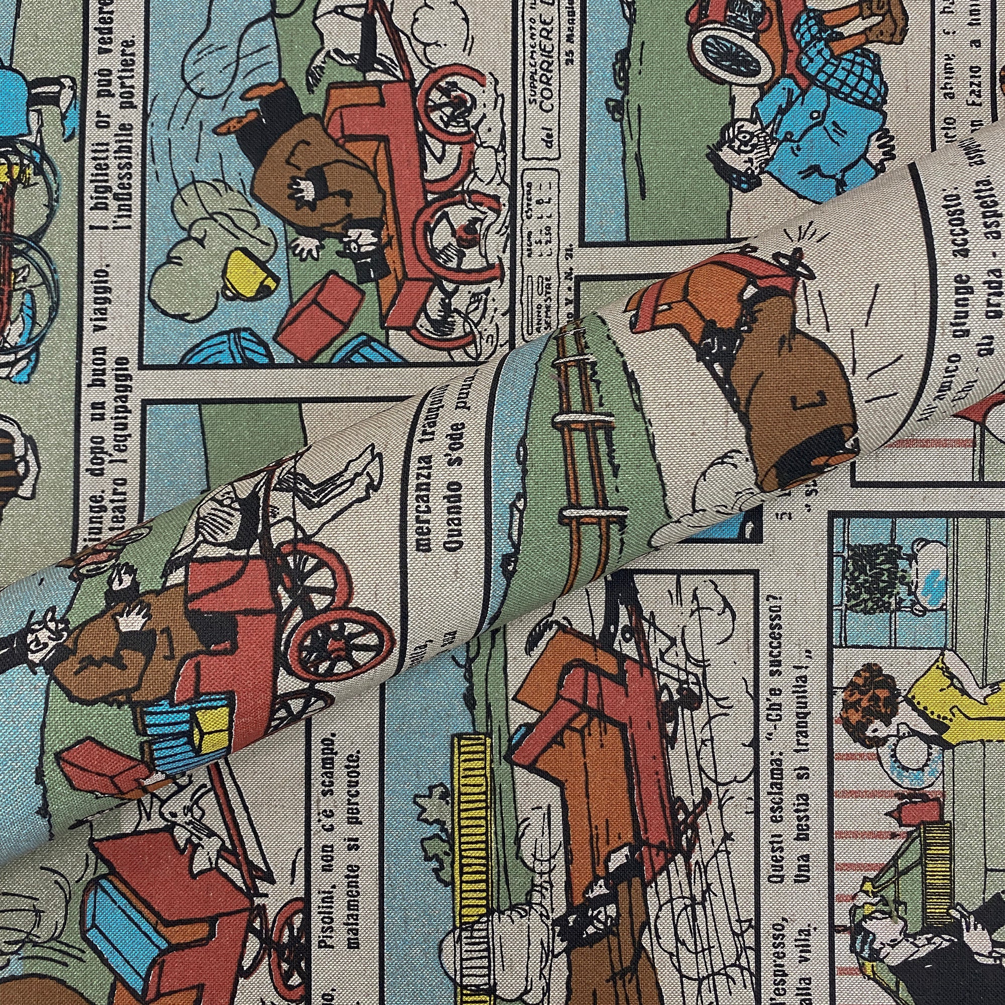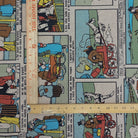 100% cotton upholstery fabric with a vintage comic print in primary colors.