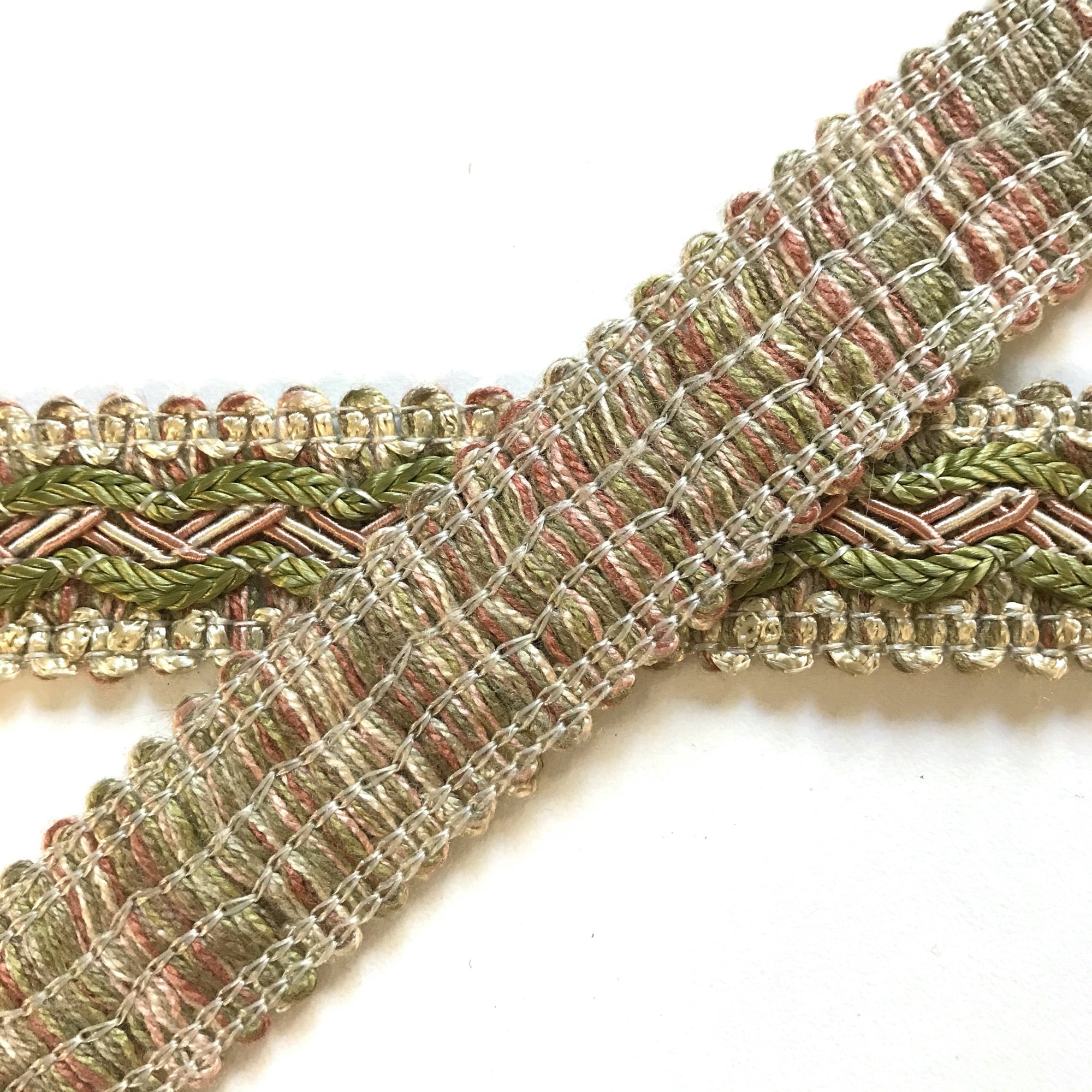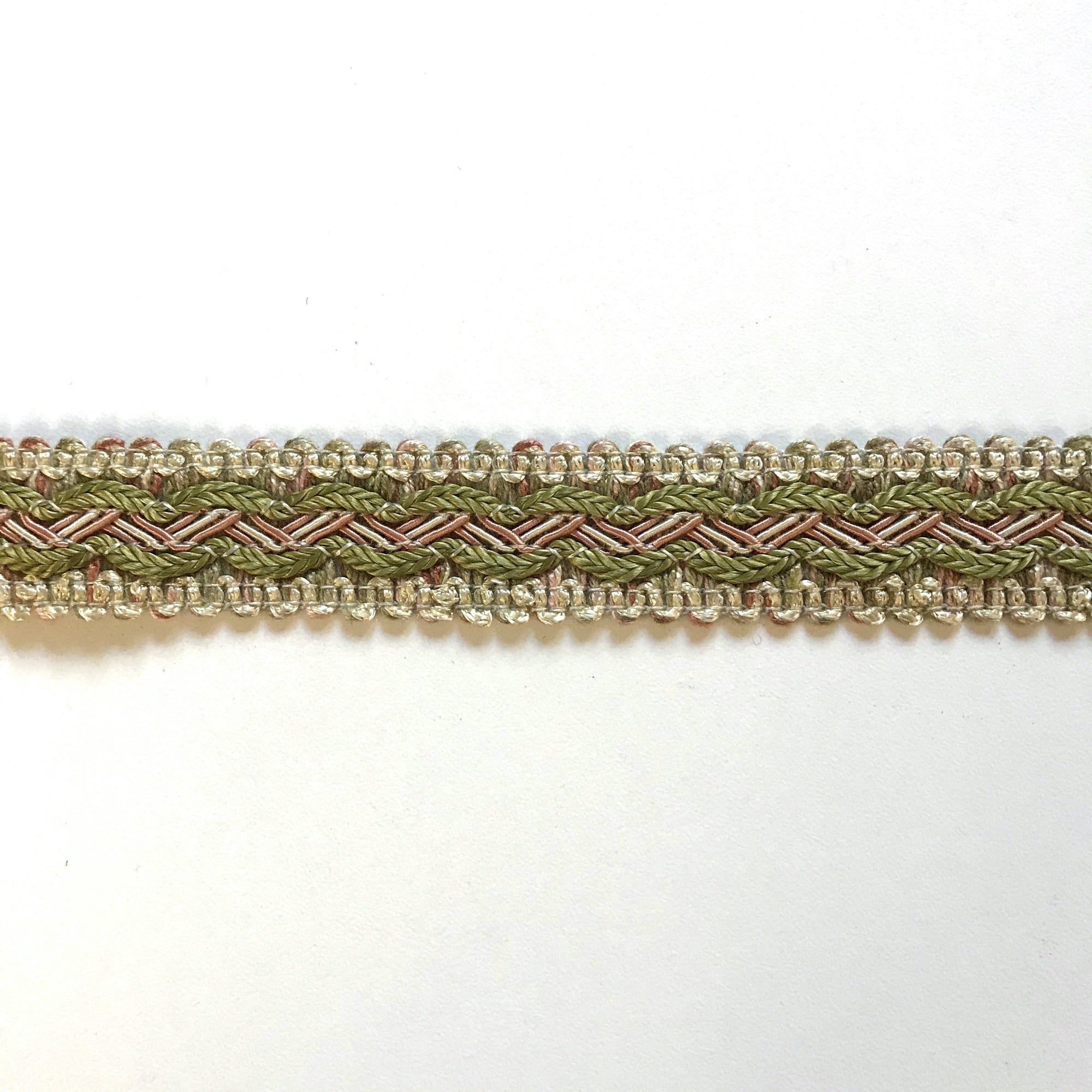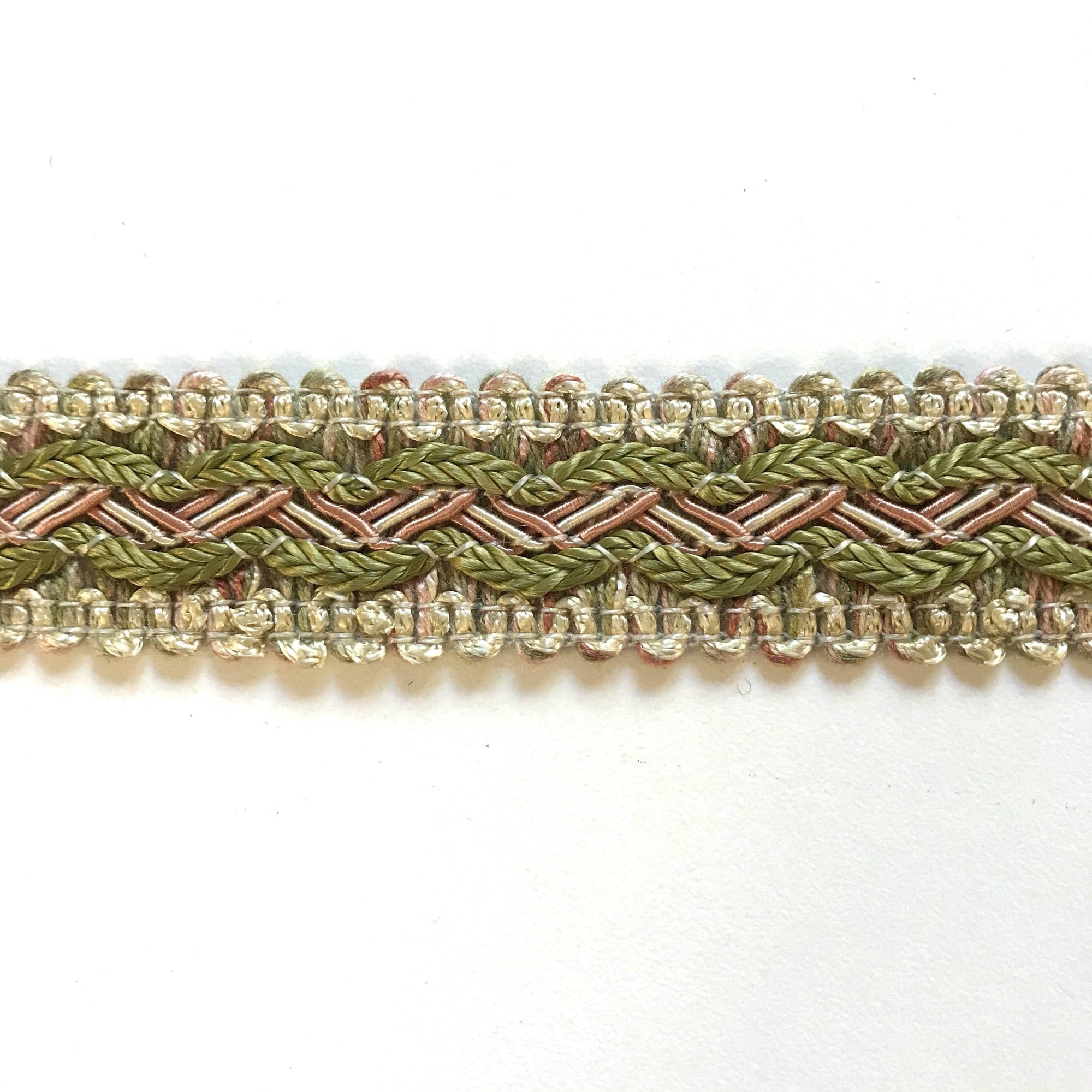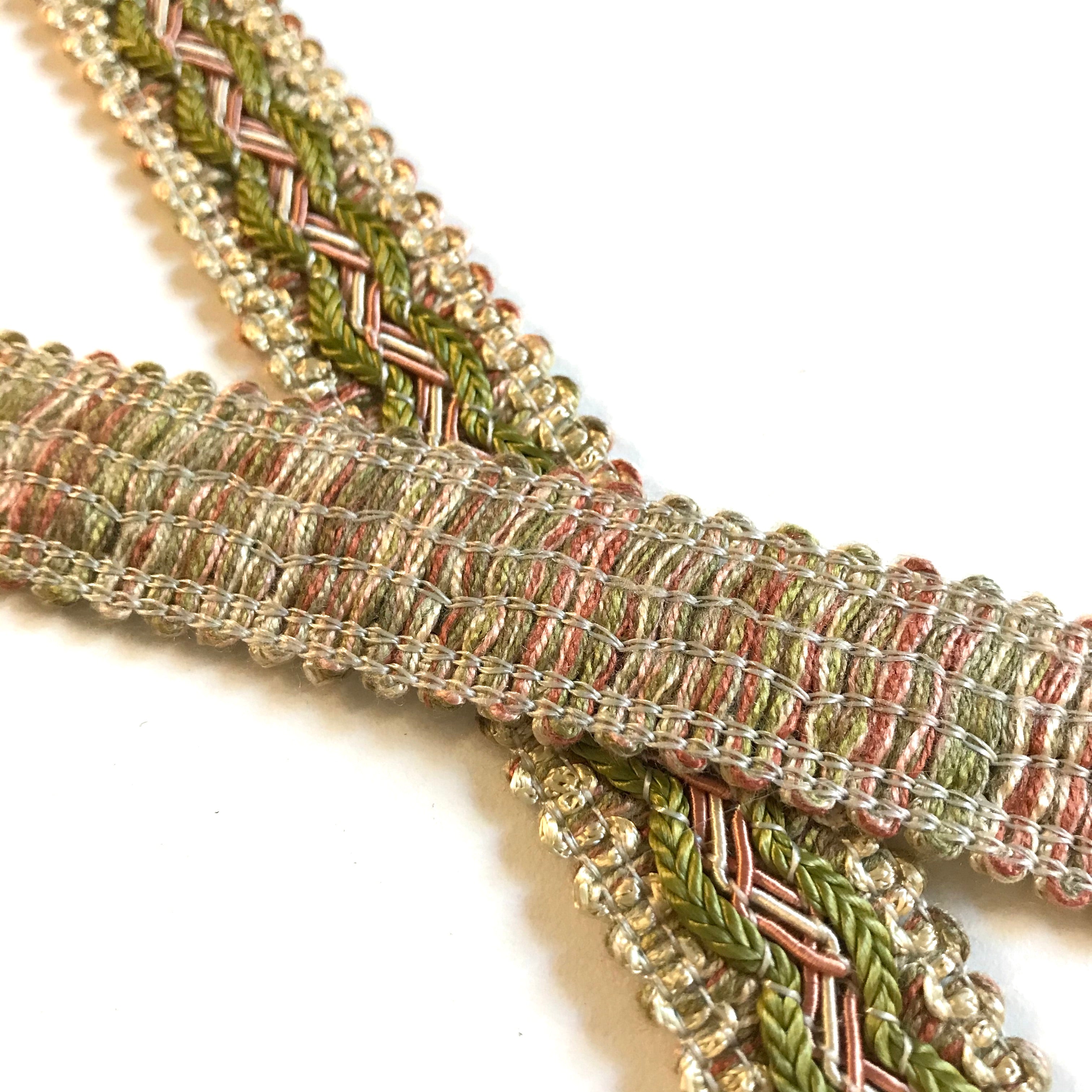 Decorative gimp trim with braided detail in chartreuse and dusty rose
