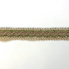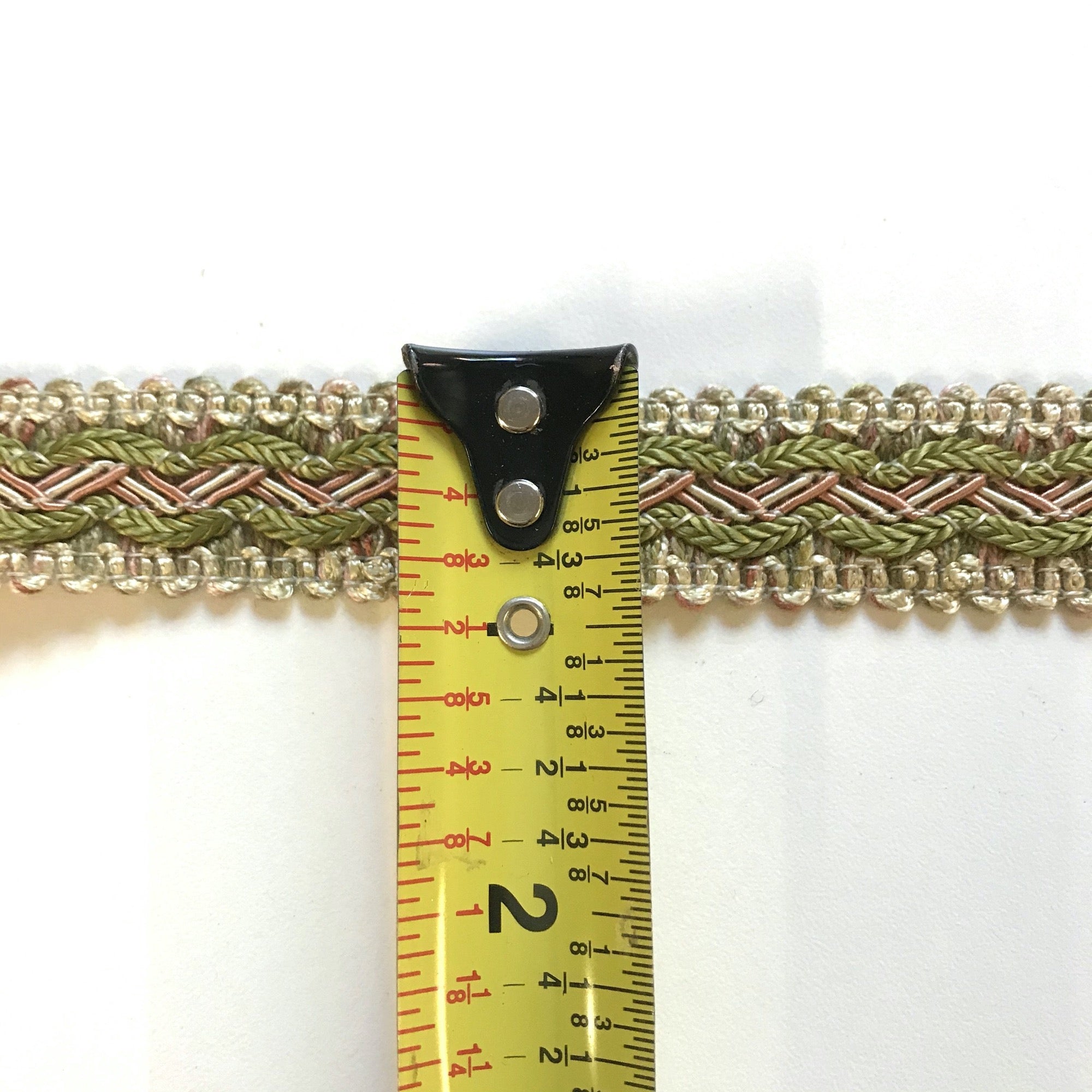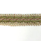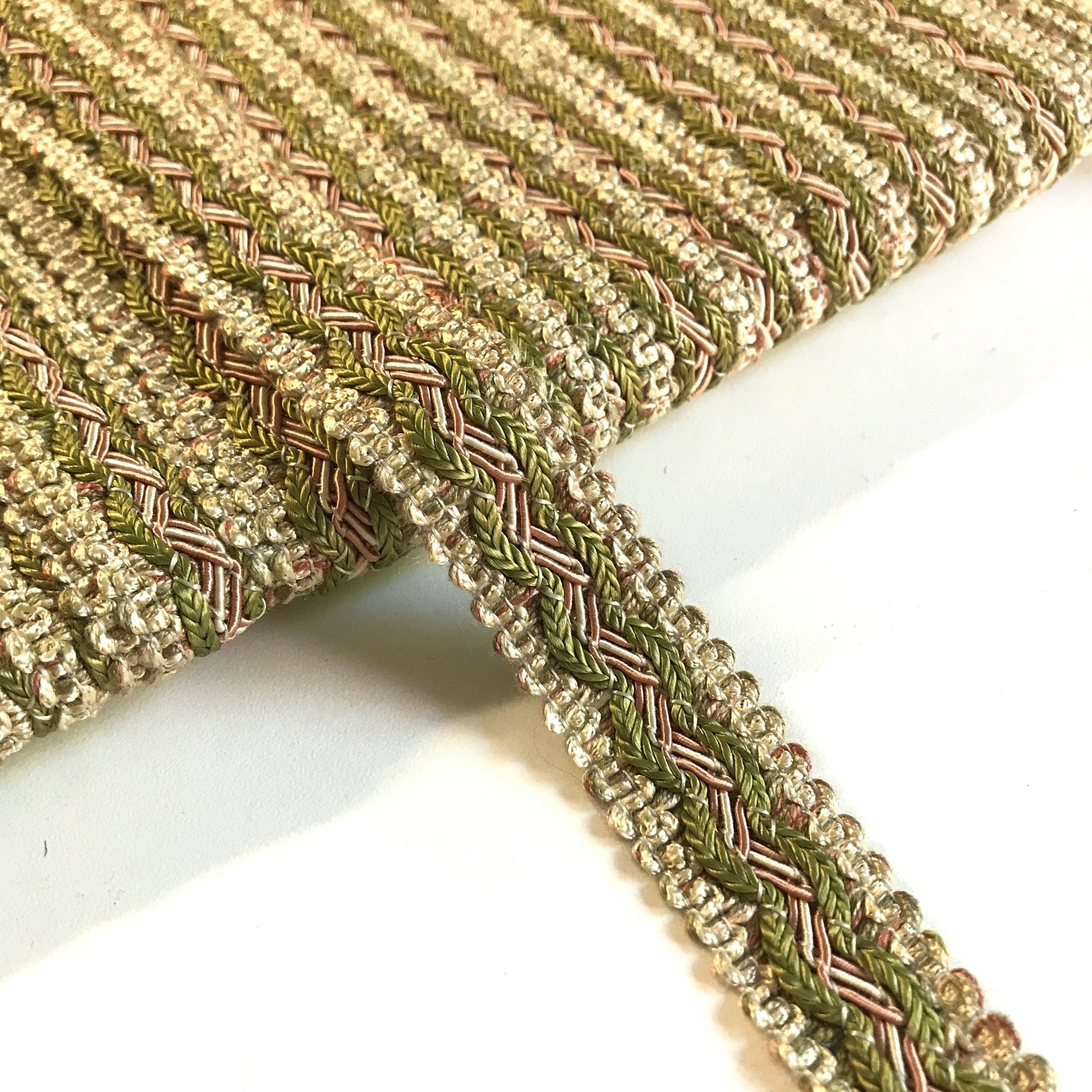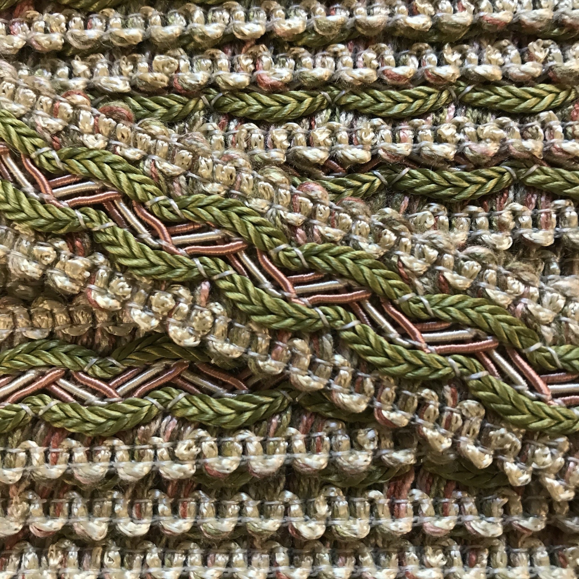 Decorative gimp trim with braided detail in chartreuse and dusty rose