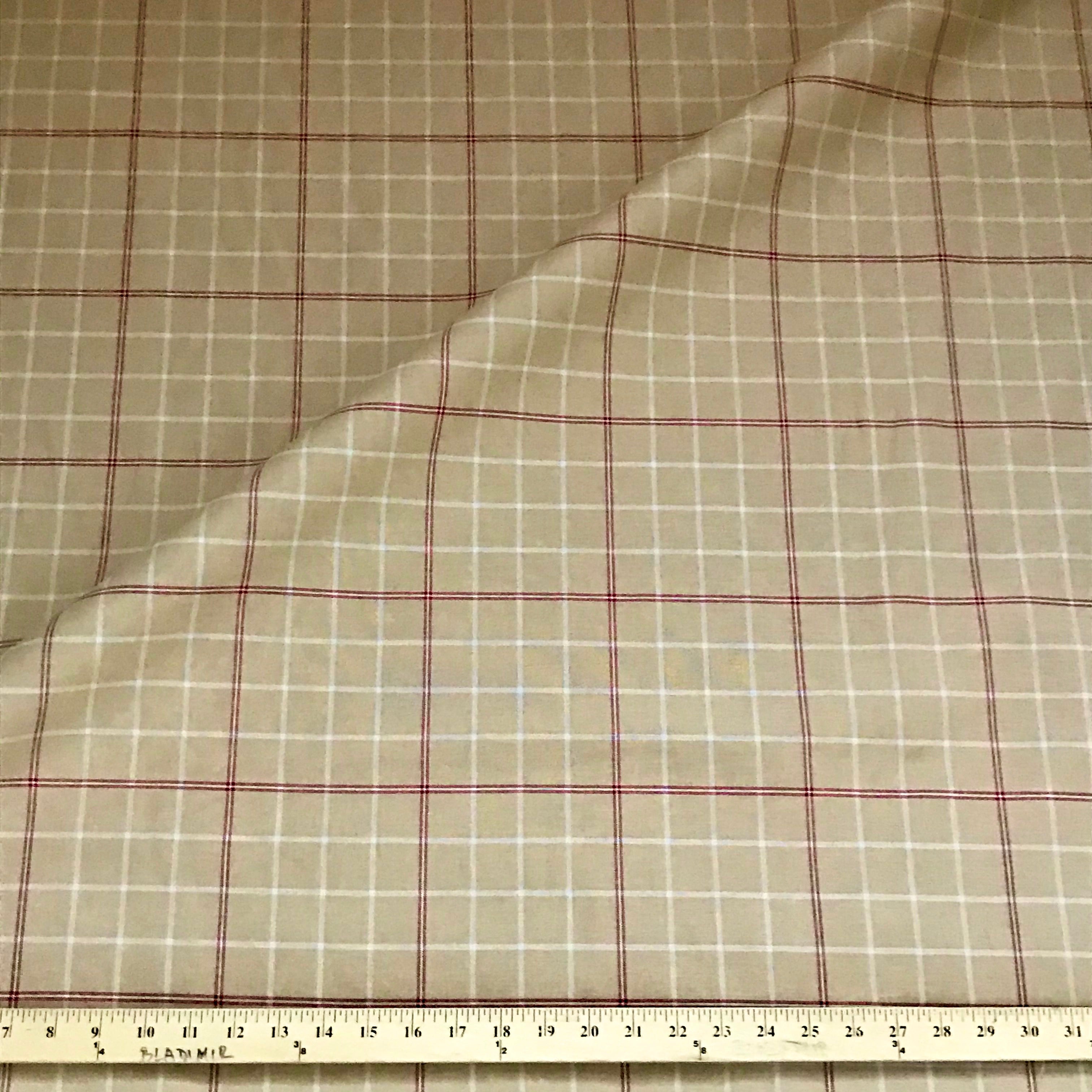 Beige base with white checkered design and opulent red stripes throughout embrace a masculine approach with this 100% cotton home decor fabric.