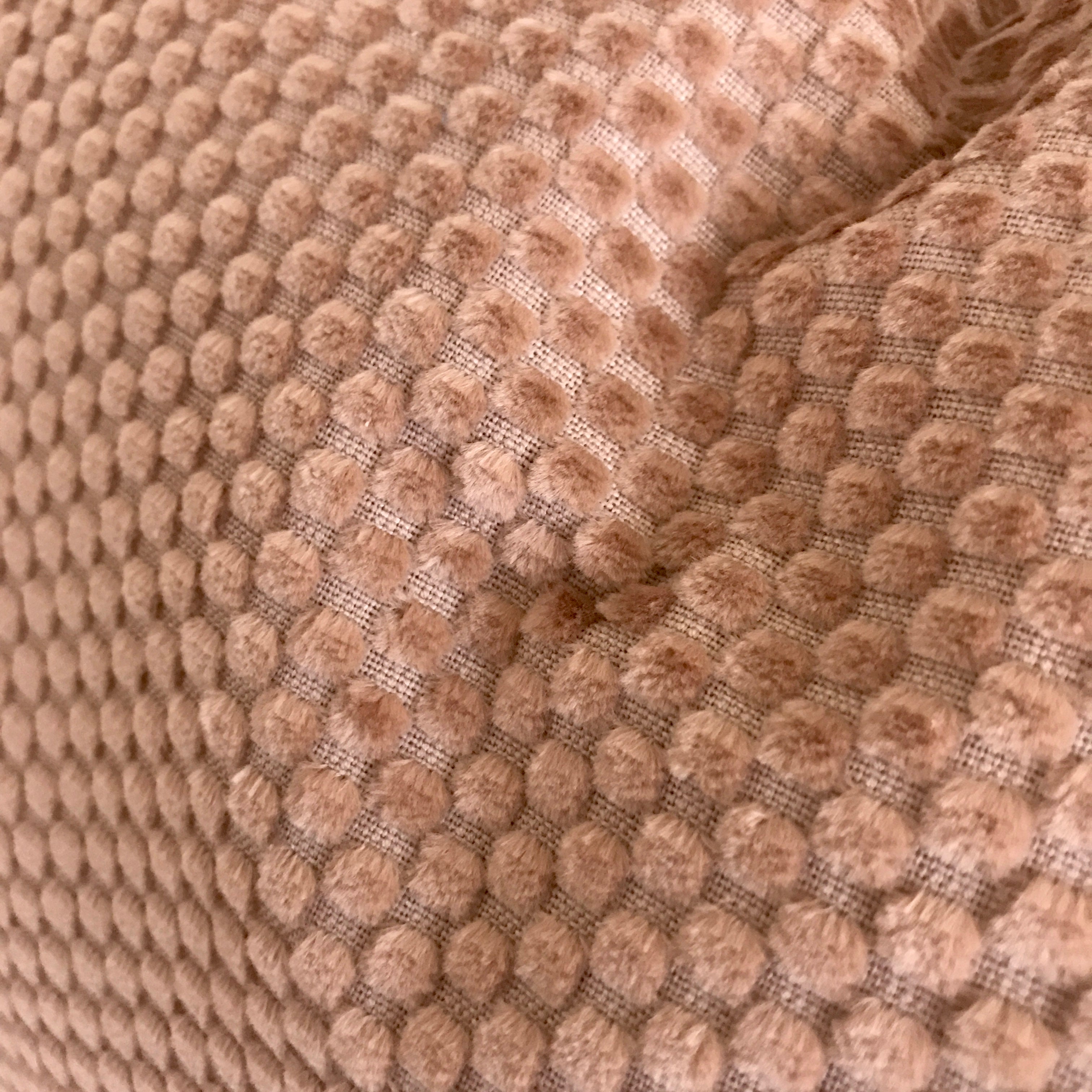 - Blush pink velvet with a subtle polka dot pattern adds a whimsical, elegant touch