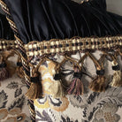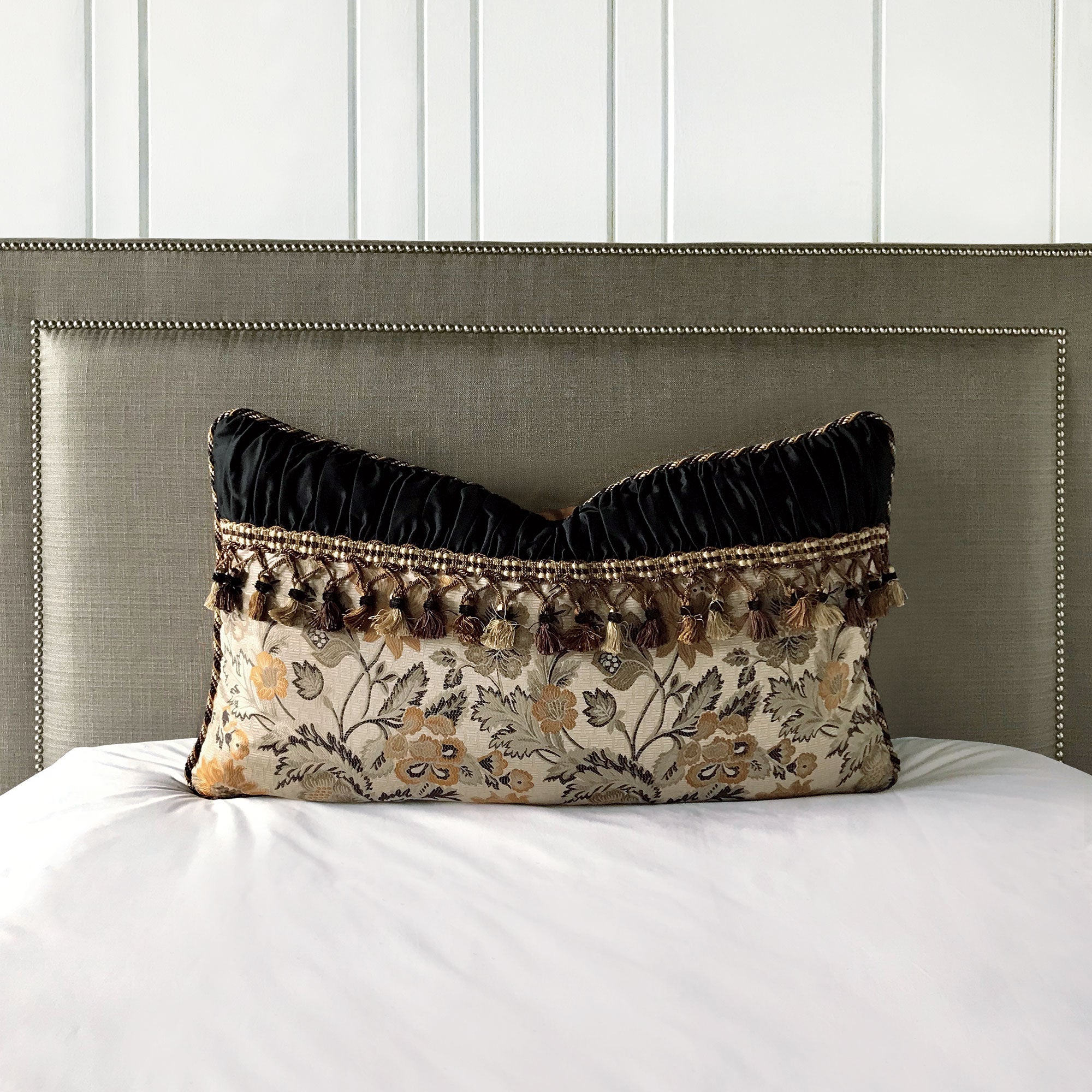 ⁌ Add opulent detail to your bedding with the Traditional Floral Tassel King Sham. This 21x37 decorative pillow sham features a woven floral fabric in metallic hues paired with black ruched fabric, elegantly lined with tassel trim. The reverse side is crafted from a golden copper solid fabric for a rich contrast, while a large coordinating cord trim frames the design. Finished with a hidden zipper for easy care, this sham is proudly made in the USA.