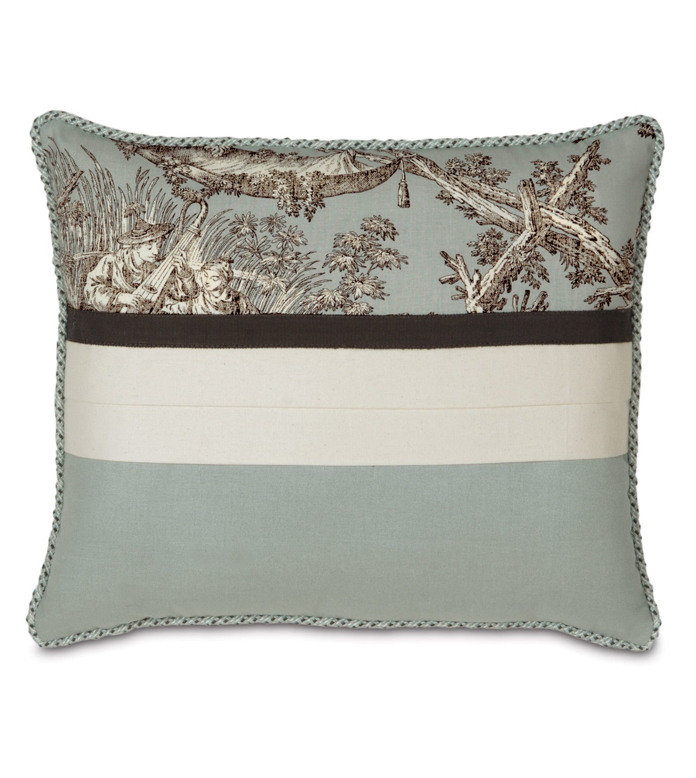 • Decorative pillow cover with a toile de jouy and stripe pattern in cool sage