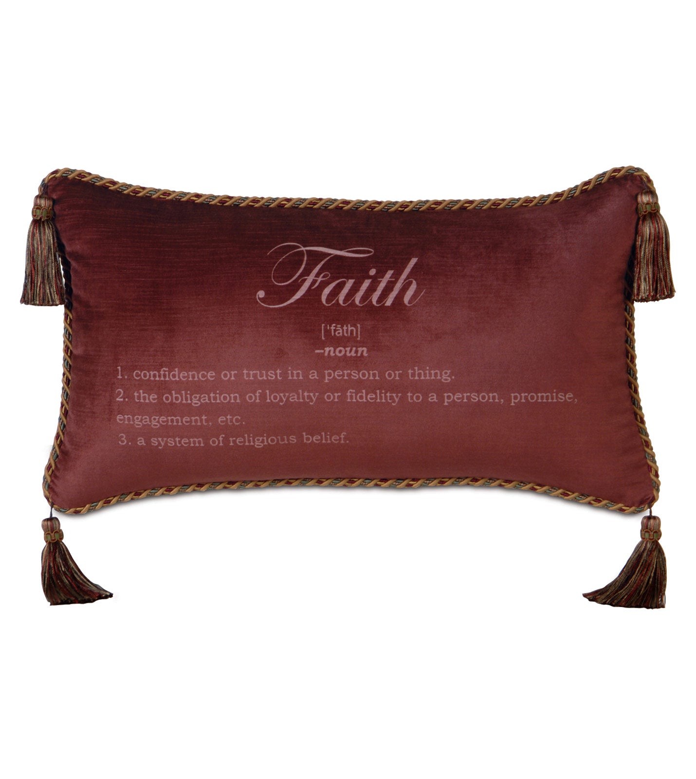 ⁌ Celebrate timeless values and add elegance to your home with the Poised Velvet "Faith" Lumbar Pillow Cover. Part of the Avant-Garde collection featuring themes of Love, Faith, Grace, and Dream, this 15x26 decorative pillow cover is crafted from rich red velvet with the "Faith" definition etched on the face. Designed with a cord edge finish and tassels on each corner, it exudes sophistication and charm. Self-backed for a seamless look, and finished with a hidden zipper closure, this inspirational pillow cover is proudly made in the USA.