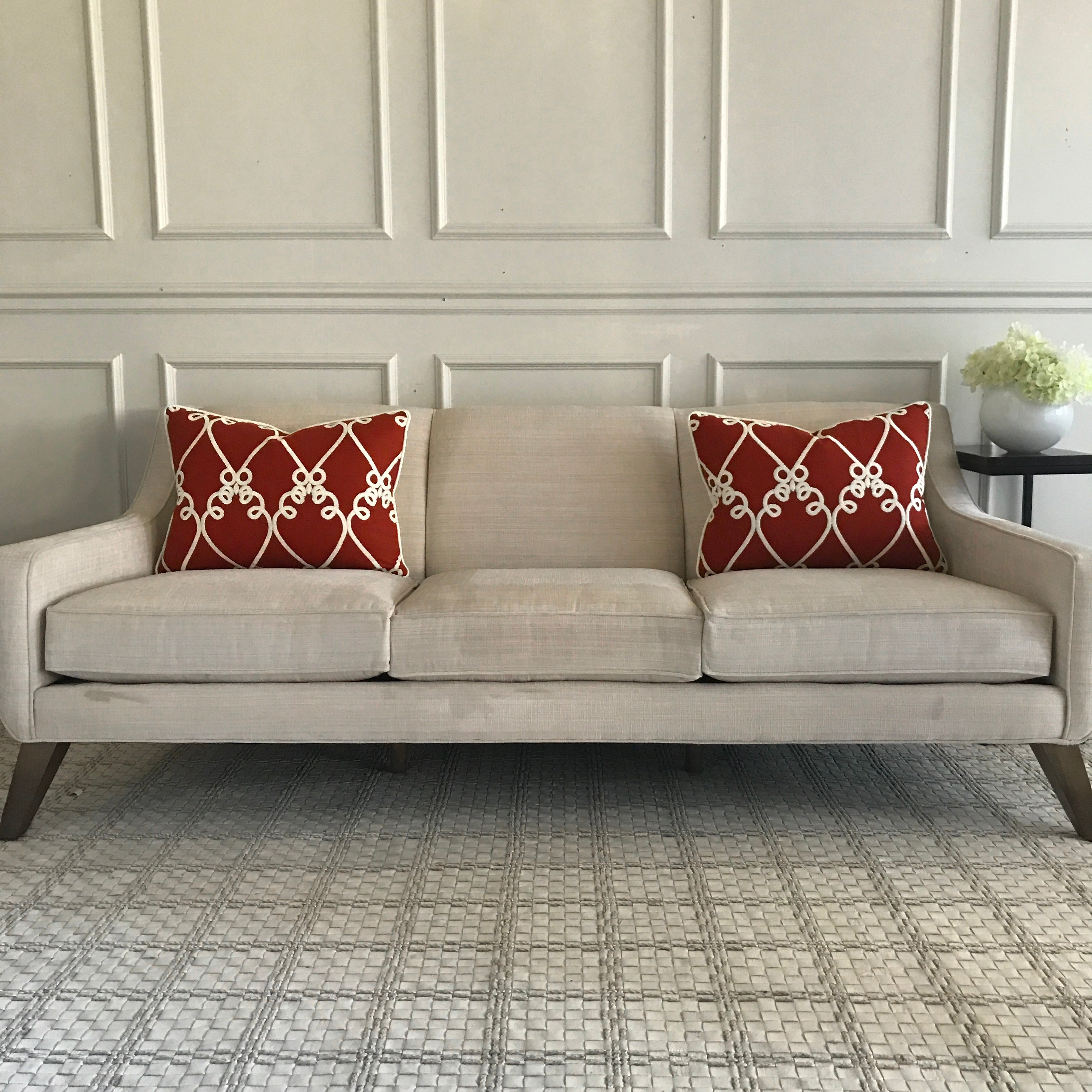• Red linen front with white geometric embroidery for a sophisticated accent