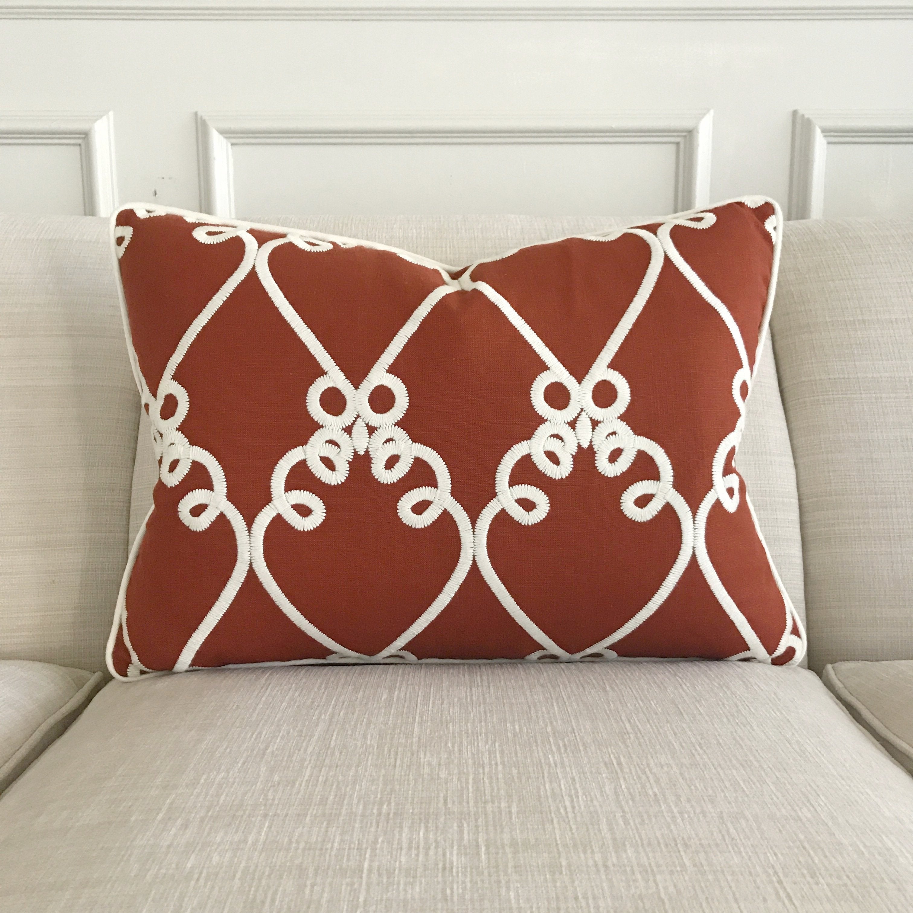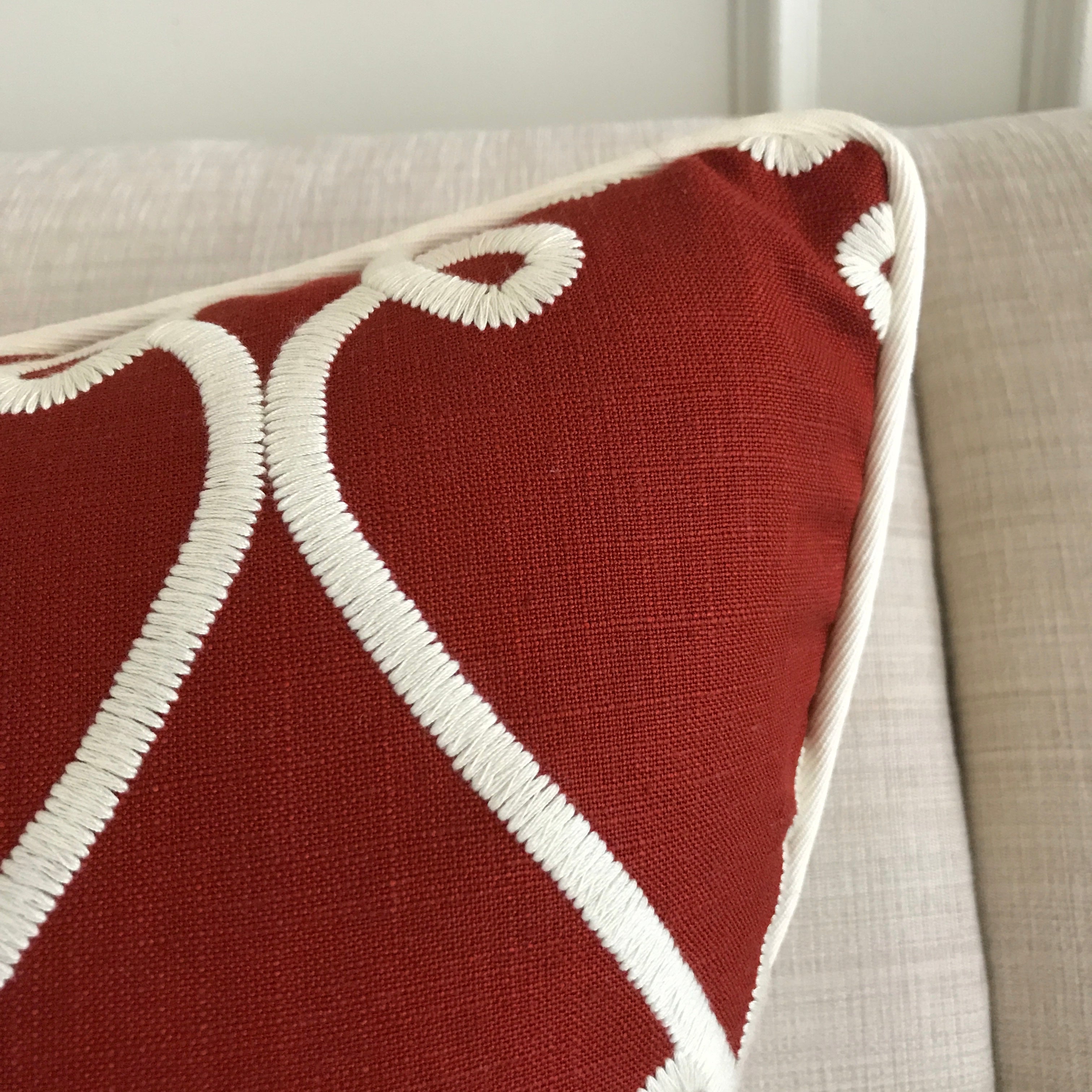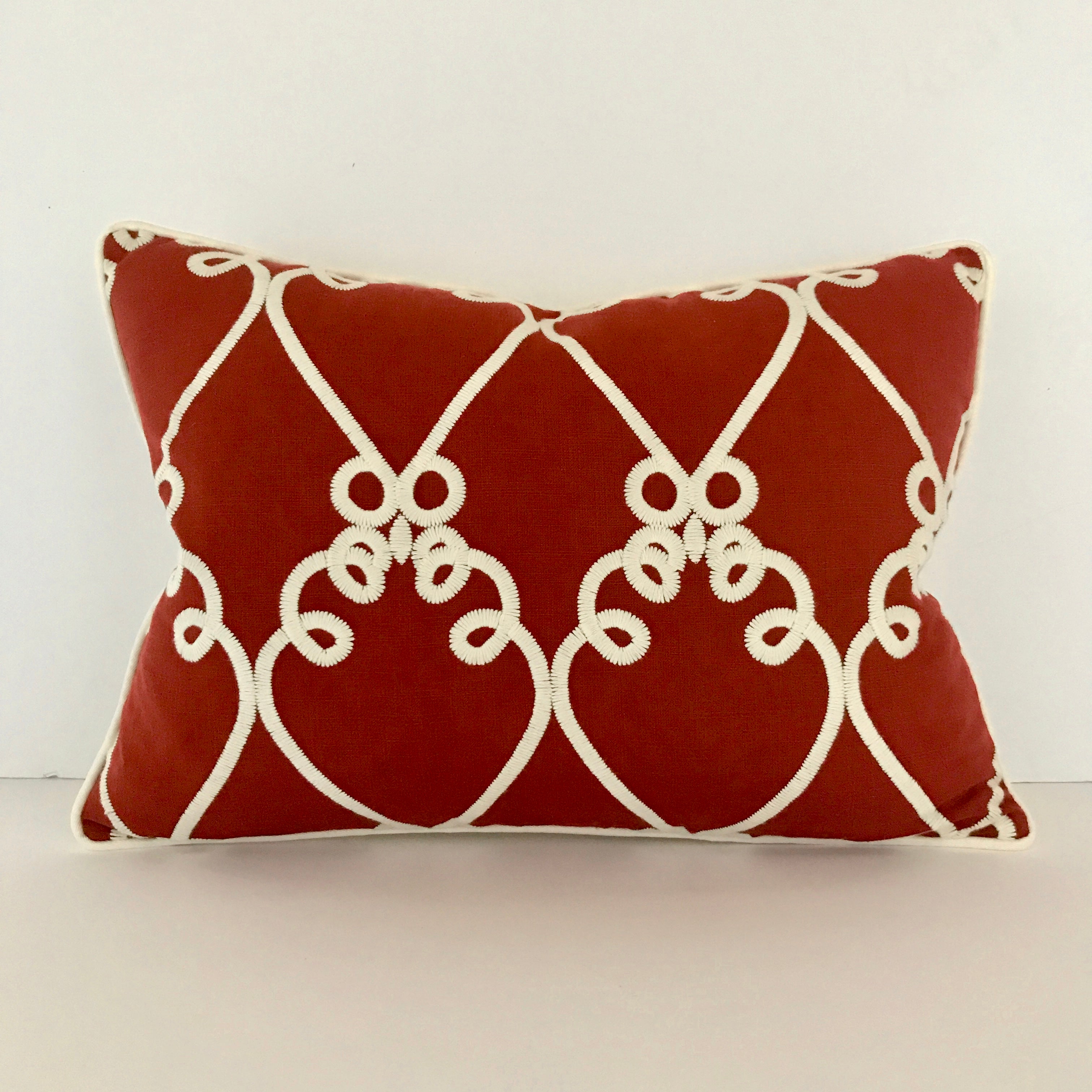 ⁌ Add a vibrant, artful touch to your decor with the Red Embroidered Linen Welt Trim Lumbar Pillow Cover. This 16x22 pillow cover features a striking red linen front with a crisp embroidered white geometric pattern, creating a dynamic and sophisticated accent for any room. The backside, made from durable white sailcloth, adds a subtle contrast, while the cord edge finish enhances the cover’s tailored look. Perfect for layering on sofas, beds, or accent chairs, this pillow cover adds an eye-catching yet refined pop of color.