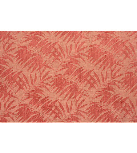Description: Coral and peach colored fabric with palm tree motif in a Jacquard weave design. To be used for light upholstery and bedding.