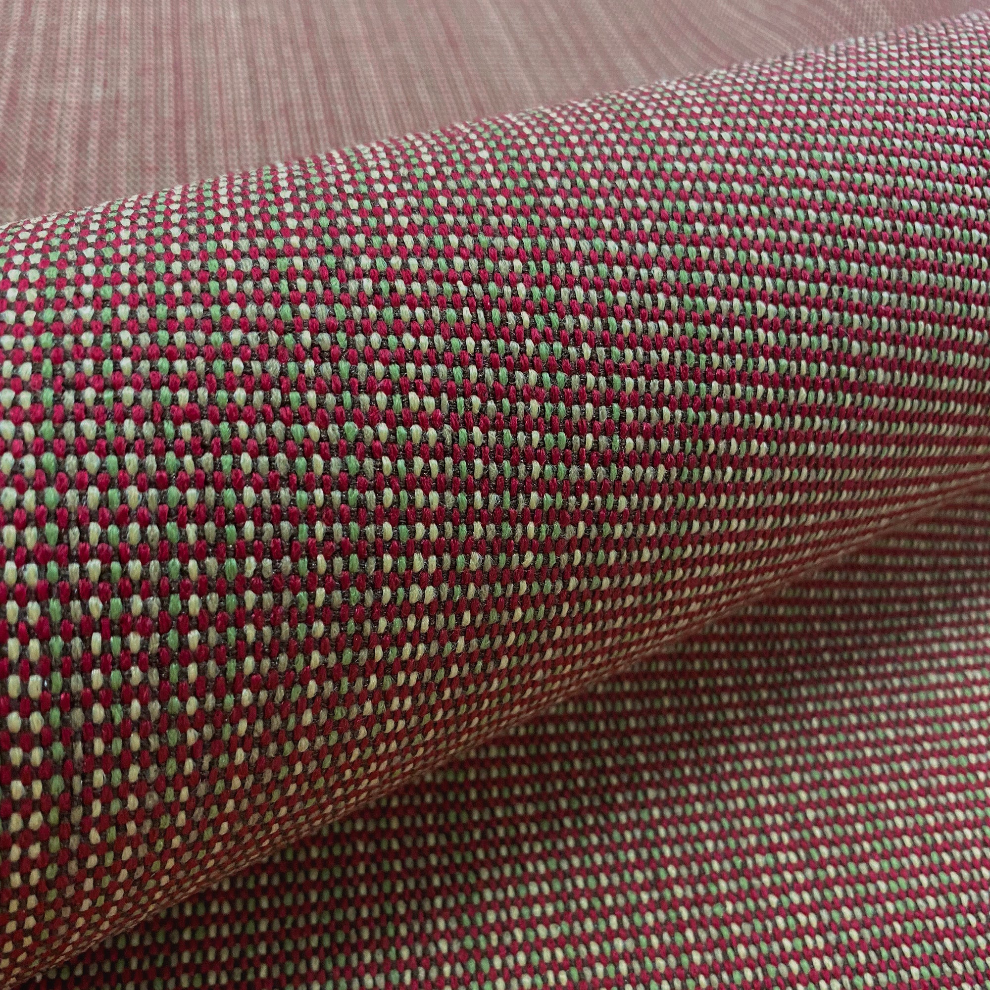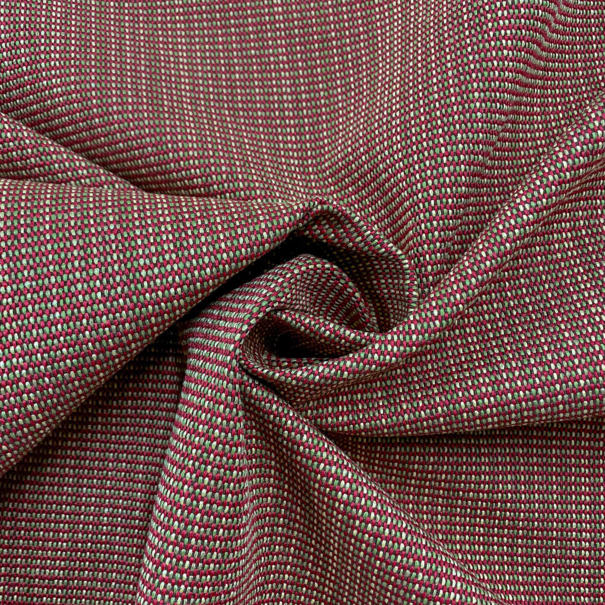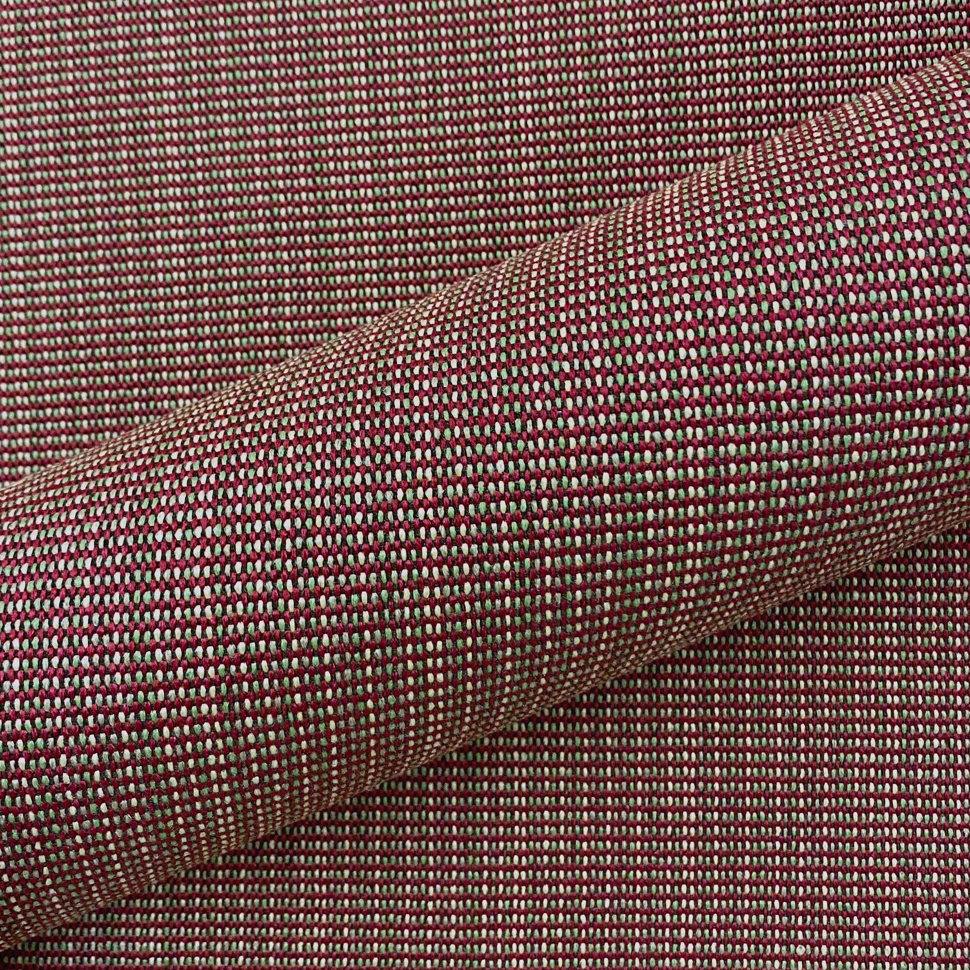This luxurious woven upholstery fabric in scarlet has green and ivory threads throughout. It meets flair with versatility, offering the perfect personal touch for any farmhouse aesthetic. Designed and crafted by skilled textile artisans this fabric is made to last and never compromises on quality. All fabric is sold by the yard in 1-yard increments. Unfortunately, we do not accept returns on fabric orders but swatches are available.