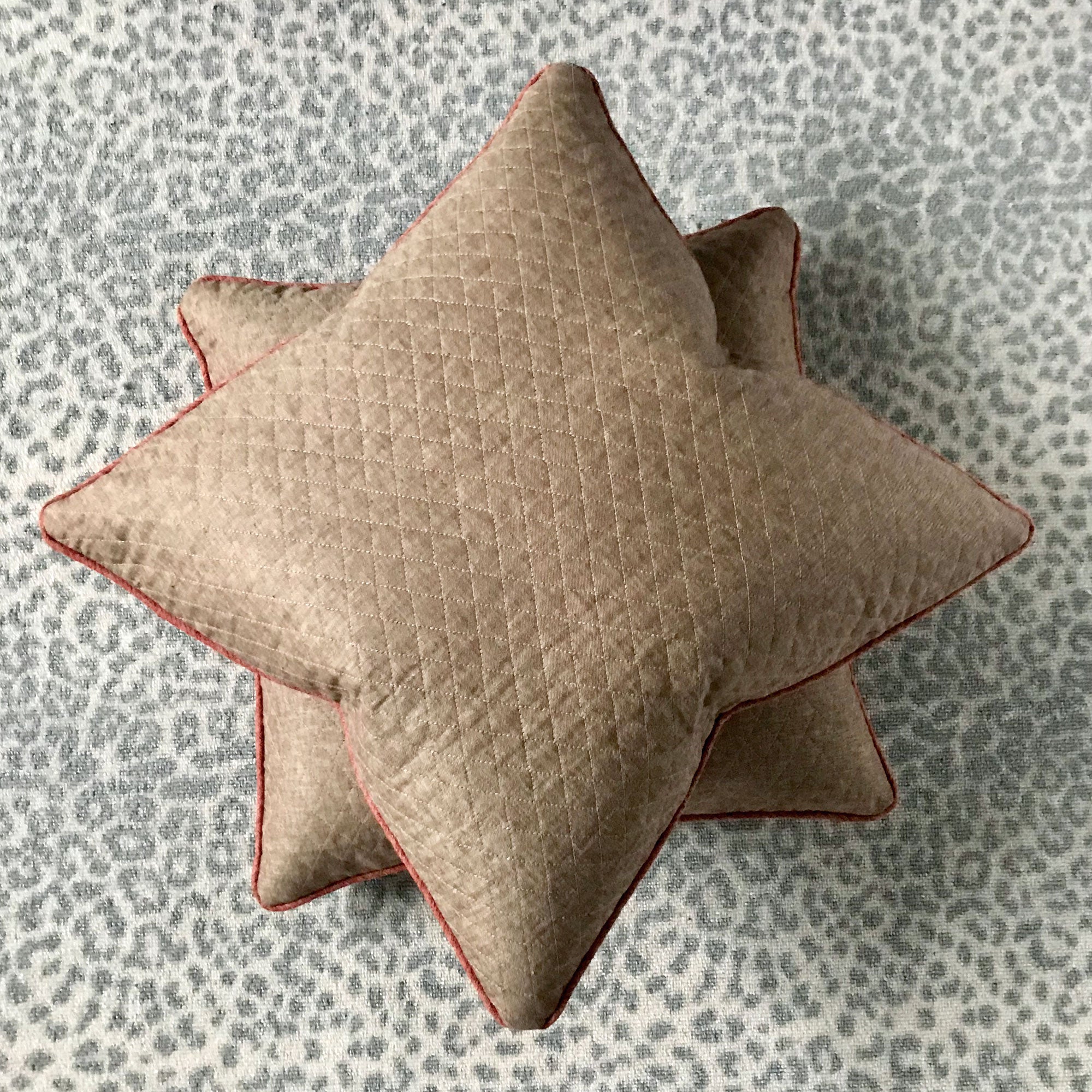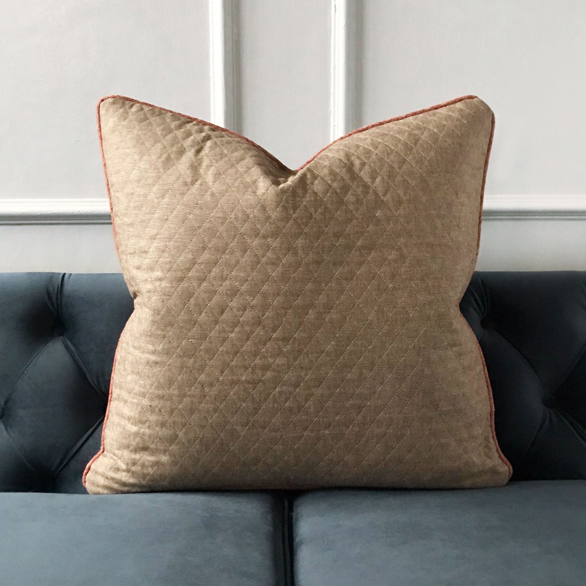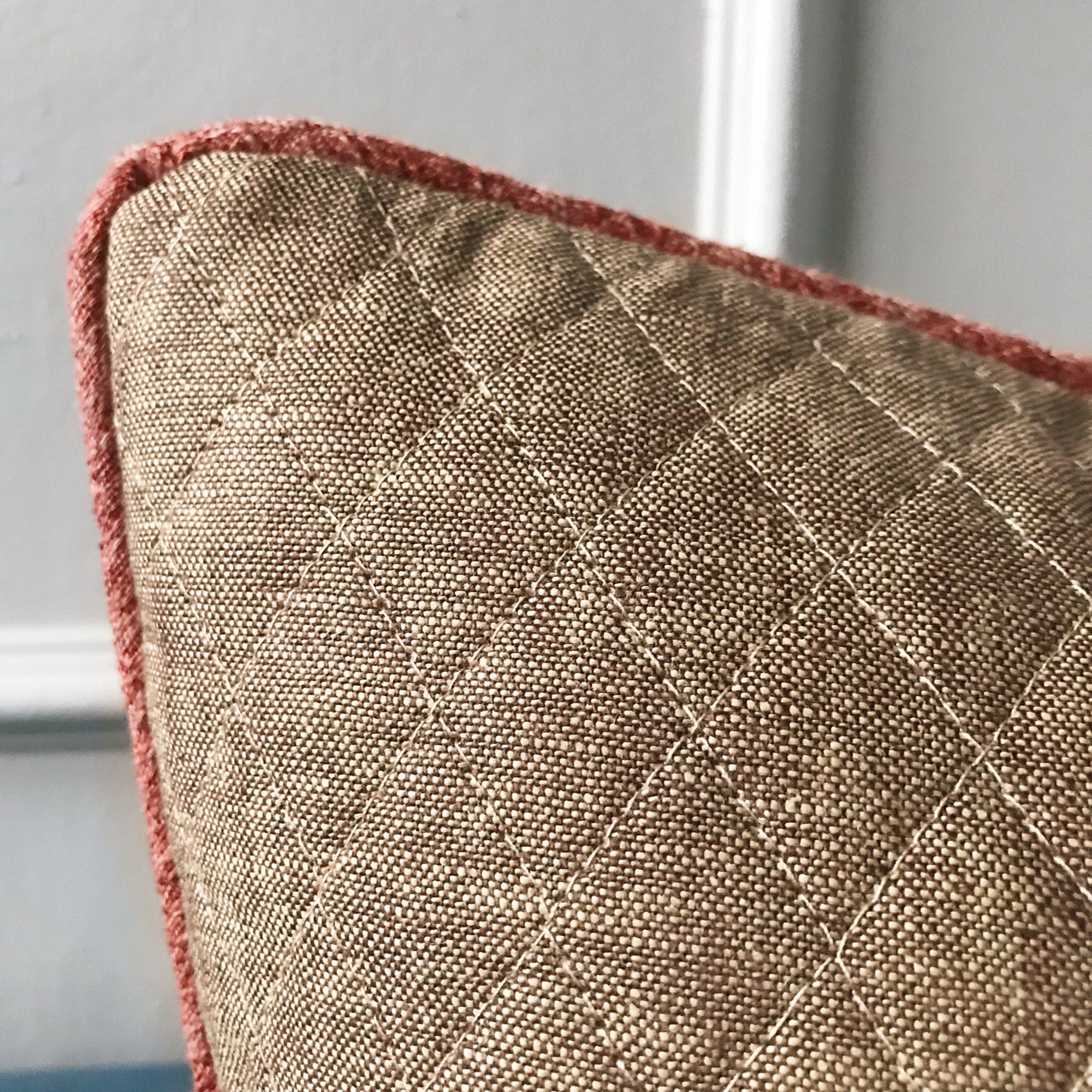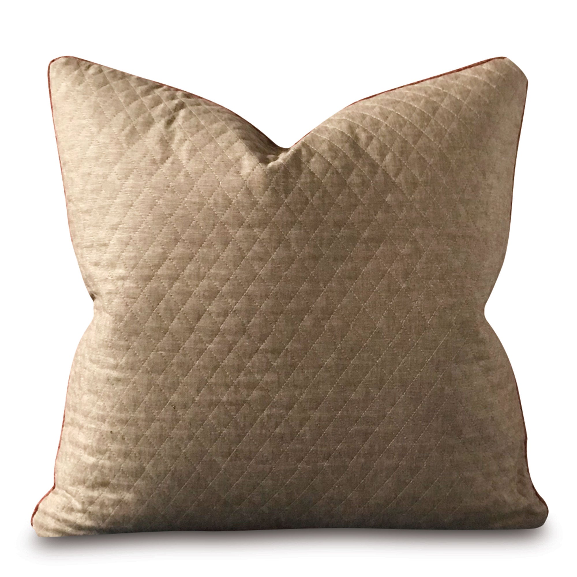 ⁌ Elevate your space with the tailored elegance of this Light Brown Top-Stitch Quilted Throw Pillow Cover. Featuring a detailed diamond top-stitch pattern that mimics the texture of a quilted finish, this 22x22 pillow cover adds warmth and dimension to any interior. The design is self-backed and accented with a refined salmon-colored welt edge for subtle contrast. Made in the USA and finished with a hidden zipper, this cover blends craftsmanship with understated sophistication.