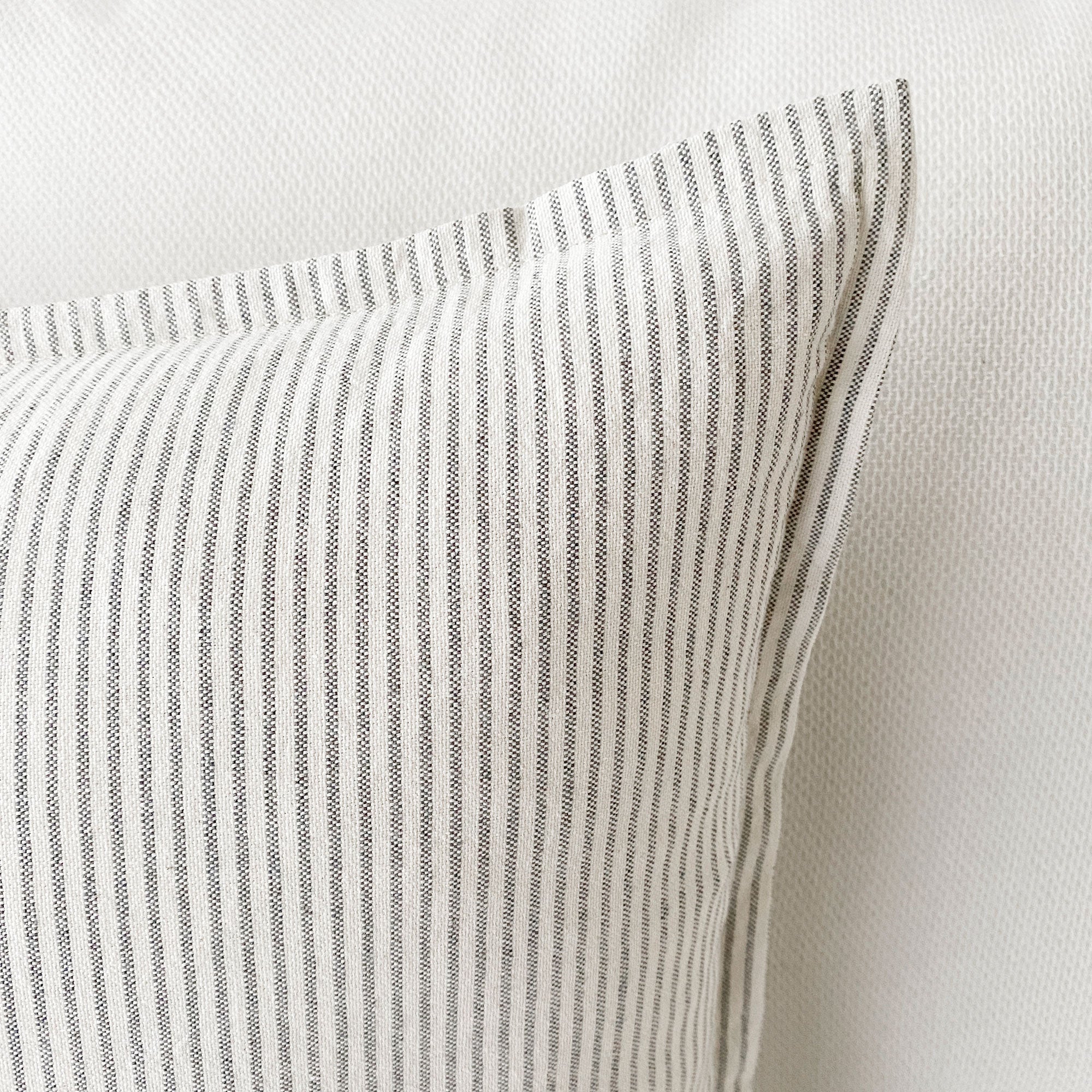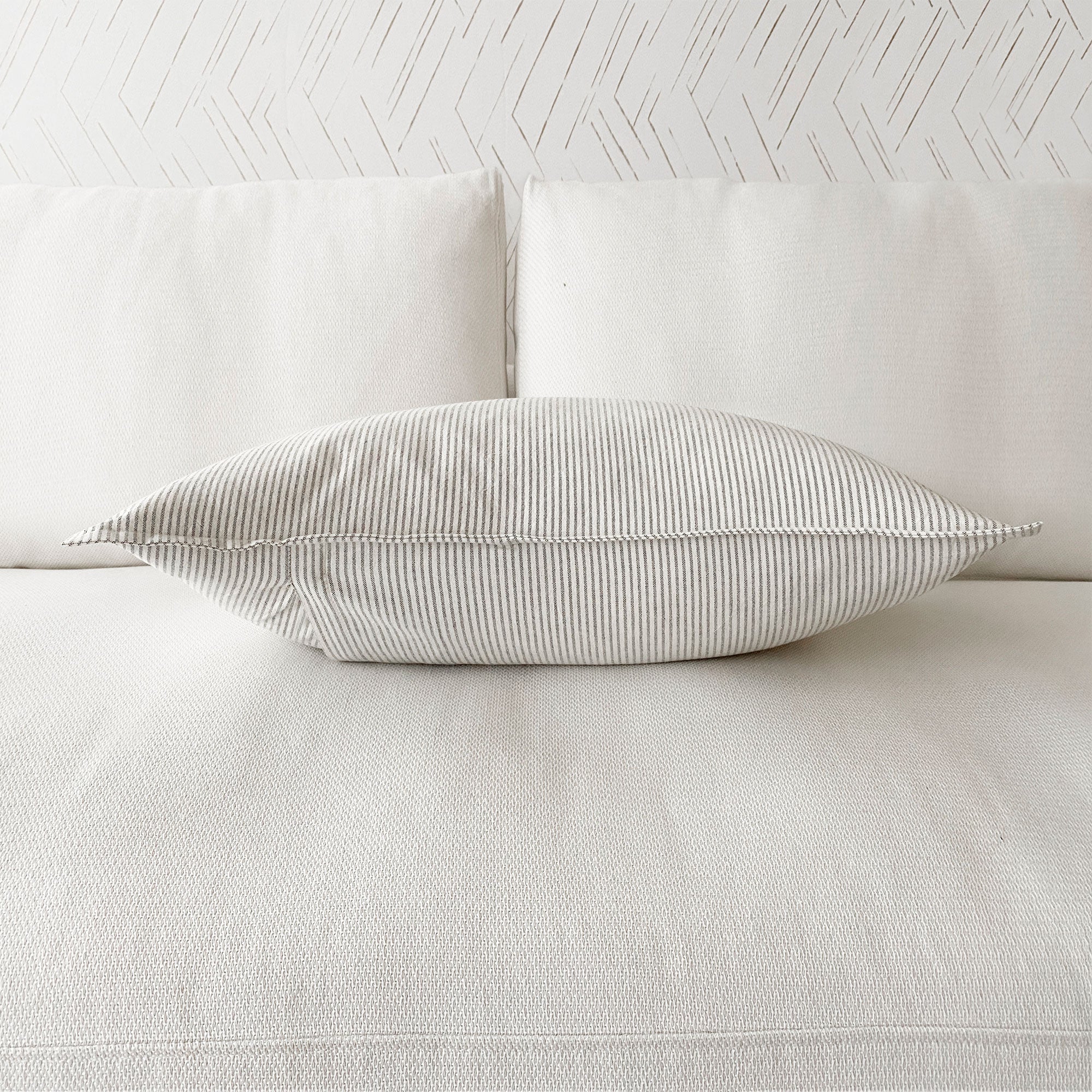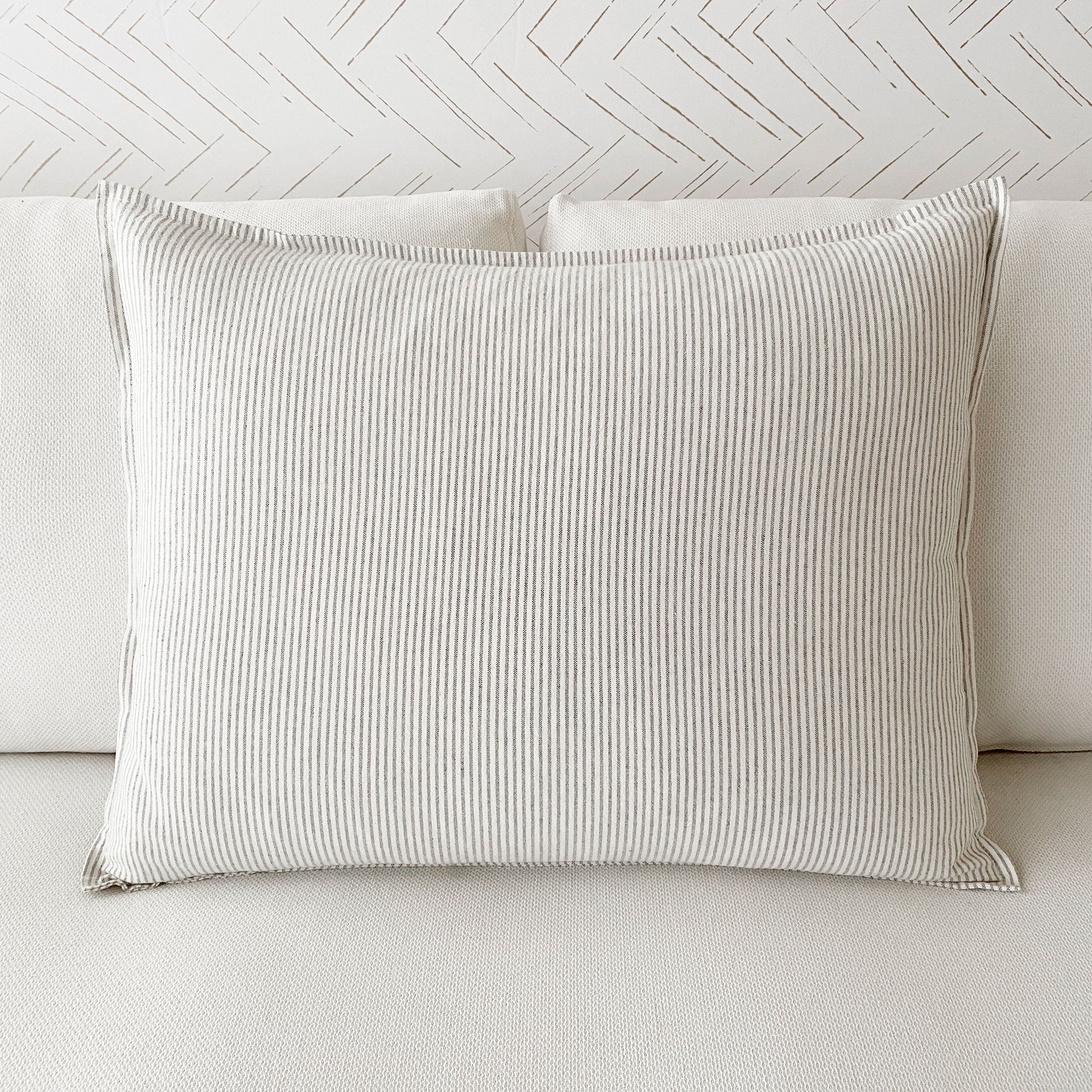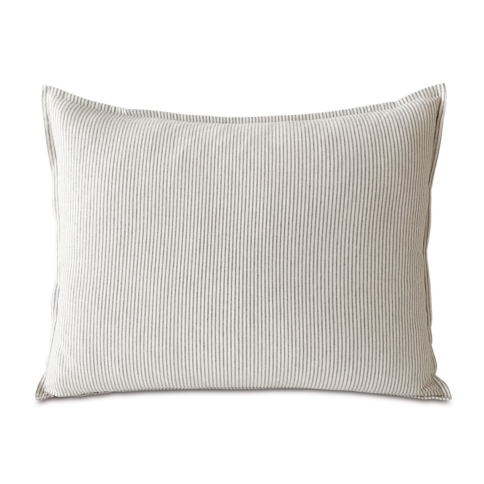 ⁌ Add timeless style to your bedding with the Pewter Stripe Standard Sham. This 20x26 sham features a classic neutral stripe pattern for a versatile, tailored look. Designed with a self-backed construction for a seamless finish and a self-flange edge for subtle sophistication, it blends durability with elegance. The flap closure allows for easy insert placement, and its machine washable fabric ensures effortless care. Proudly made in the USA.