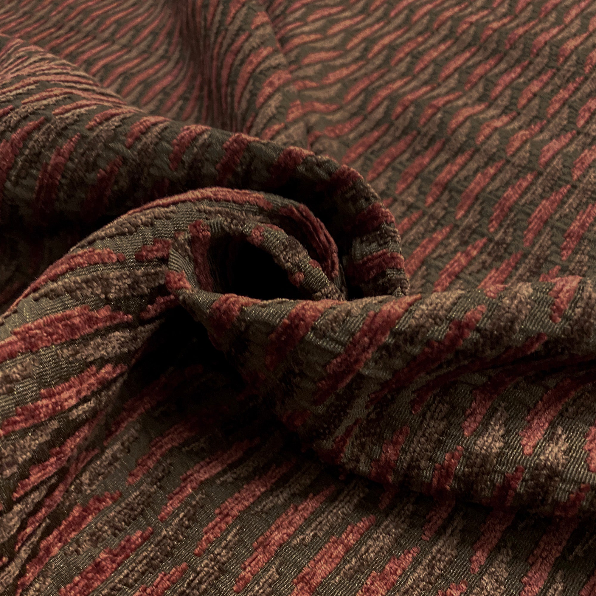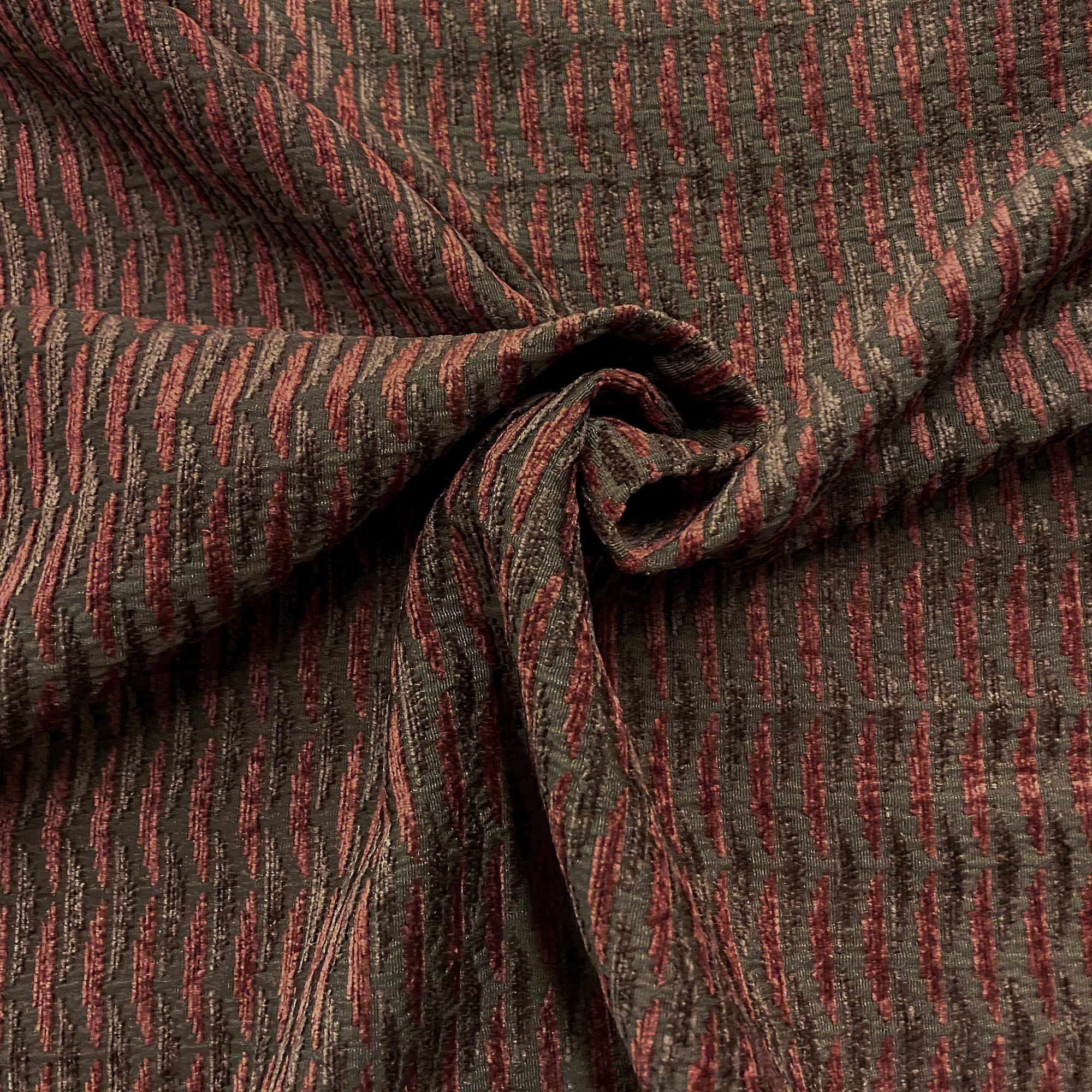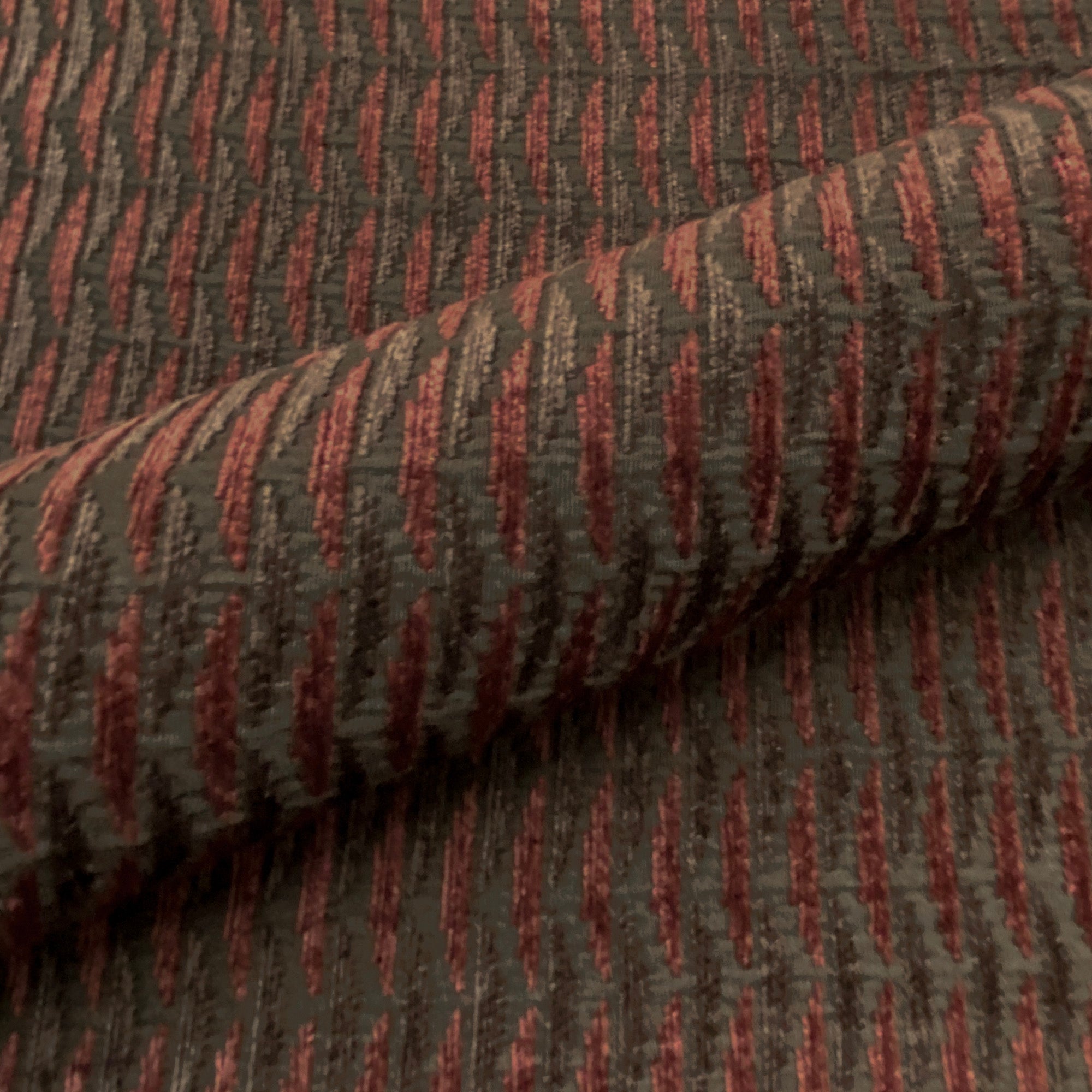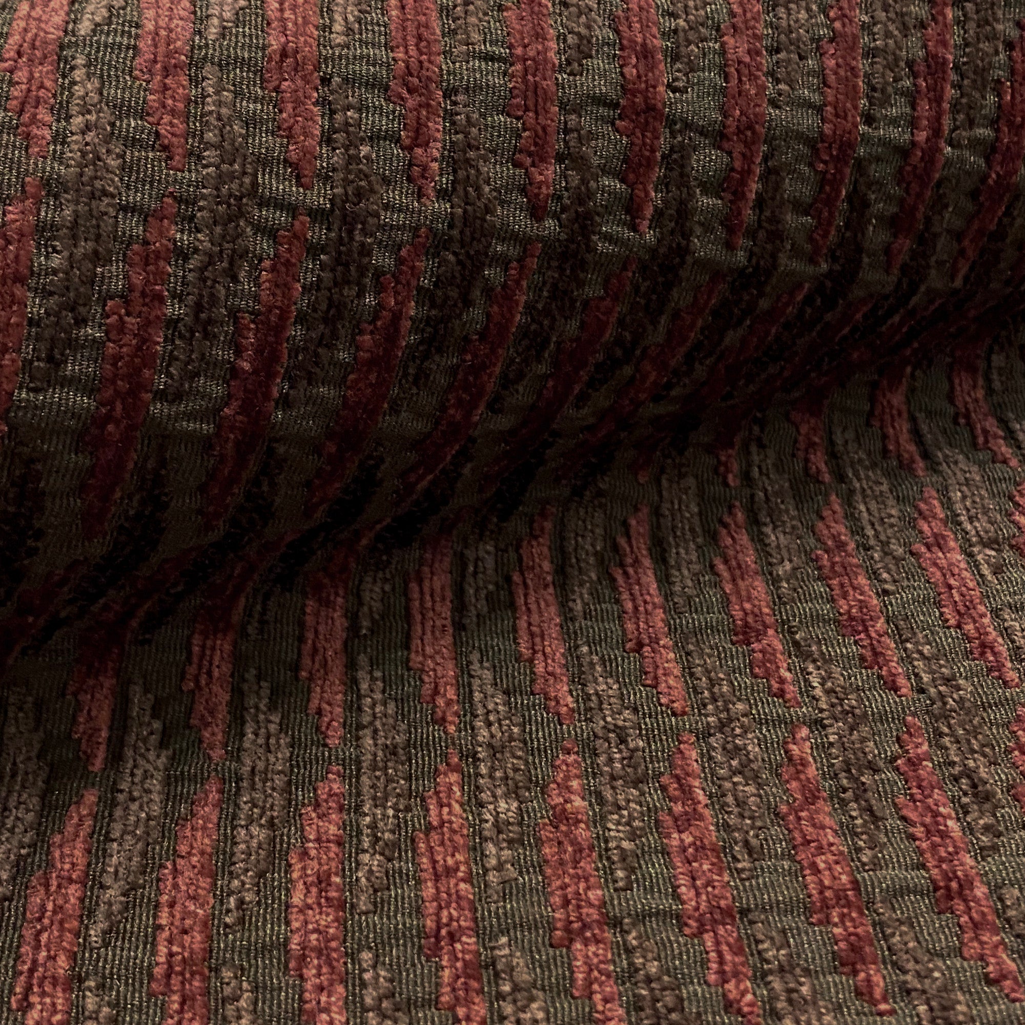 This luxurious raised geometric chenille upholstery fabric in red and brown meets flair with versatility, offering the perfect personal touch for any safari aesthetic. Designed and crafted by skilled textile artisans this fabric is made to last and never compromises on quality. All fabric is sold by the yard in 1-yard increments. Unfortunately, we do not accept returns on fabric orders but swatches are available.