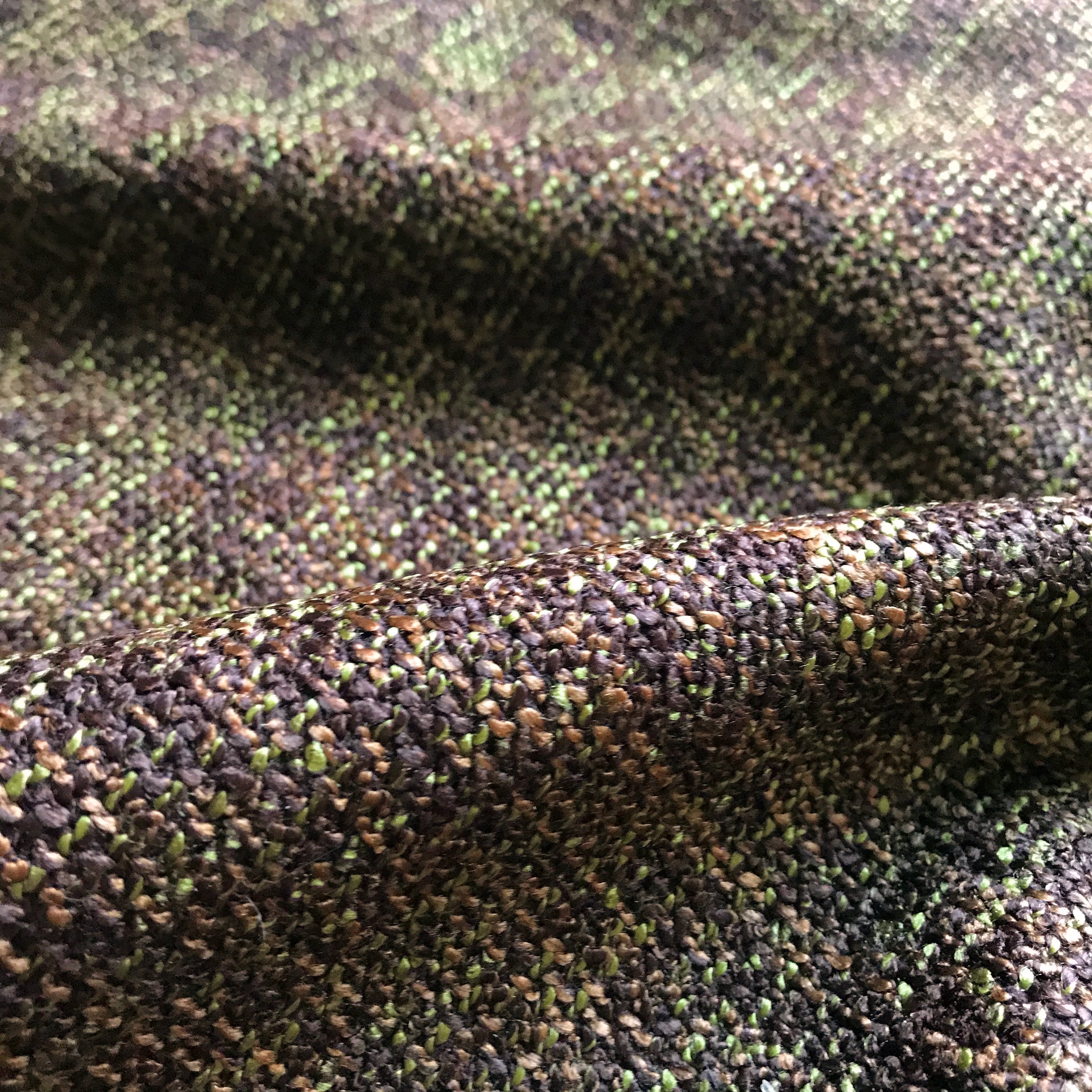 Woven, textured fabric with twisted brown/caramel and green threads.