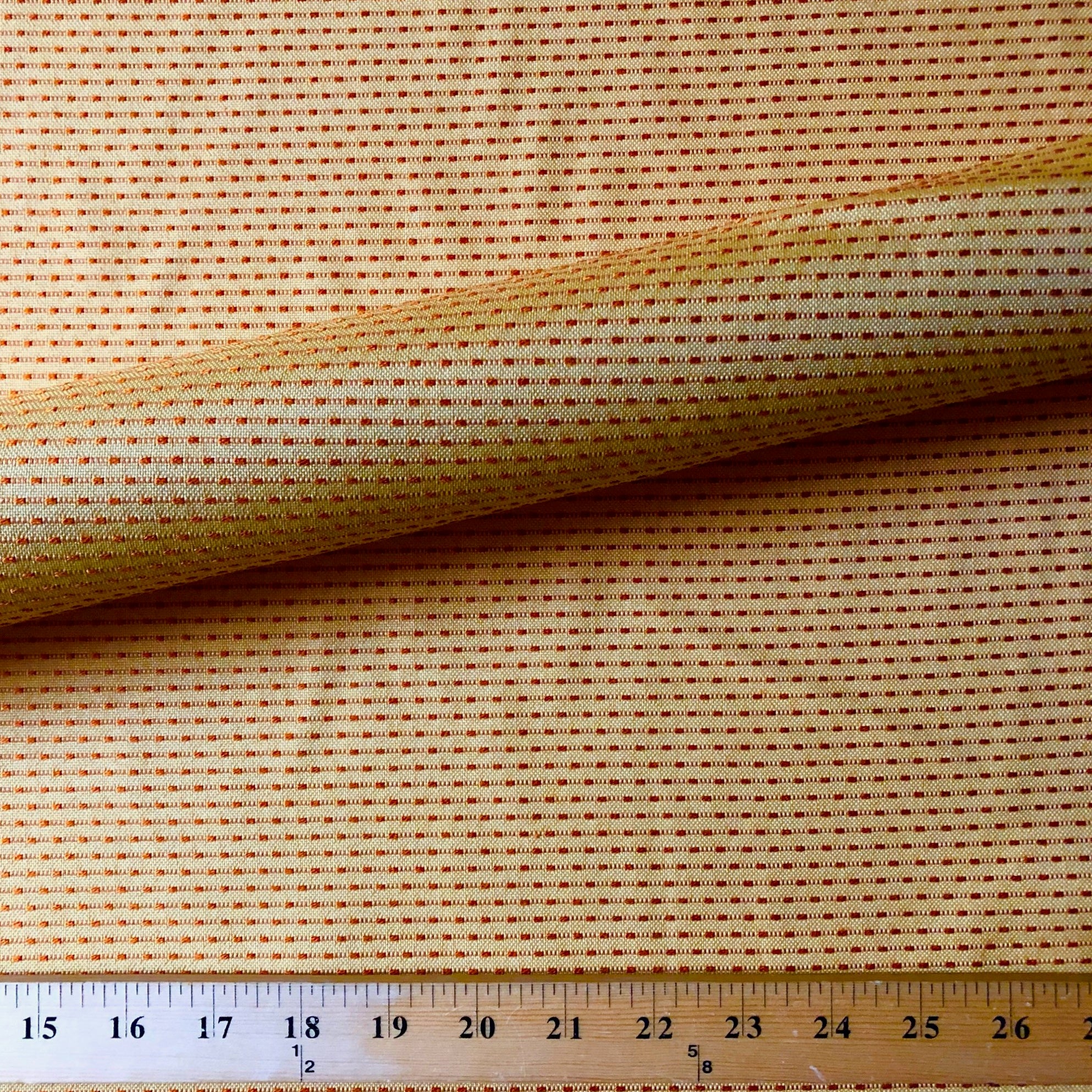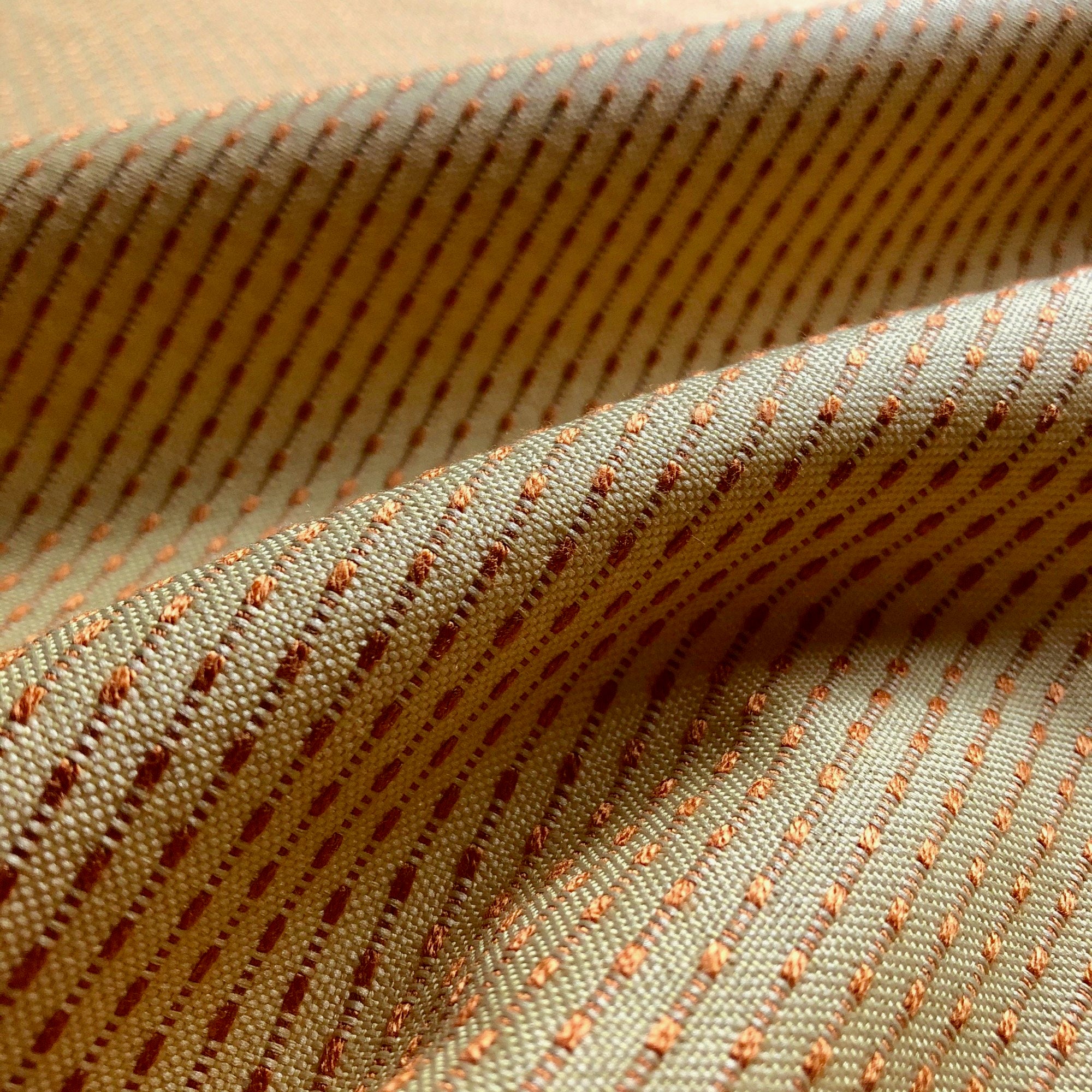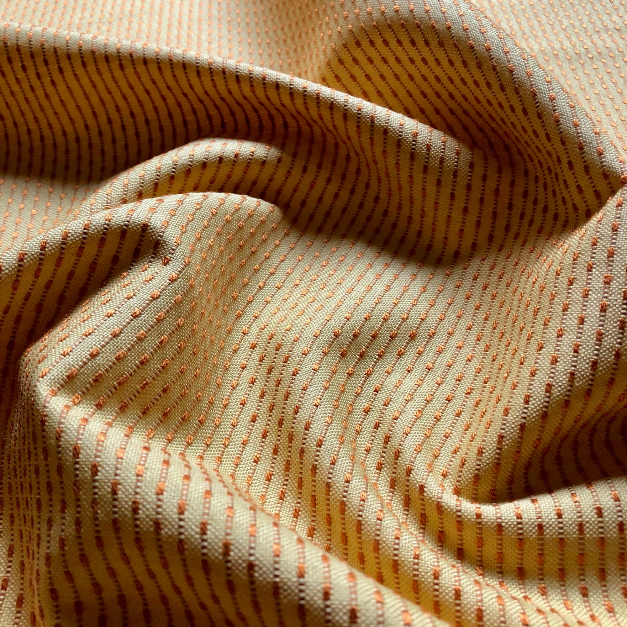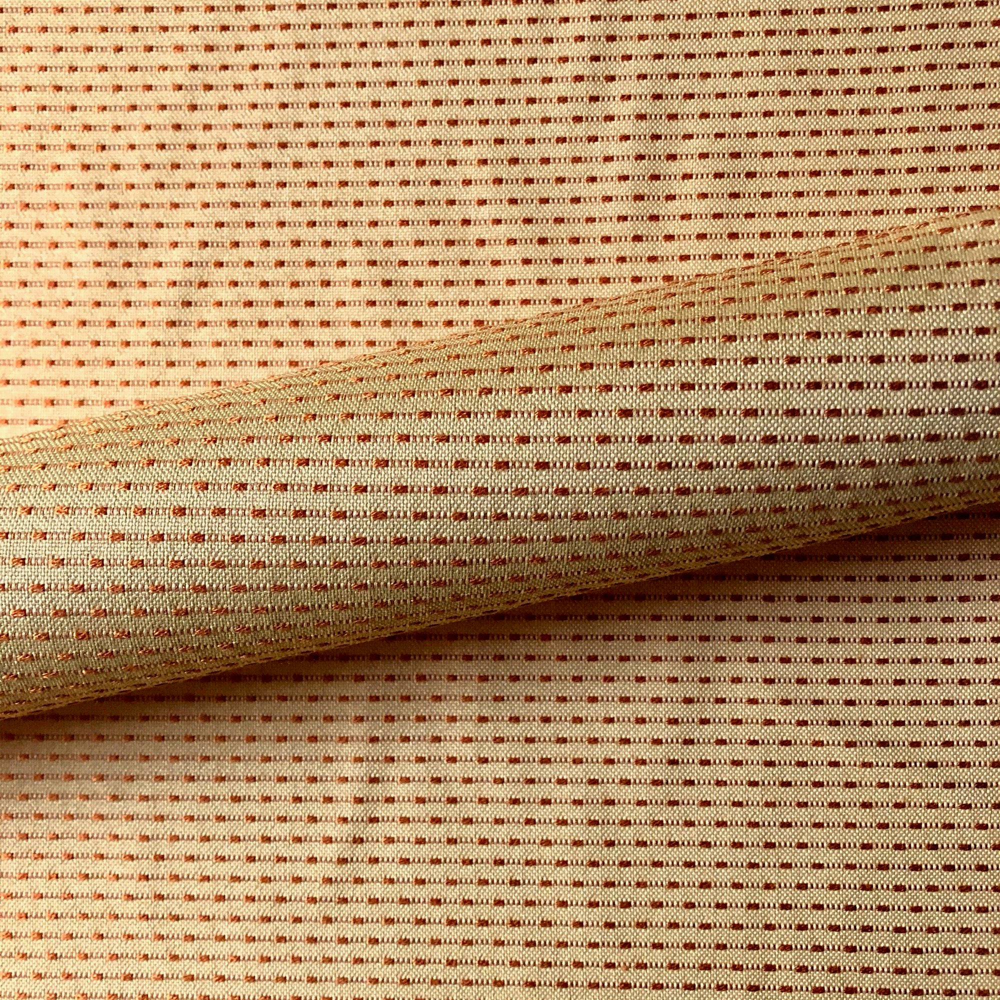 Adorn any interior with this Orange Dottie Railroaded Pin Tuck Stripe Upholstery Fabric 54", perfect for arts and crafts, DIY, upholstery, home decorating, and more. Give your bedding, chairs, cushions, windows and more a fresh new look with our selection of high quality fabrics curated by a team of trend leading designers. This luxurious stripe embroidered upholstery fabric in orange meets flair with versatility, offering the perfect personal touch for any Retro aesthetic. Designed and crafted by skilled textile artisans this fabric is made to last and never compromises on quality. All fabric is sold by the yard in 1-yard increments. Unfortunately, we do not accept returns on fabric orders but swatches are available.