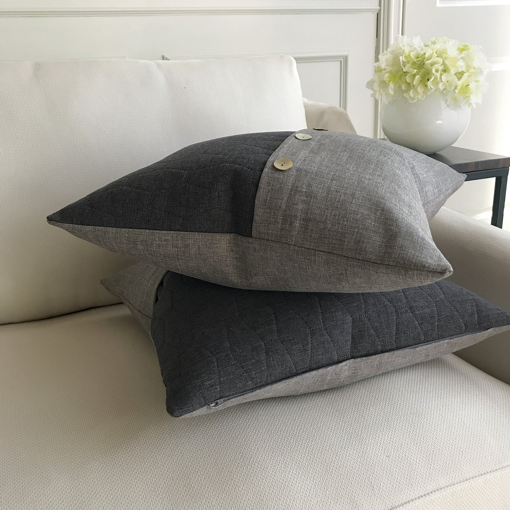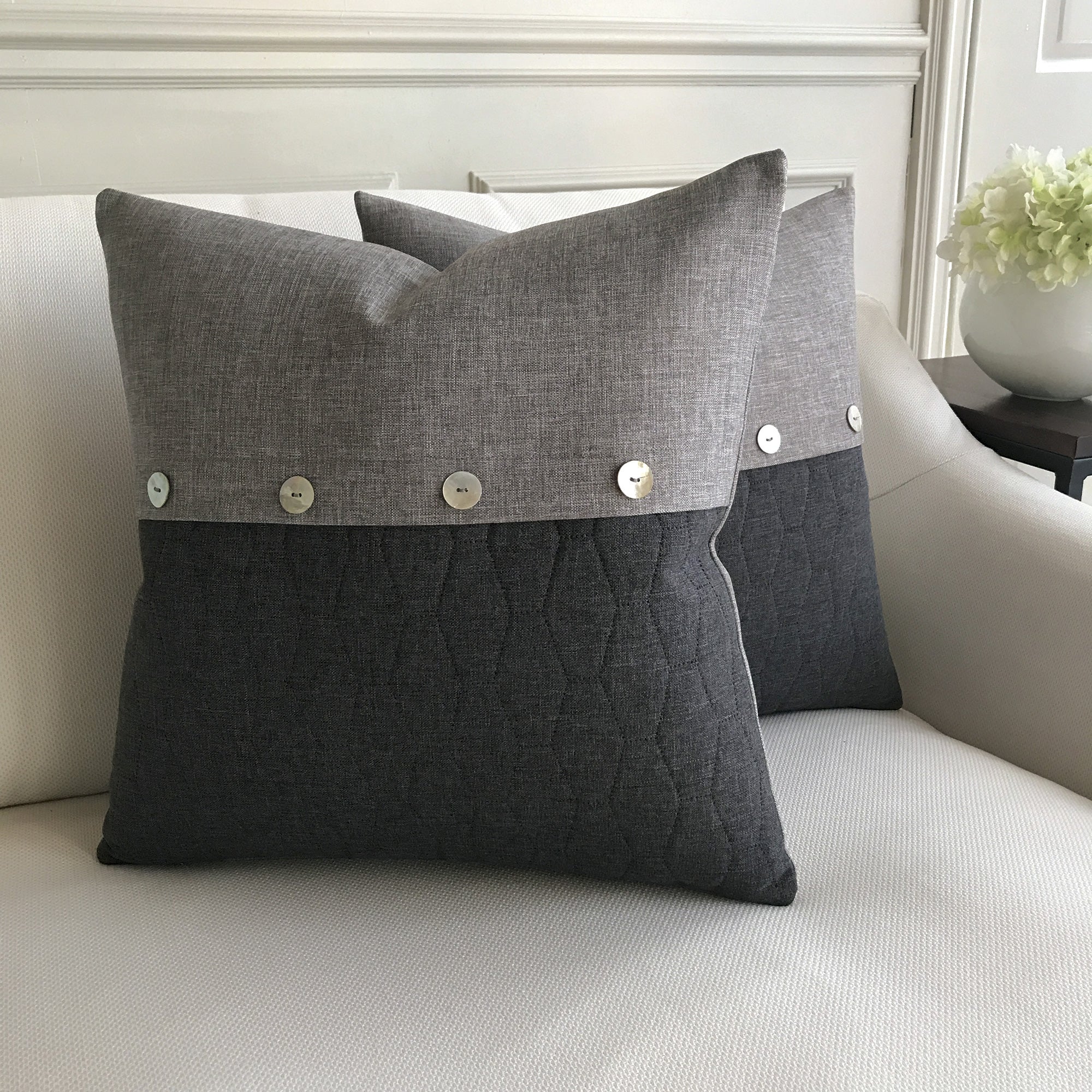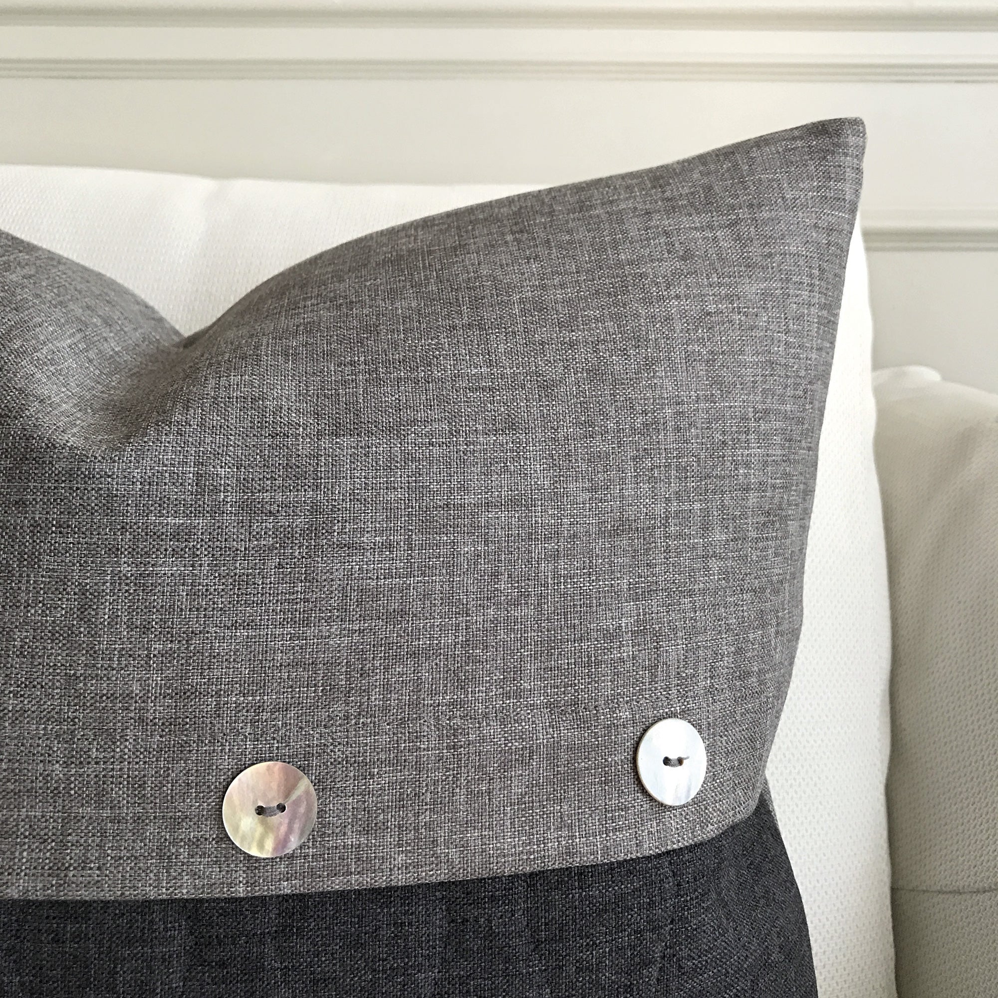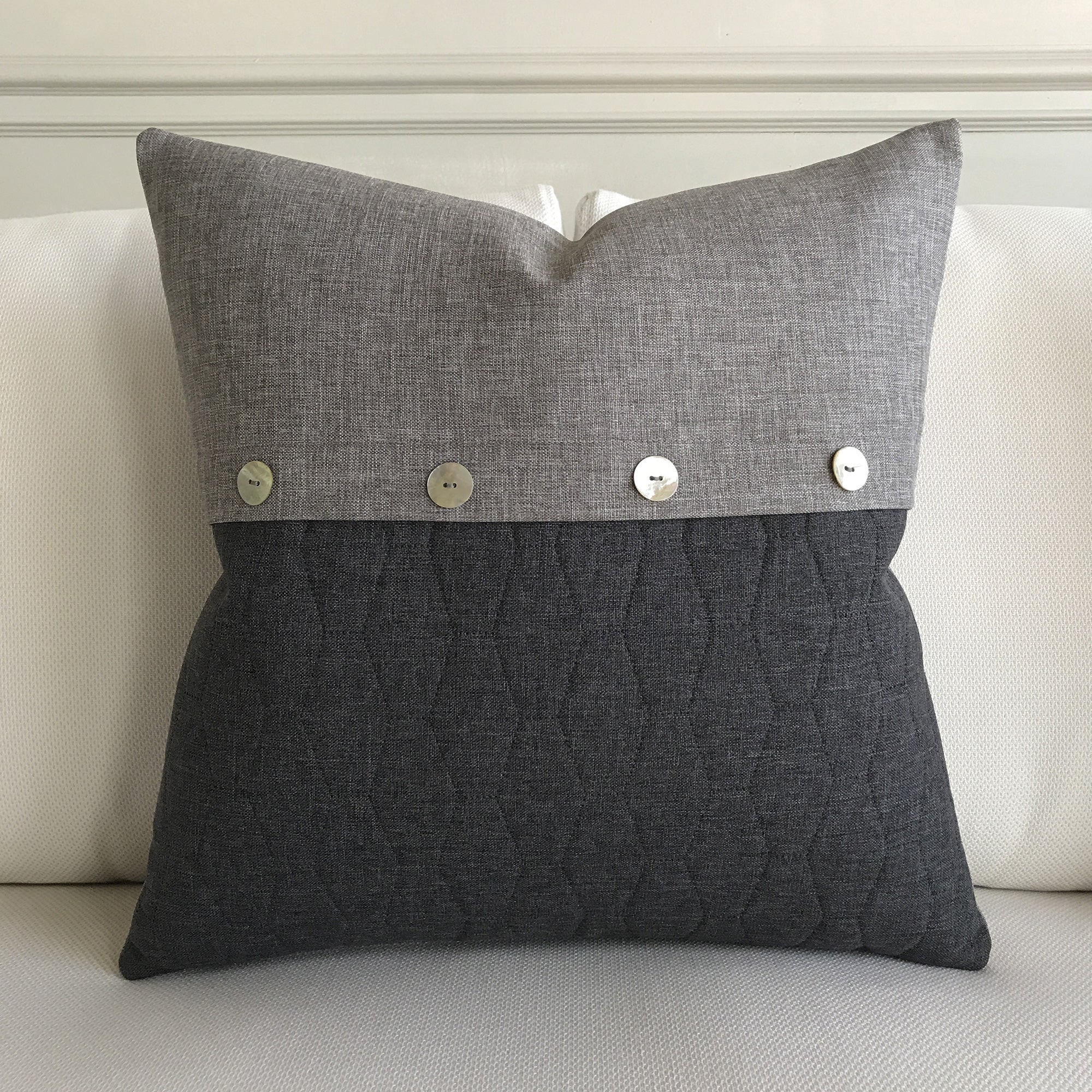 ⁌ Add a modern, sophisticated touch to your home with our Dark Gray Envelope Lumbar Pillow Cover in 20x20. Featuring an envelope-style design accented with decorative buttons, this pillow cover offers a chic yet timeless look. Backed in the same dark gray fabric for a seamless appearance, it is crafted with care in the USA from high-quality materials, combining durability with elegance.