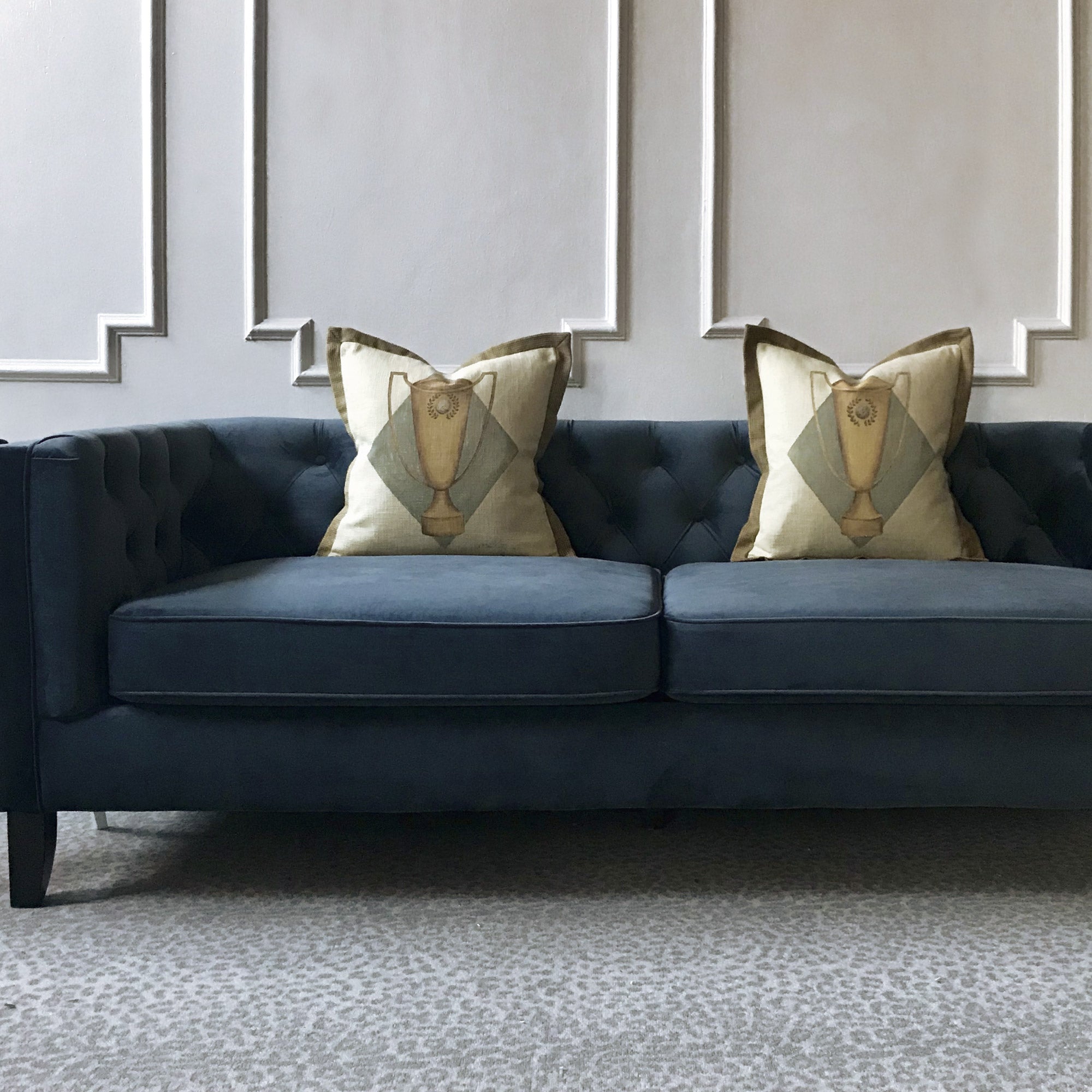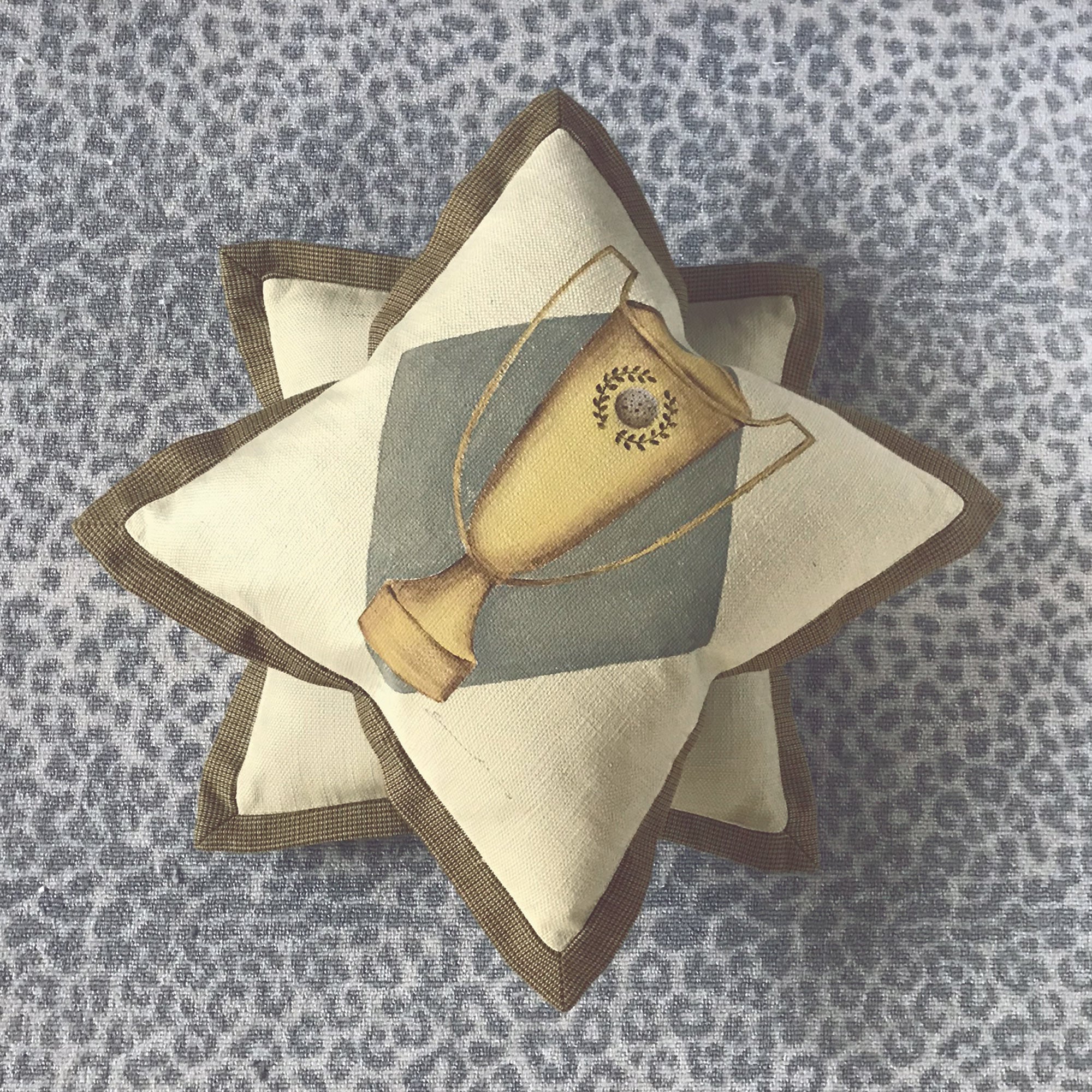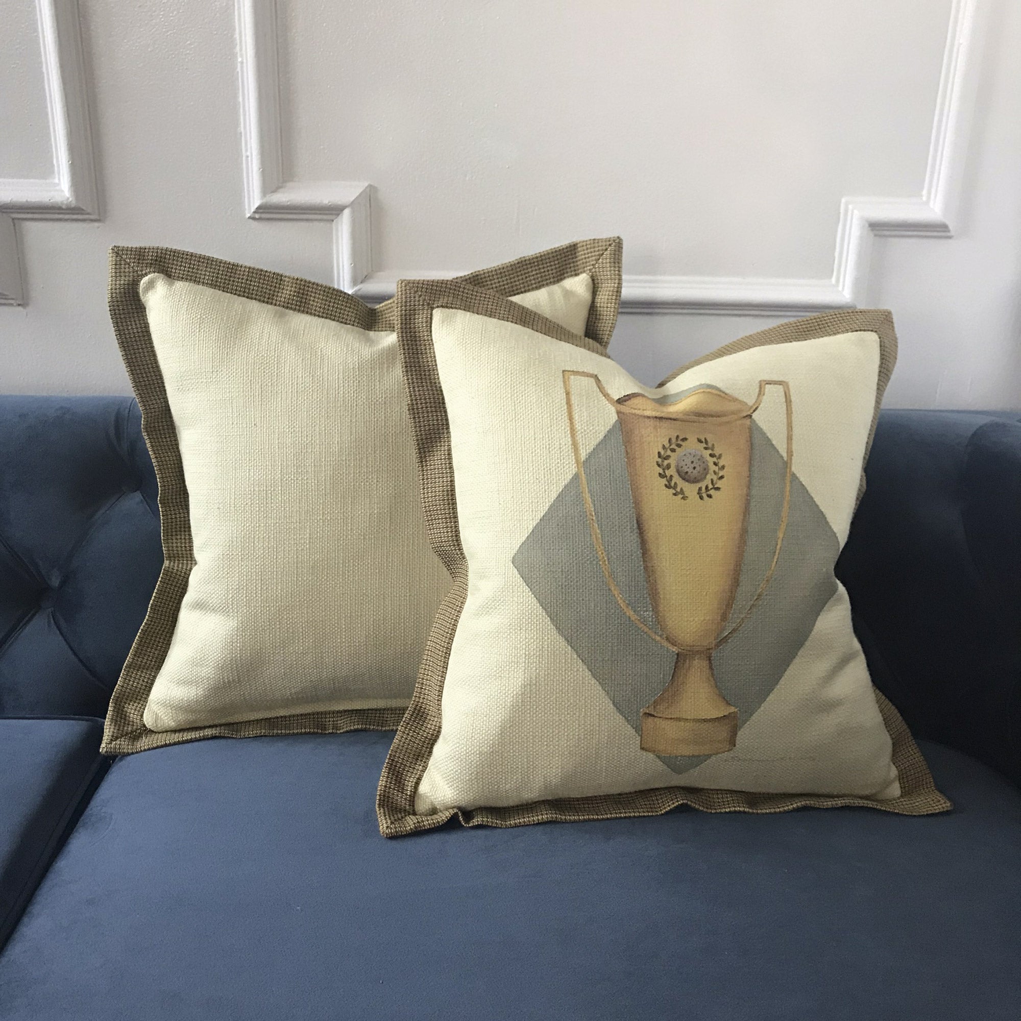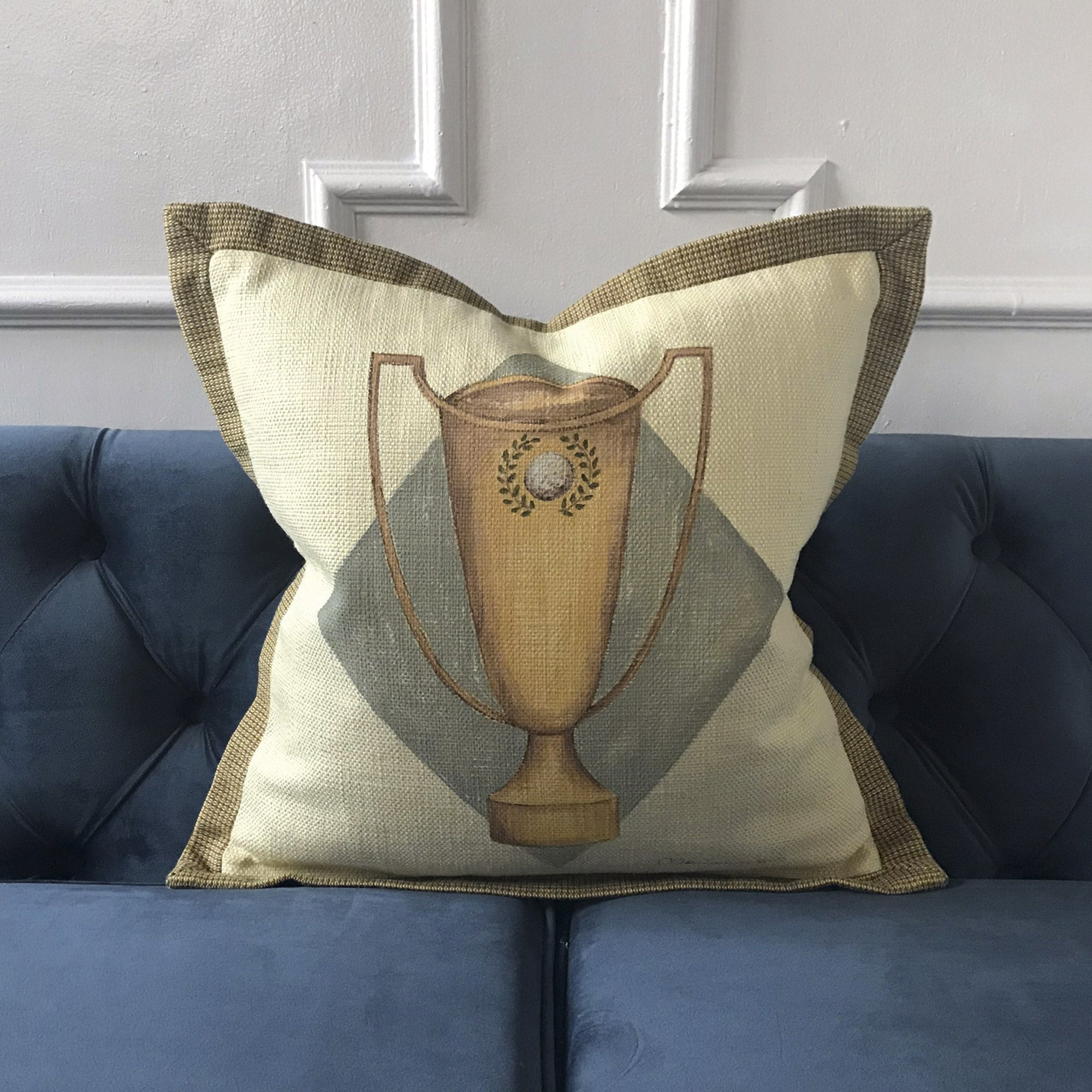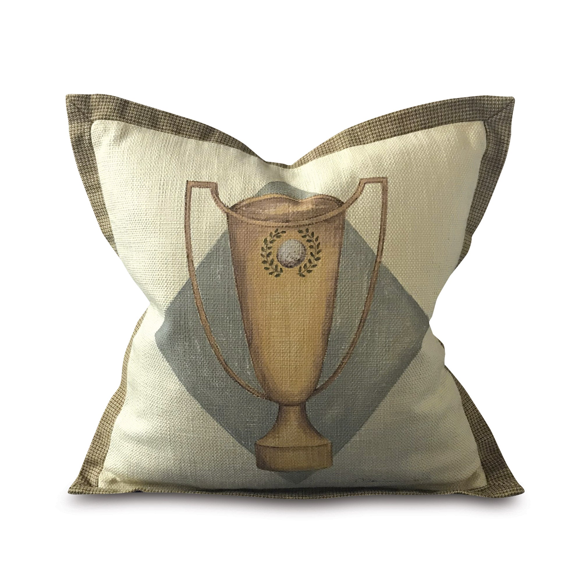 • Decorative throw pillow cover with a hand-painted trophy design on an ivory base