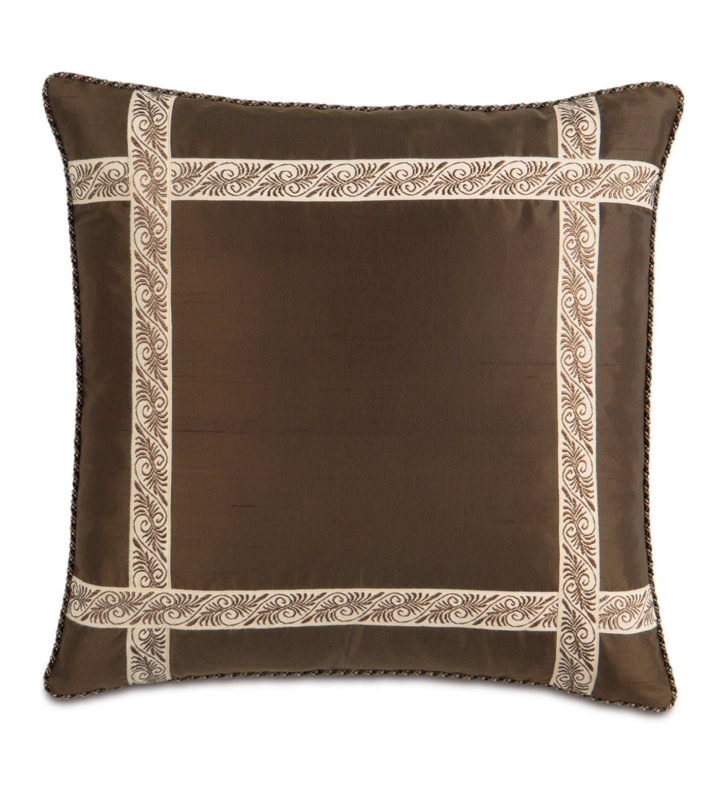 - 100% chocolate silk decorative pillow with beige decorative border applique