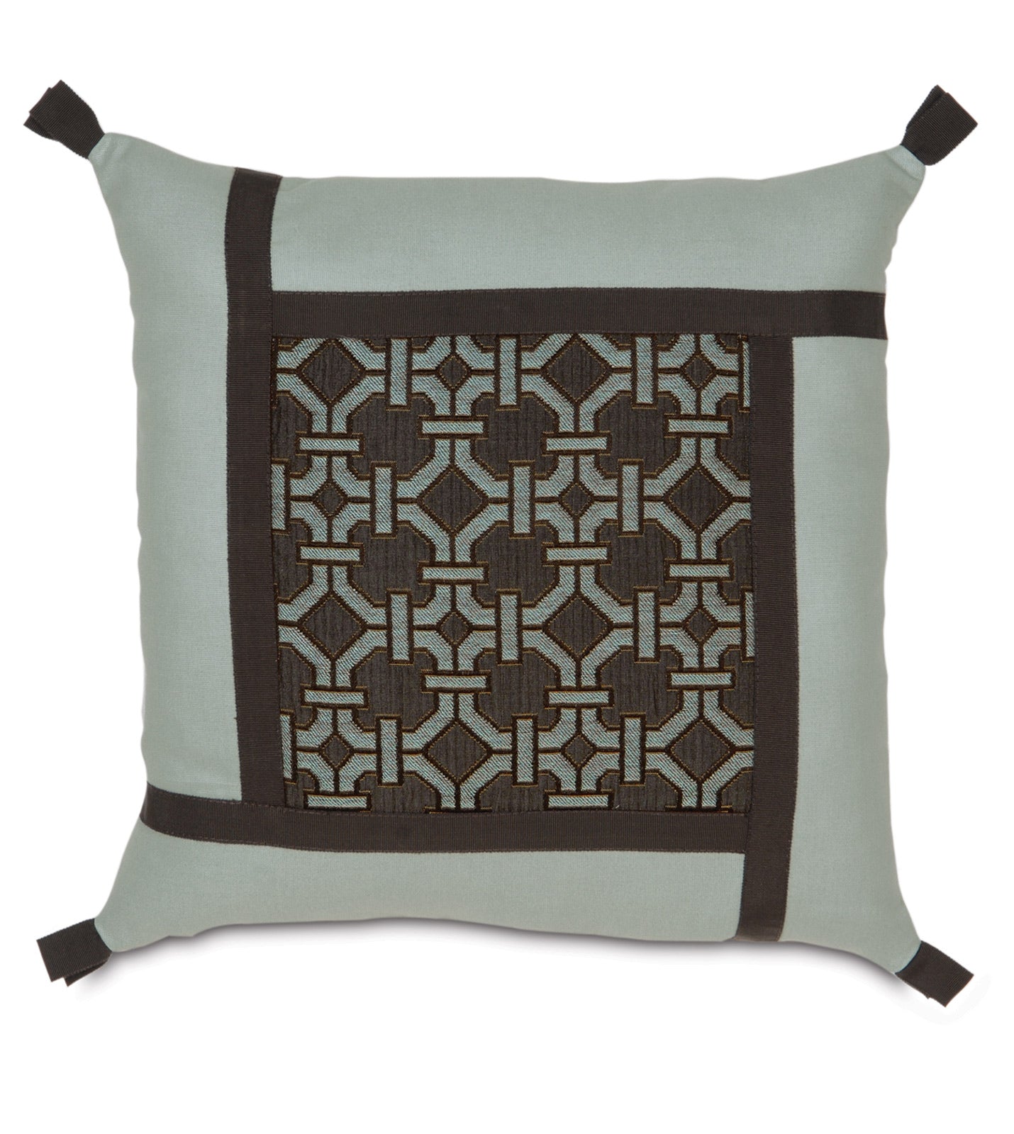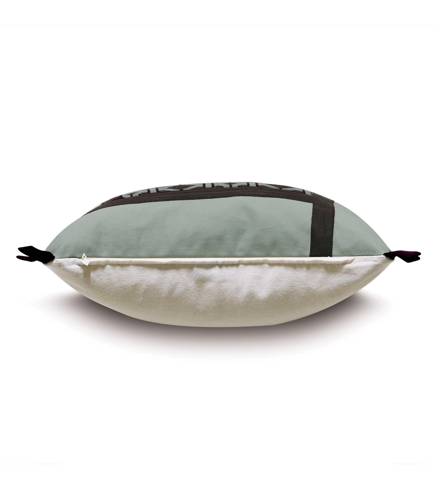 - Decorative pillow cover with a circular geometric pattern in cool sage
