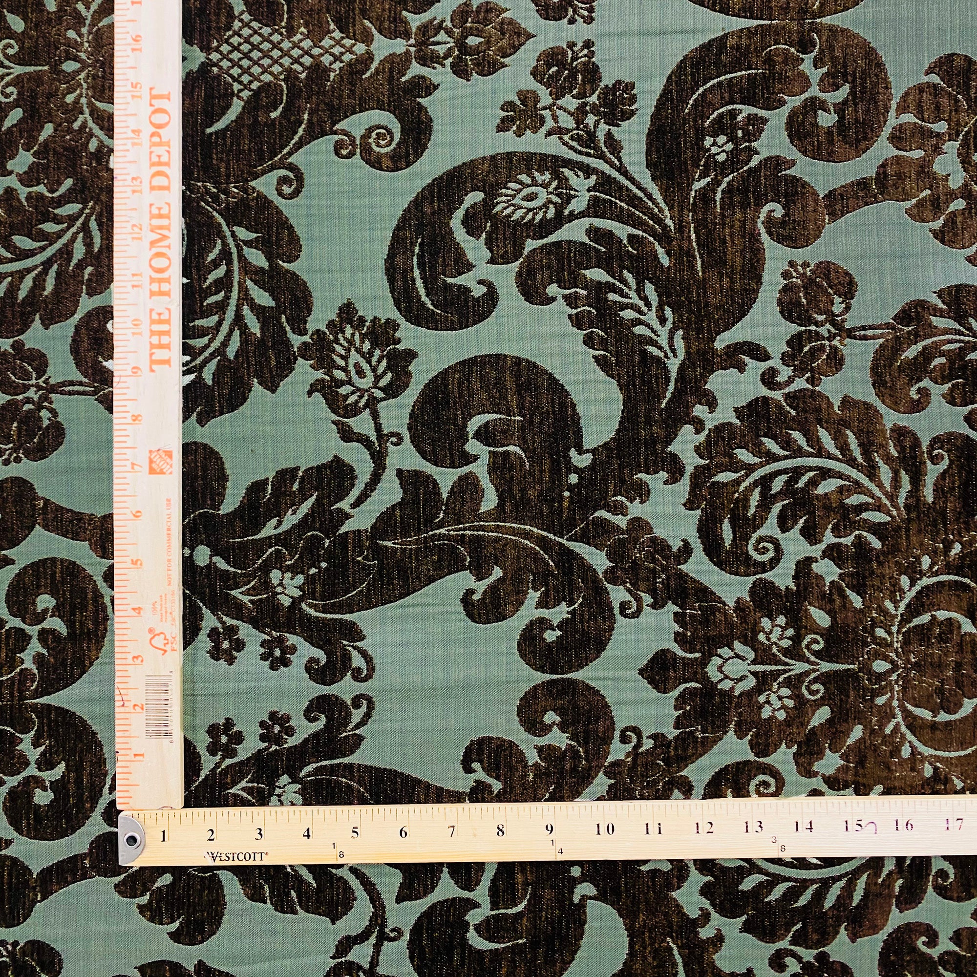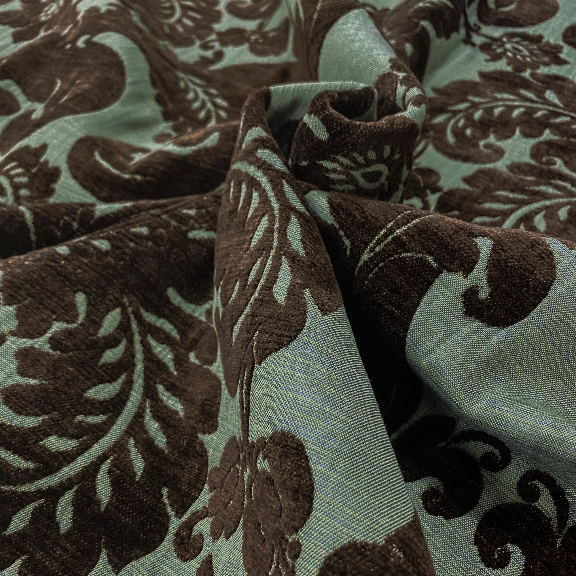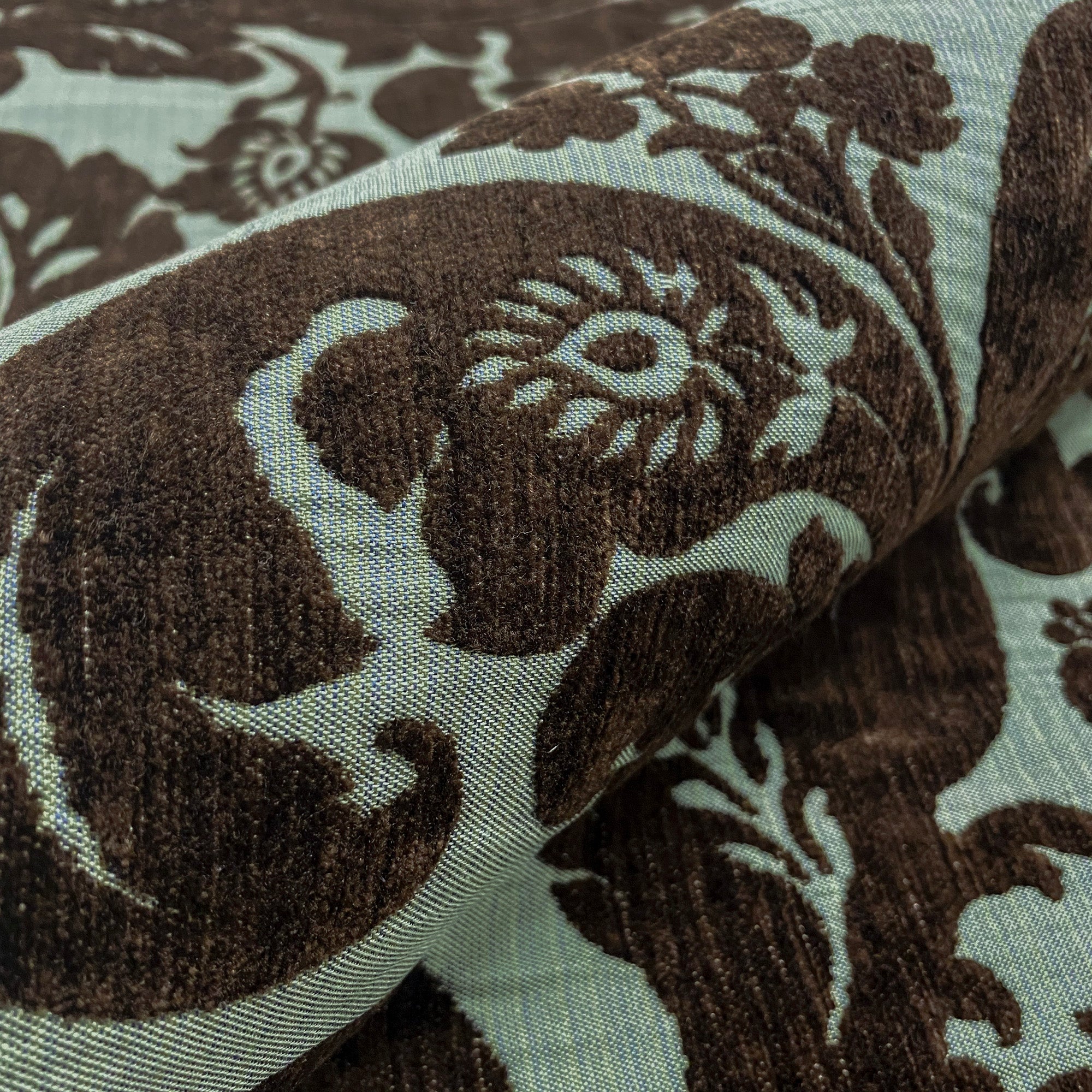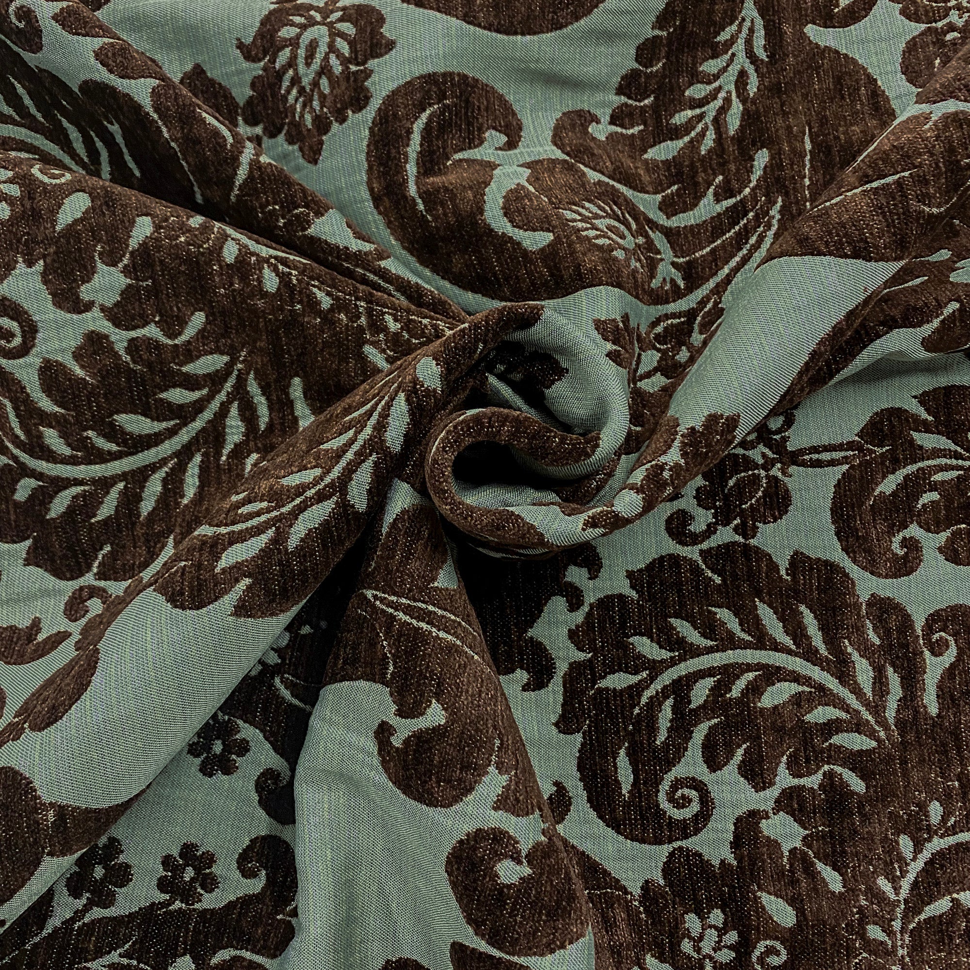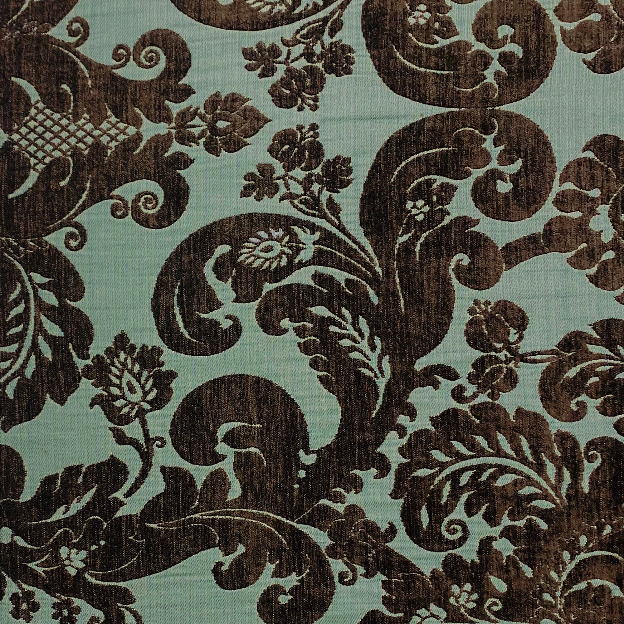 Brocade upholstery fabric with brown velvet damask on light aqua ground.