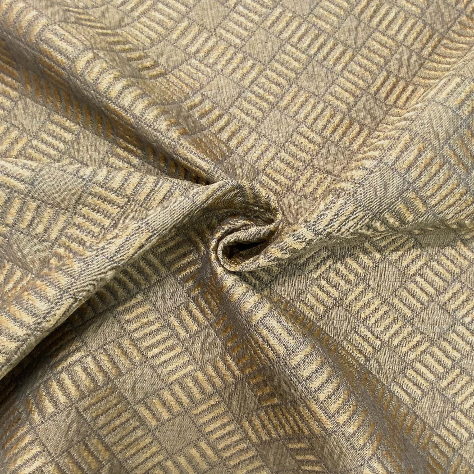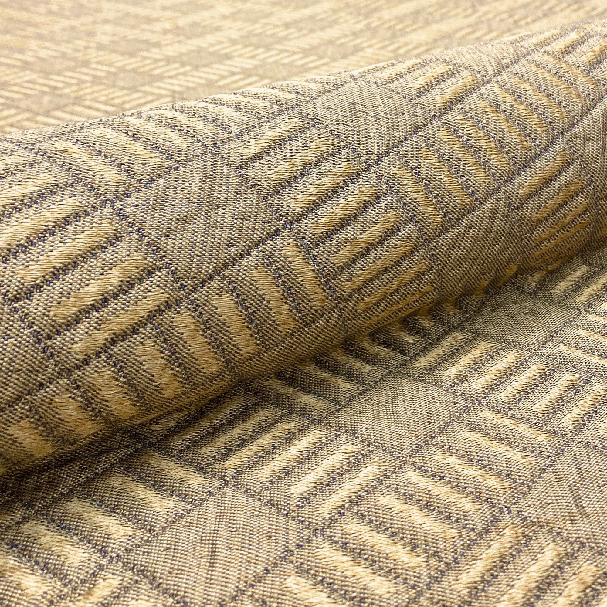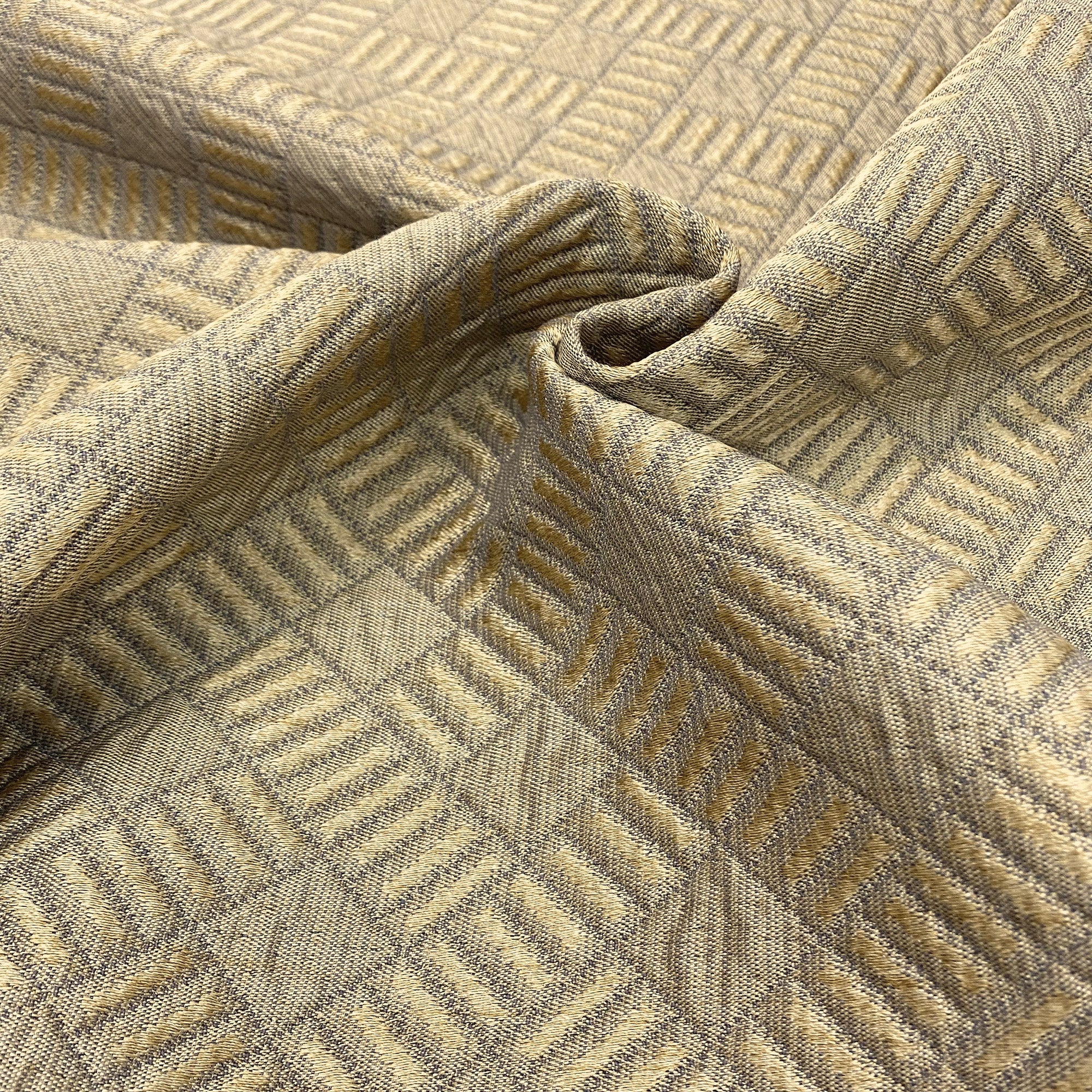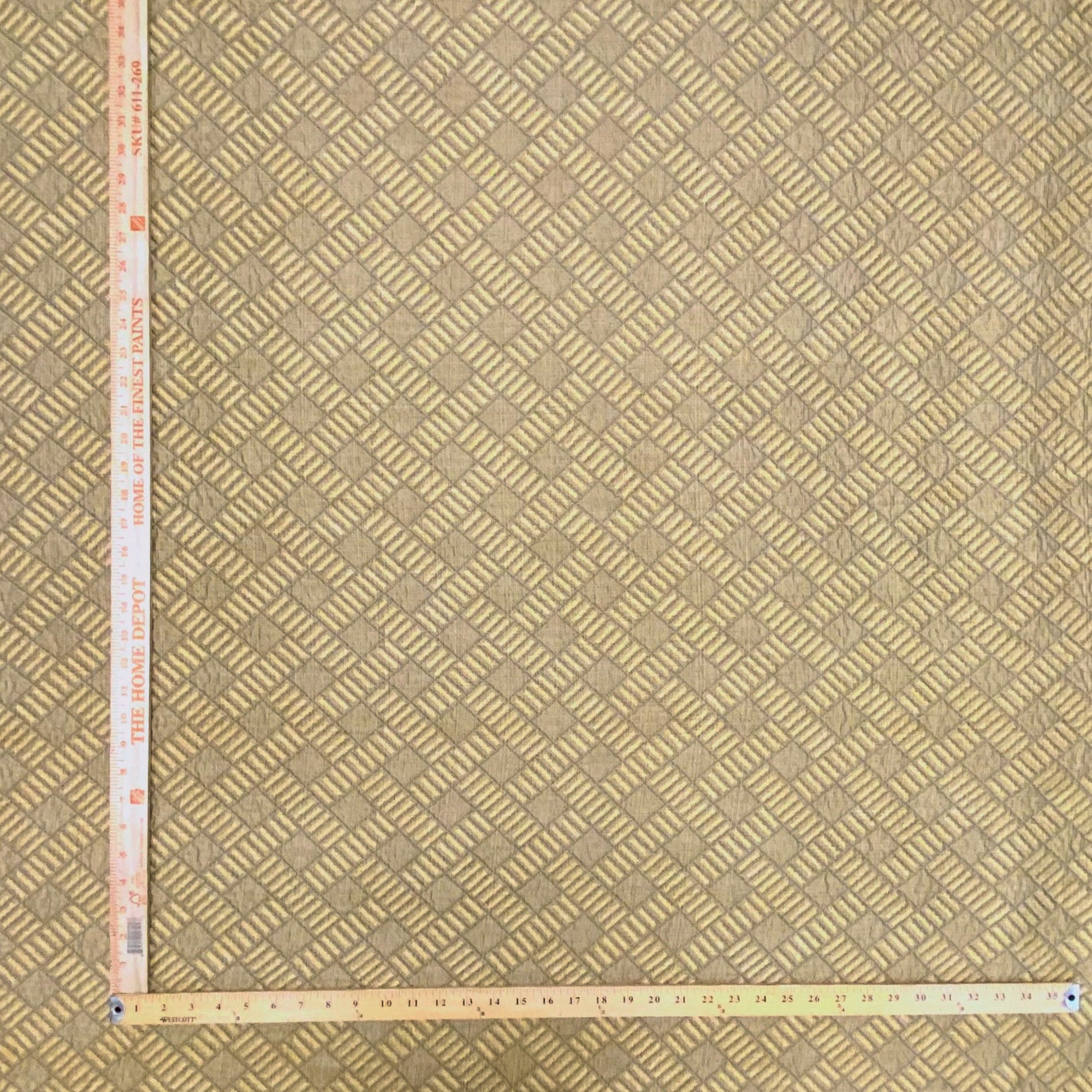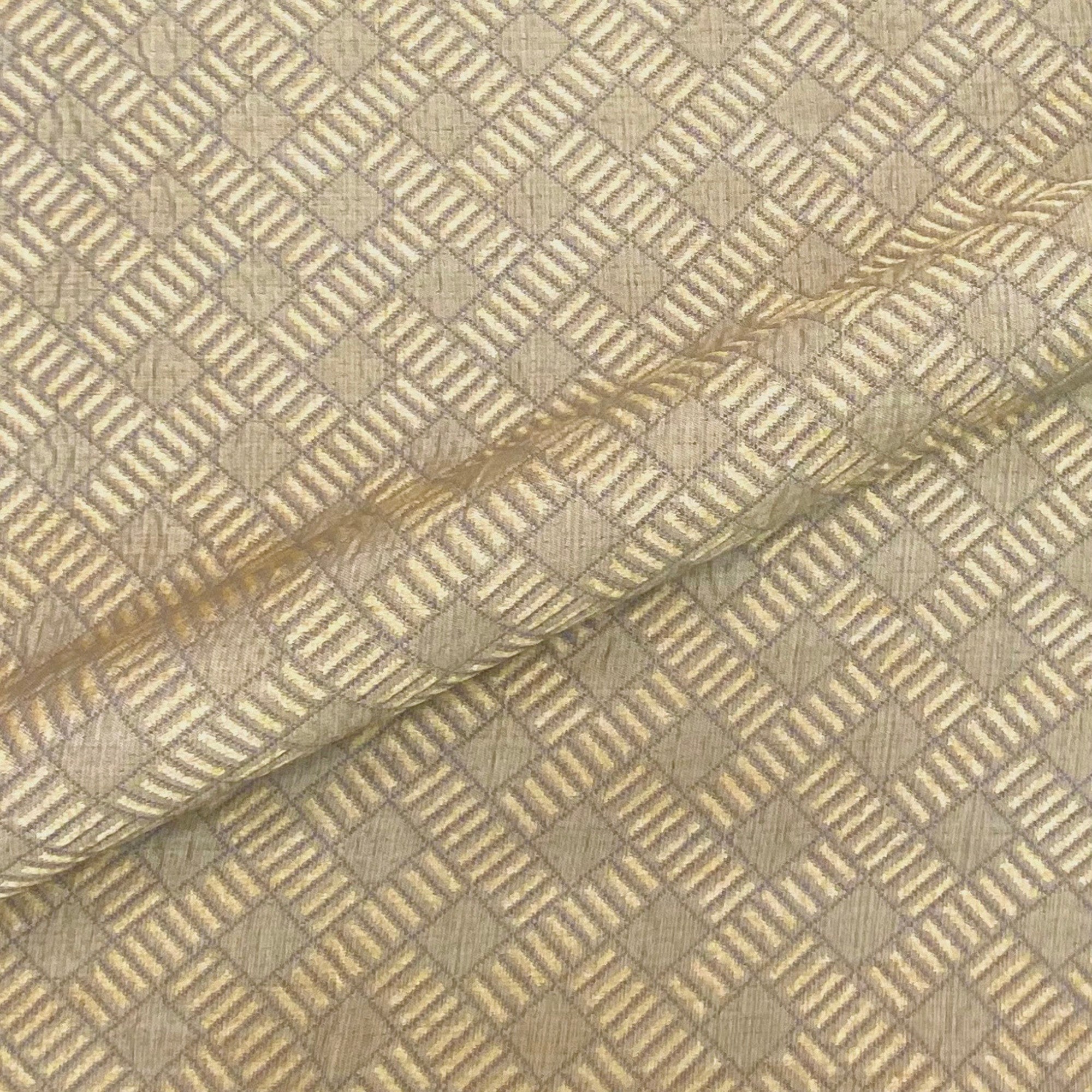 Textured upholstery fabric with tropical-style trellis in neutral gold.