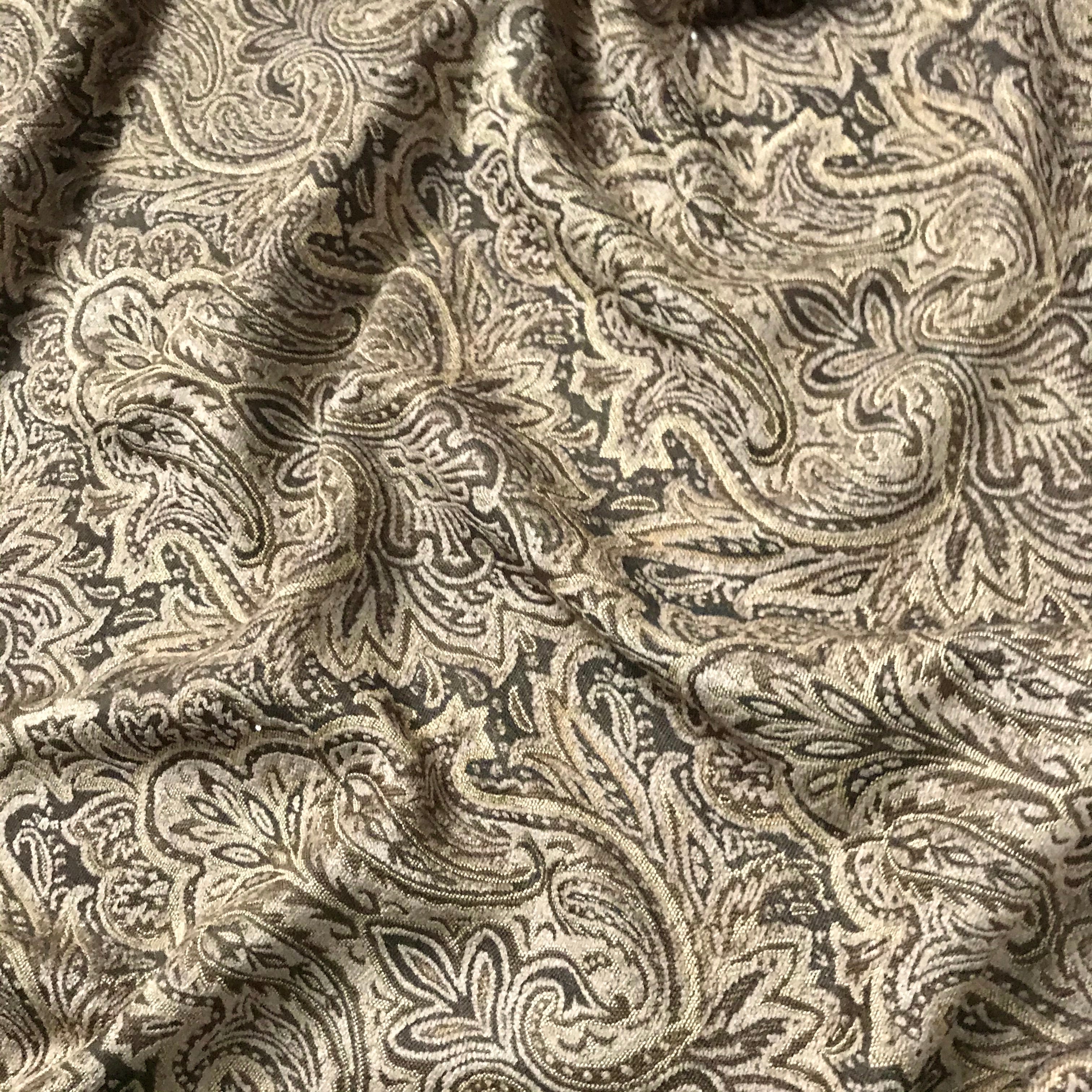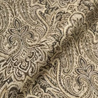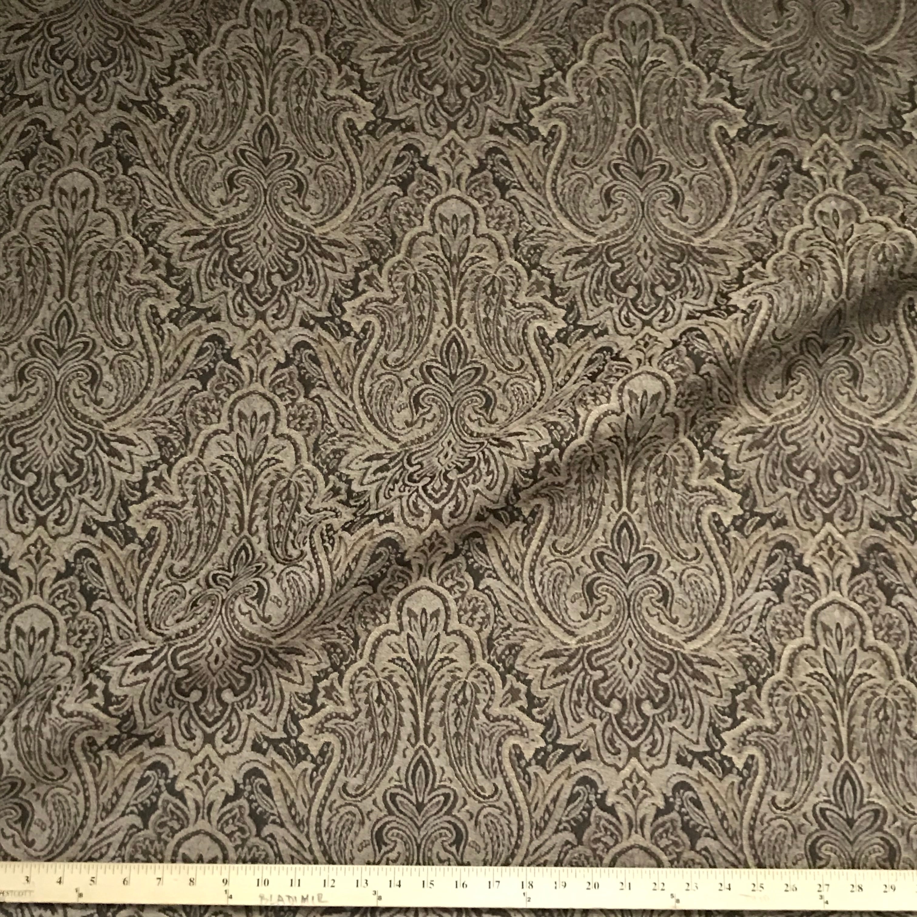 Jacquard fabric woven into traditional style damask design in black on neutral ground. Heavyweight, suitable for upholstery needs and easy enough for any home decor furnishing such as: Pillows, Bedding, Tapestries, Crafts, Drapery and more!
