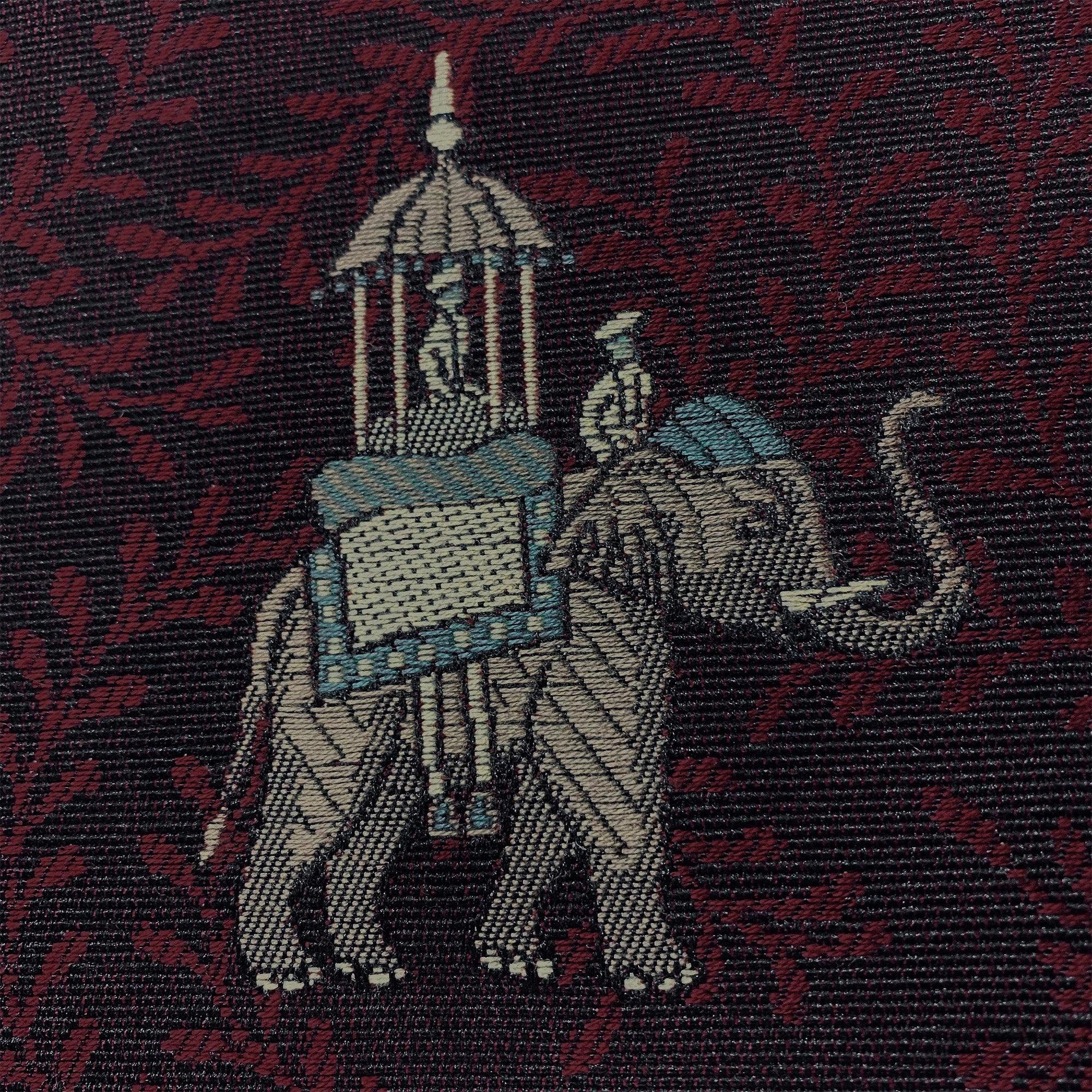 Moroccan inspired ruby scroll embroidery featuring embroidered small scale elephant design.