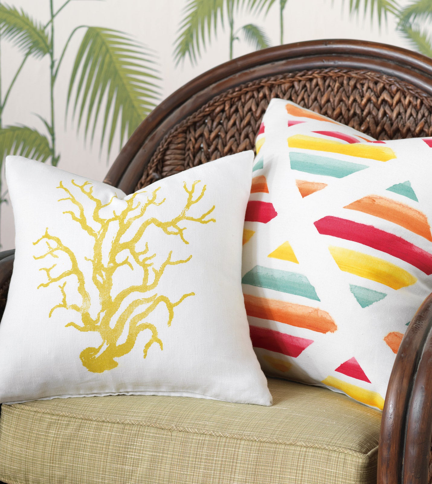- Decorative pillow cover with block printed coral in sunshine yellow ink on solid off-white, 100% linen fabric