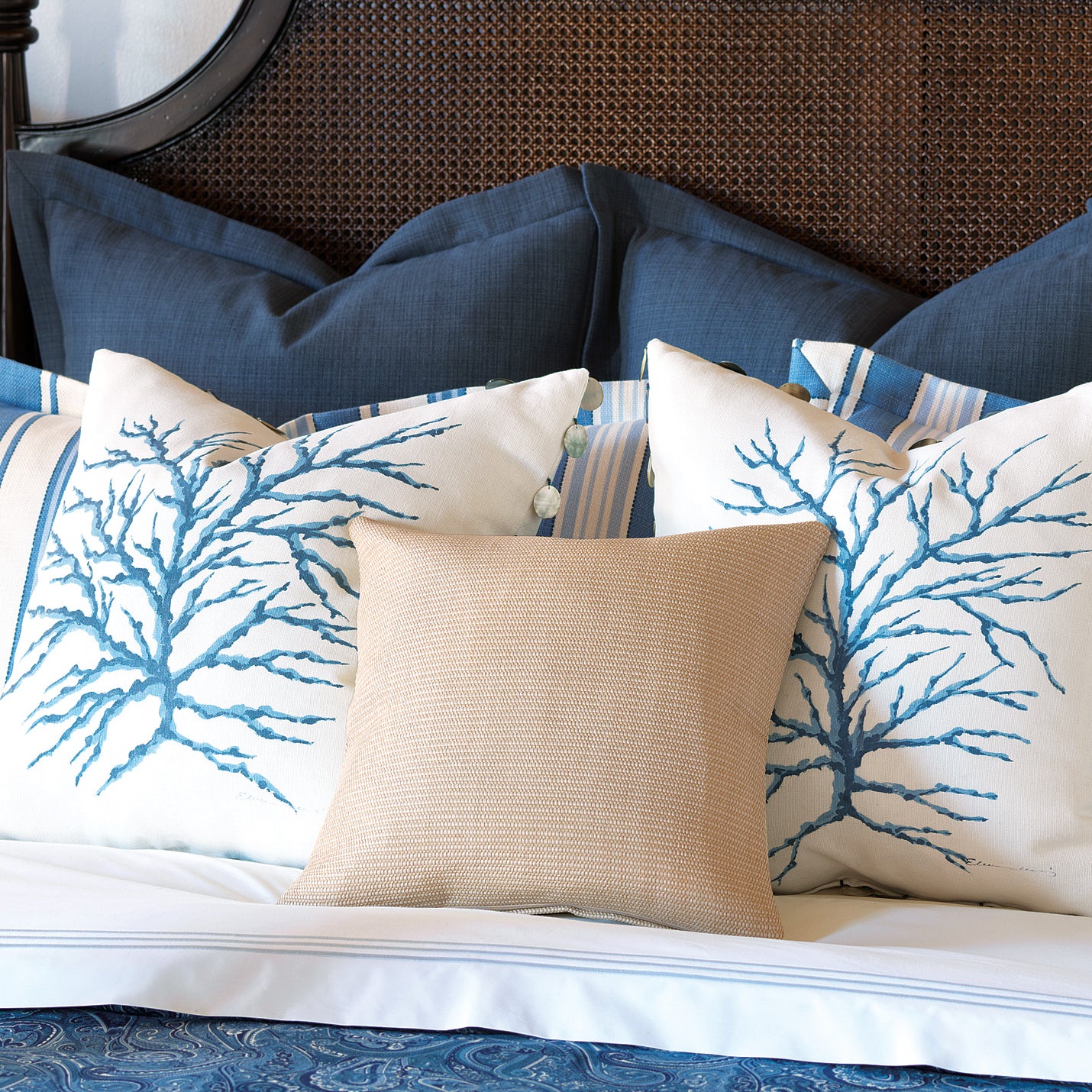 The trick with white isn’t matching — it’s layering. Stack different shades and textures together to keep things interesting. A crisp white linen next to an ivory cotton knit. A woven cover with stone undertones beside a soft, matte ivory.