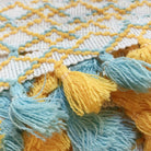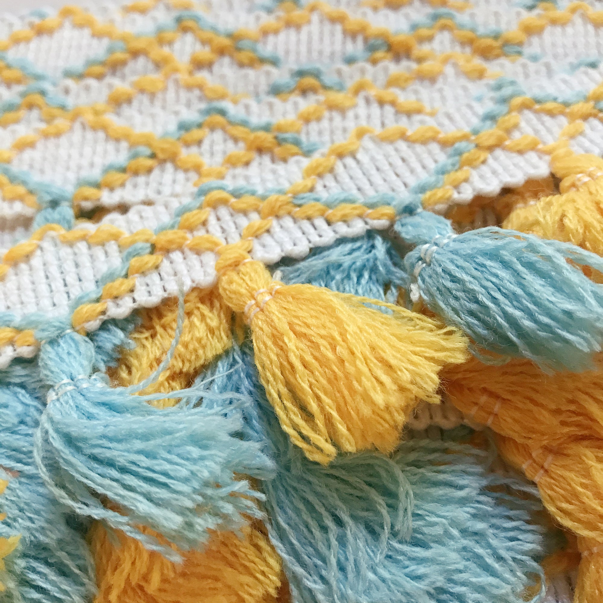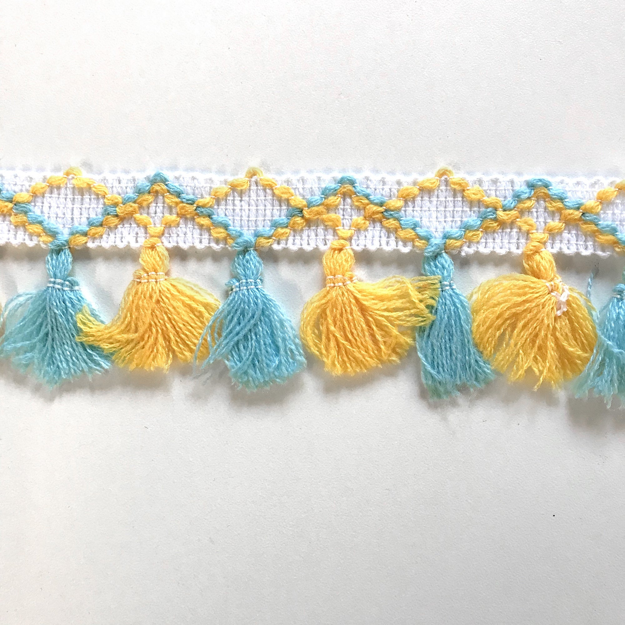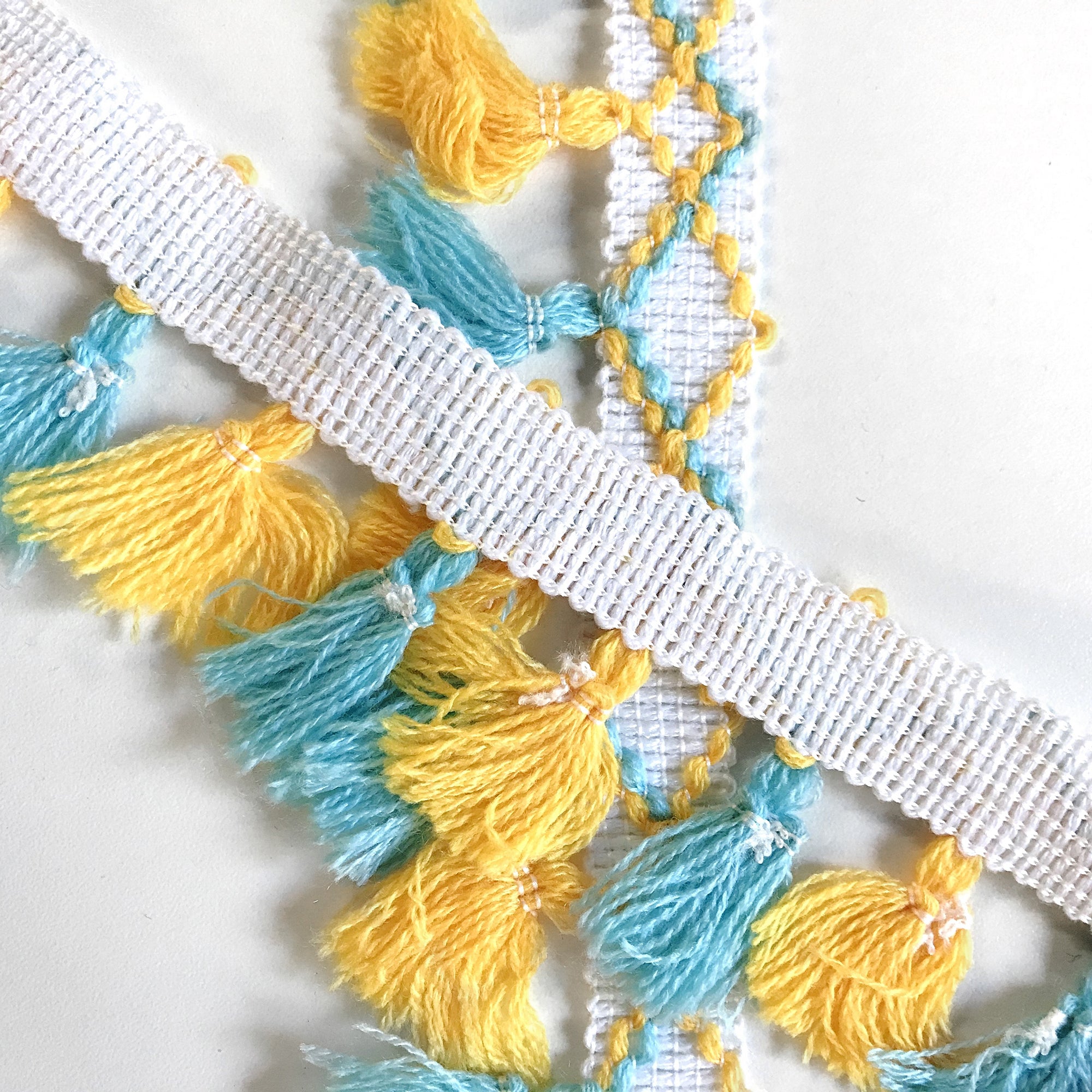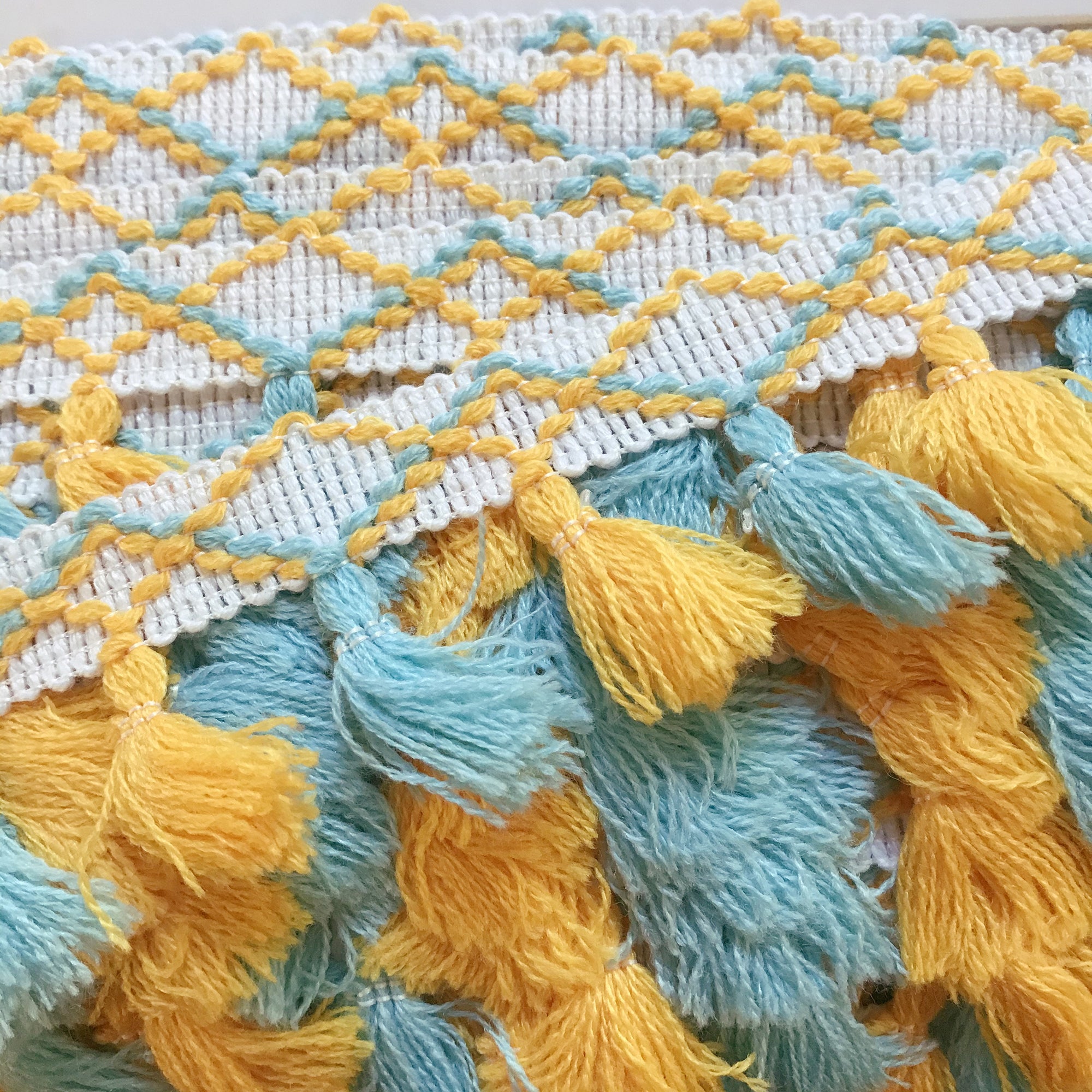 Decorative tassel trim in bright yellow and cyan with a diamond pattern.