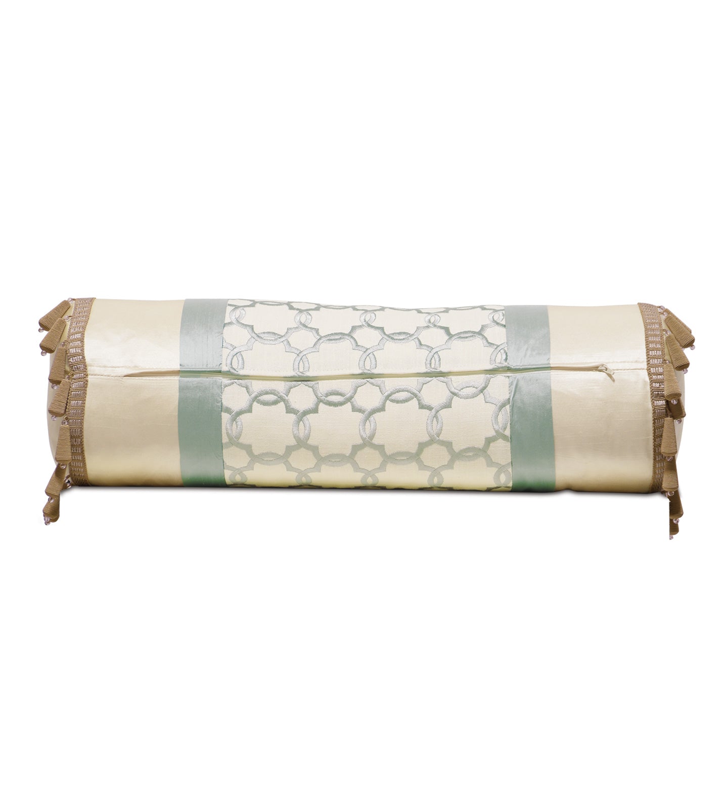 - Bolster pillow with an embroidered quatrefoil pattern in ivory and blue