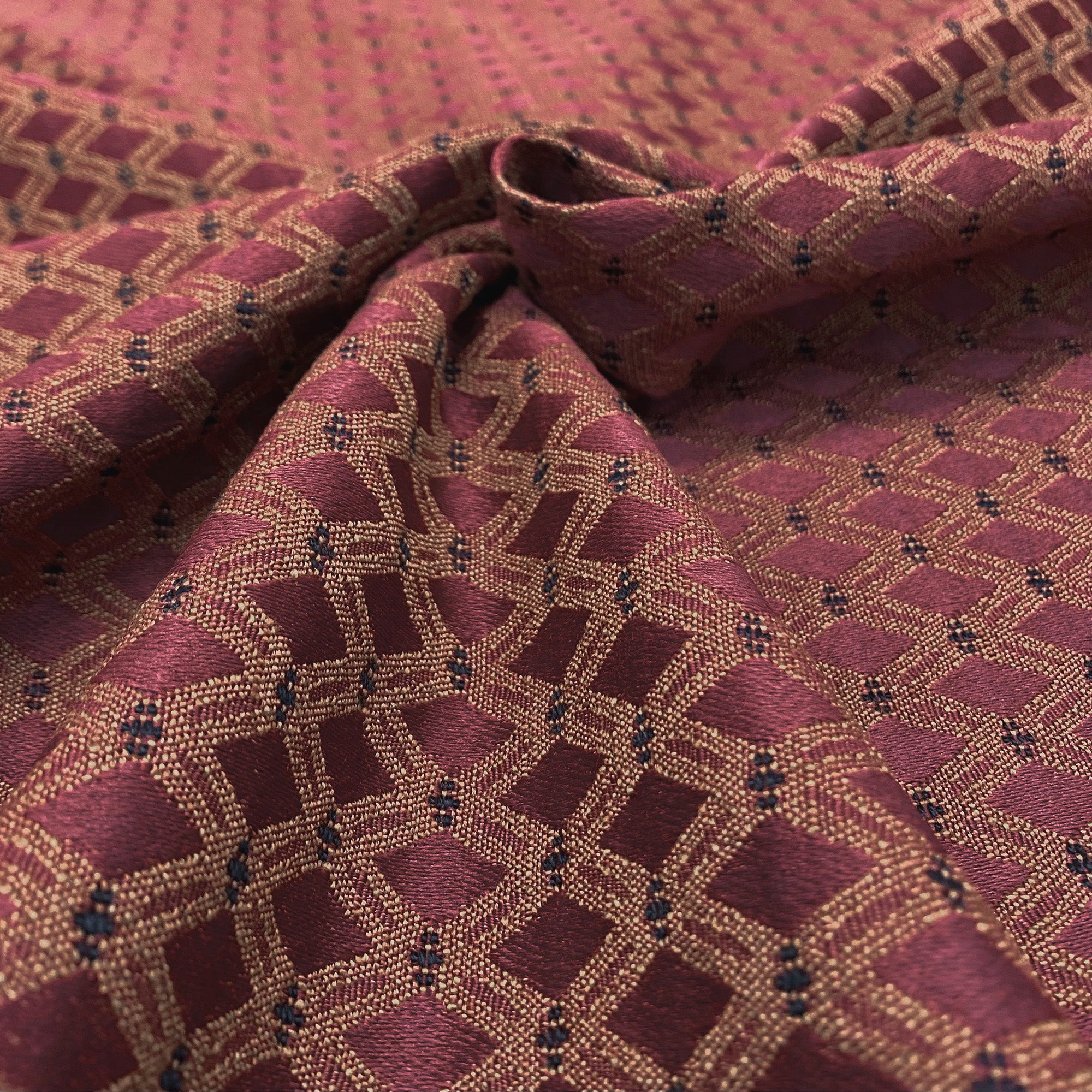 This luxurious geometric jacquard upholstery fabric in crimson meets flair with versatility, offering the perfect personal touch for any traditional aesthetic. Designed and crafted by skilled textile artisans this fabric is made to last and never compromises on quality. All fabric is sold by the yard in 1-yard increments. Unfortunately, we do not accept returns on fabric orders but swatches are available.