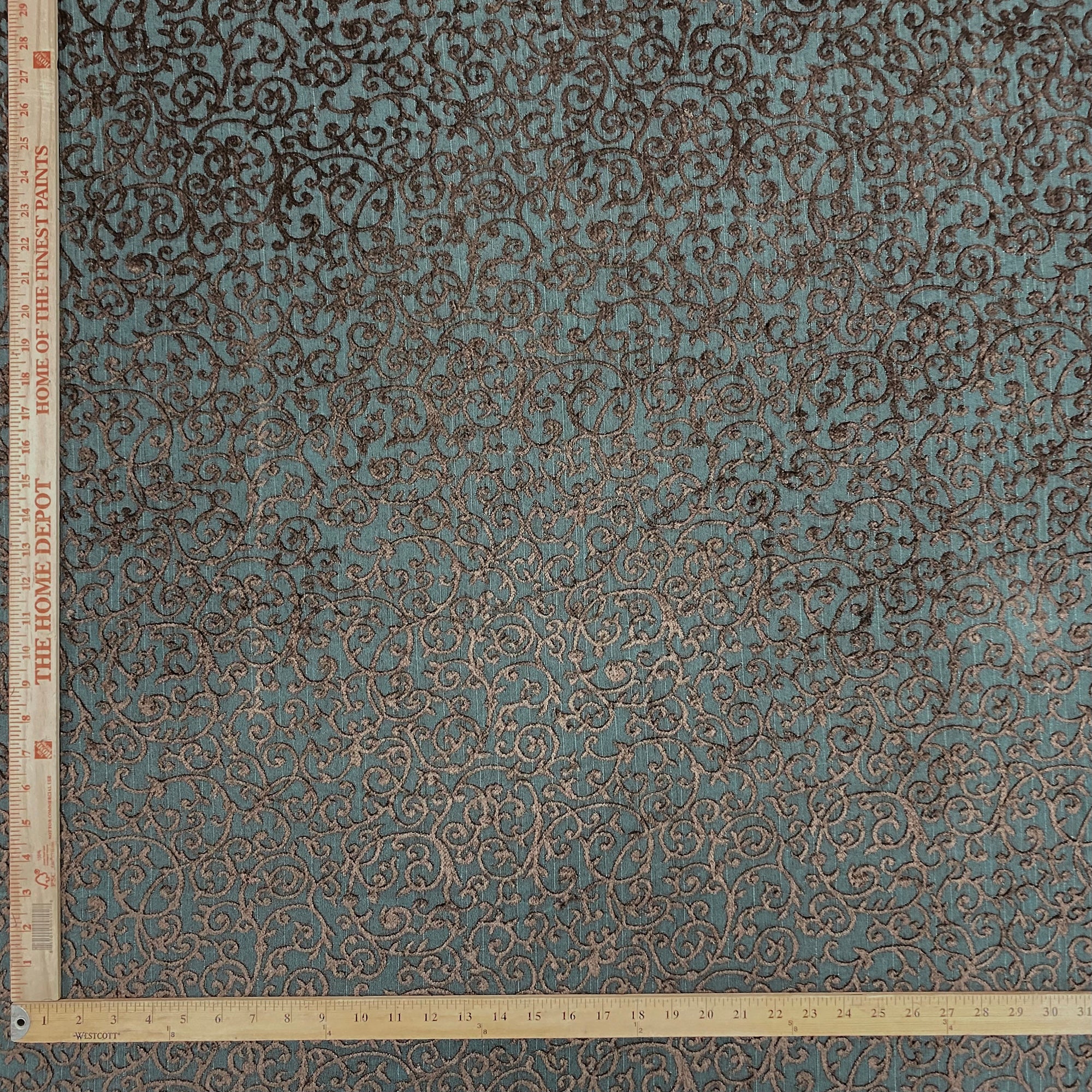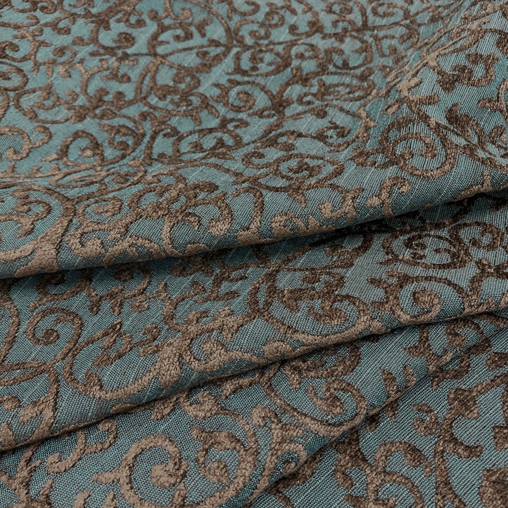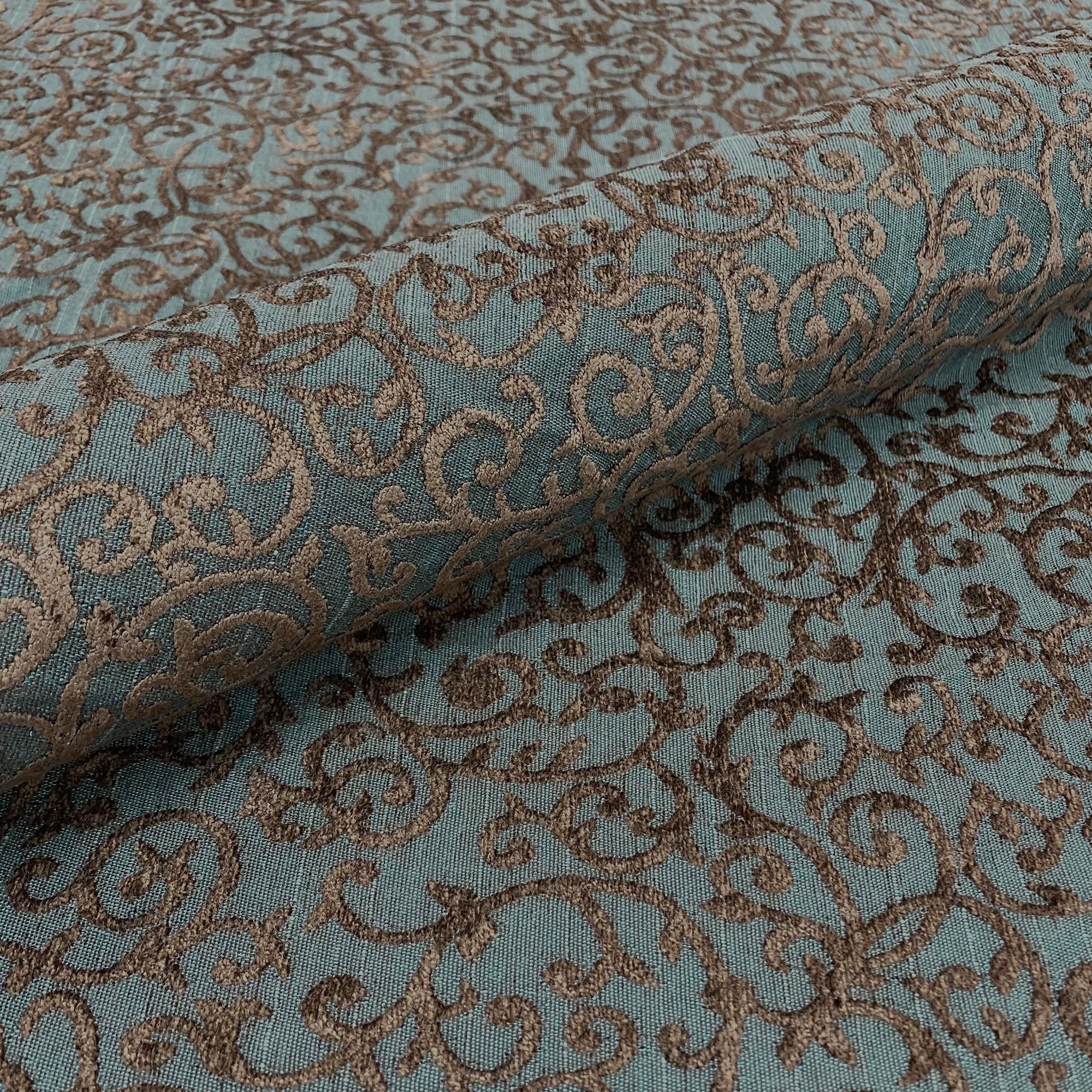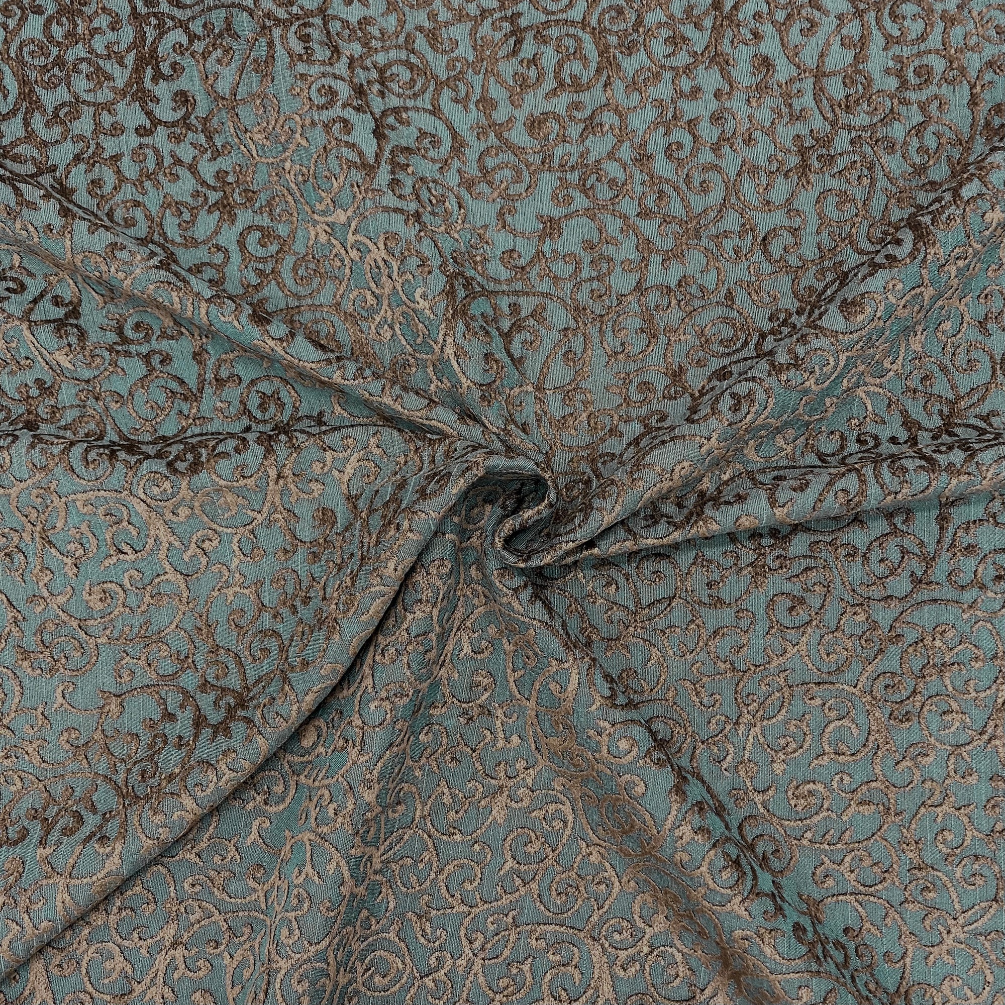 This luxurious woven chenille scrollwork in brown against navy ground meets flair with versatility, offering the perfect personal touch for any traditional aesthetic. Designed and crafted by skilled textile artisans this fabric is made to last and never compromises on quality. All fabric is sold by the yard in 1-yard increments. Unfortunately, we do not accept returns on fabric orders but swatches are available.