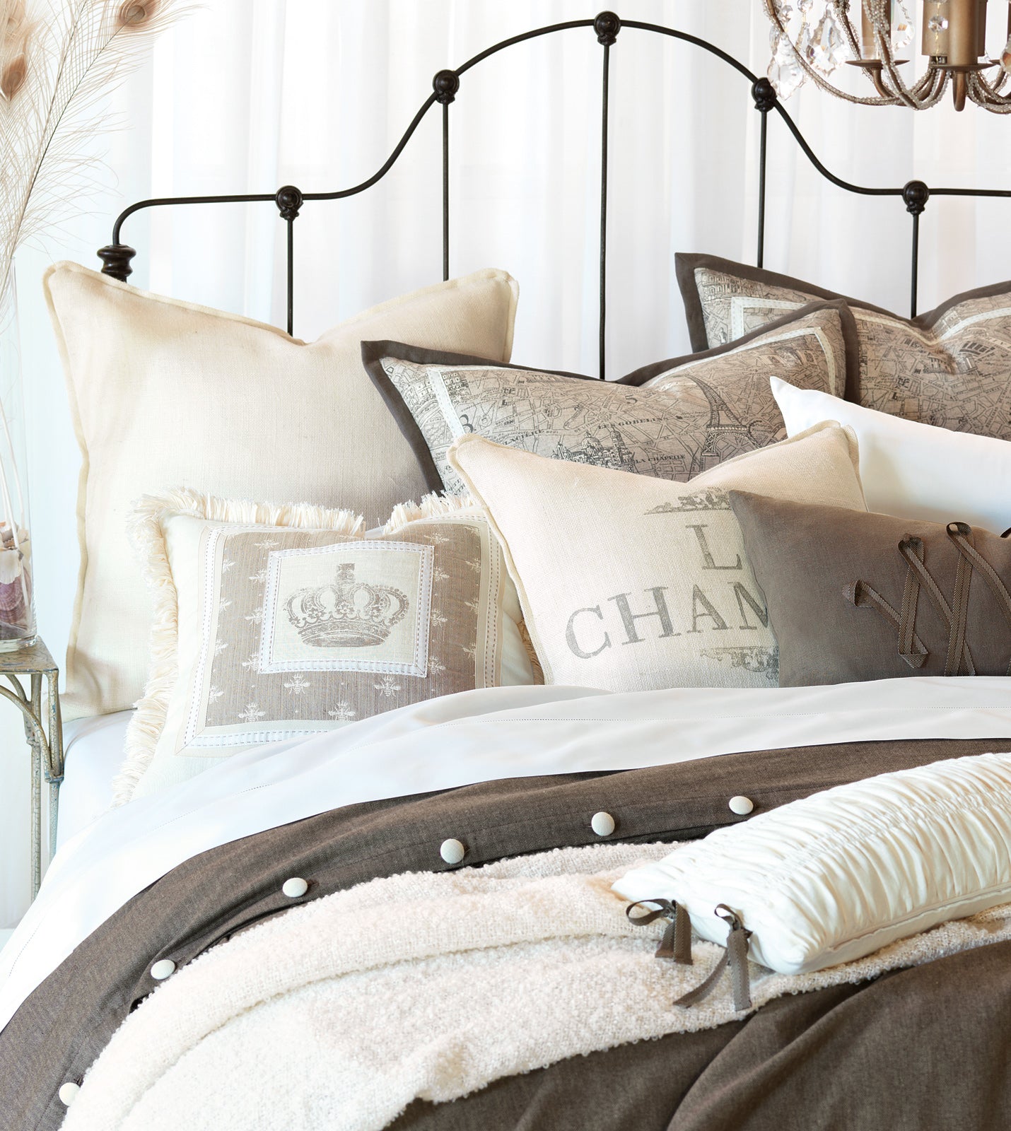 - 100% linen decorative pillow in a solid earth-toned fabric with a twisted ribbon trim applique